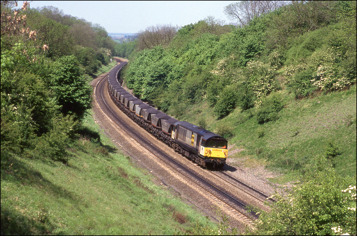 Class 58s were diagrammed for the Avon binliner from Calvert to Bath and Bristol in 1996. 58041 is pictured here at Water Eaton Farm near Islip with the returning empty containers on 4 April 1996. This was a bridge on a private road to the farm