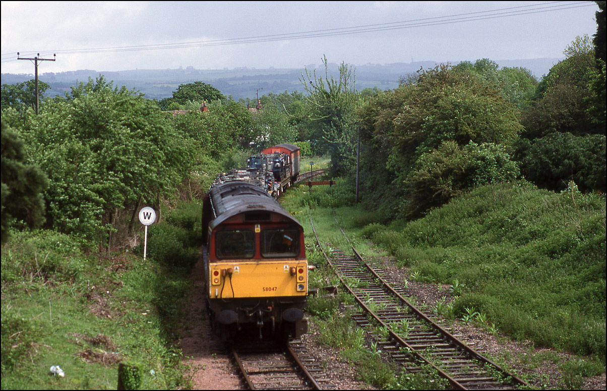 Towards the end of it's working life 58047 did some of Didcot's trip workings and on one occasion 23 May 2002, I was given a tip-off in plenty of time to drive over to Ashchurch to photograph it on the daily(ish) MOD service. The first shot shows it running north towards