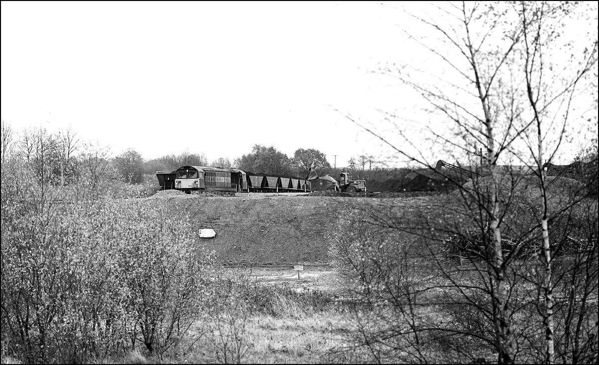 After photographing 58001 at Drakelow, it seemed sensible to drive up to the Nadins Disposal Point and have another go at it. The coal from the opencast site arrived at this point on the covered conveyor system running alongside the line and up to the loading hopper. One really needed a 300mm lens for this shot from the main road, but 200mm was the longest I had at the time. Still, I think the shot is acceptable as it shows the 58 about to