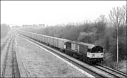 This is the view looking the other way from the shot above in January 1991 and shows 58002 passing under Oxley viaduct with an empty MGR from Ironbridge Power Station going back to one of the Stafforshire collieries. I recall taking a shot of a pair of class 20s here on the same day