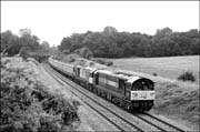 This shot is of 58001 passing the triangular junctions at Drakelow on the Coalville freight line. The train was photographed on 18 July 1996 as it was heading for the Nadins opencast disposal site situated a short distance to the north. The overgrown nature of the tracks leading