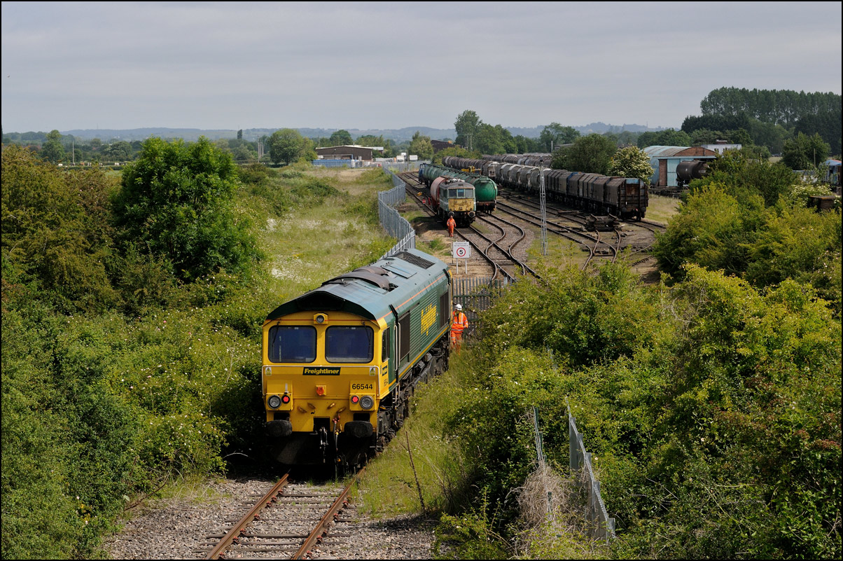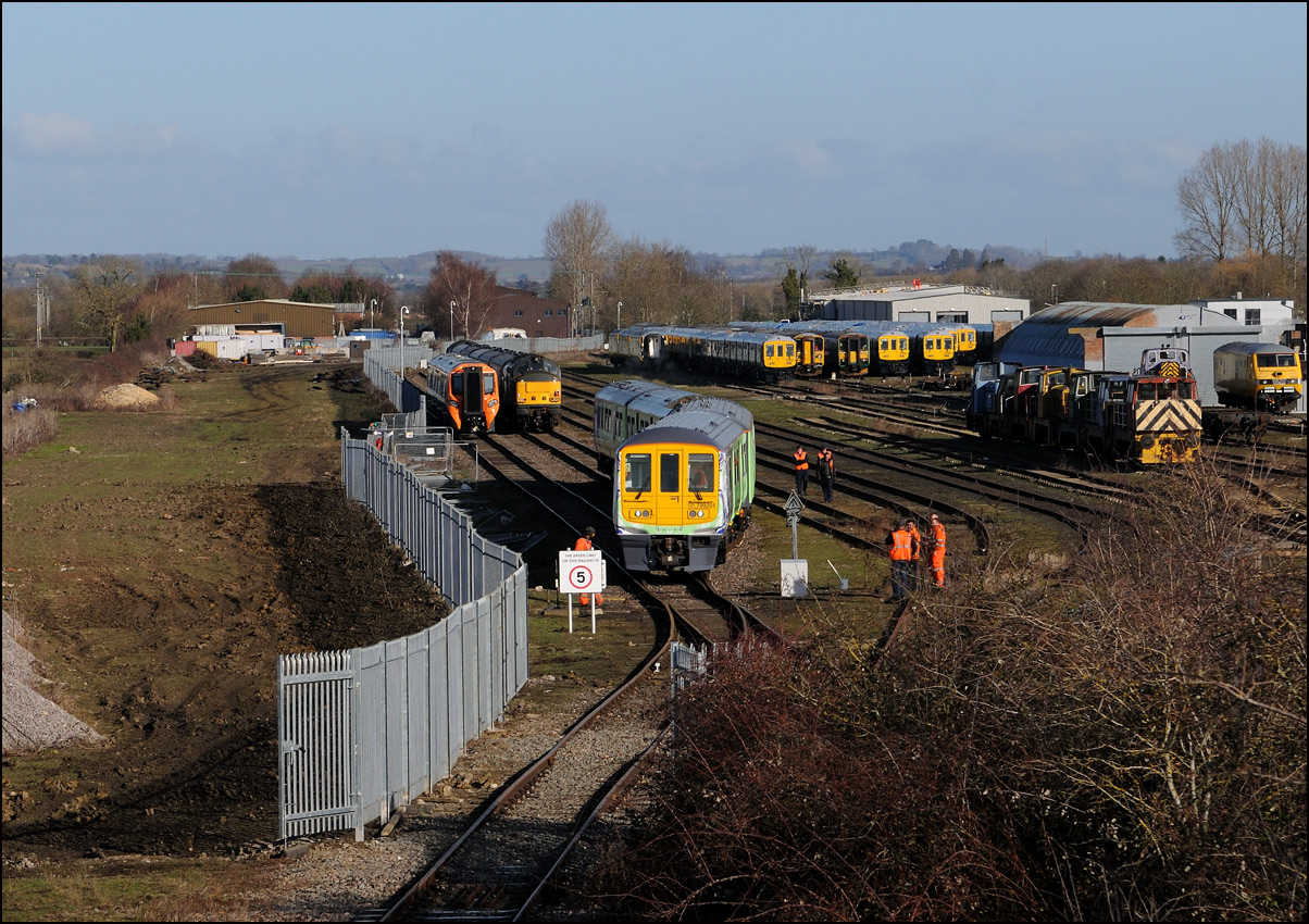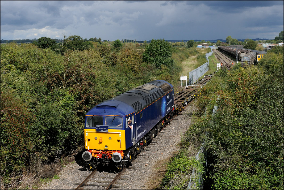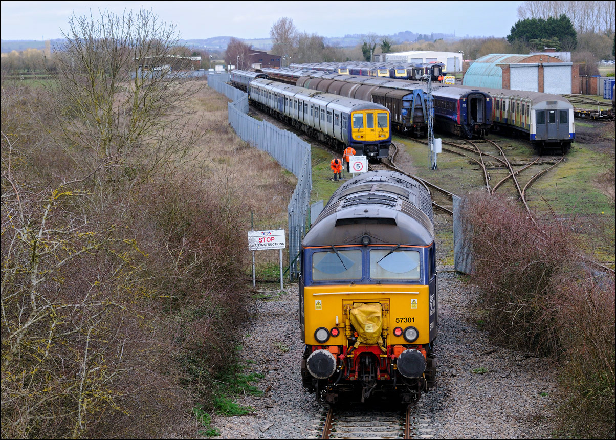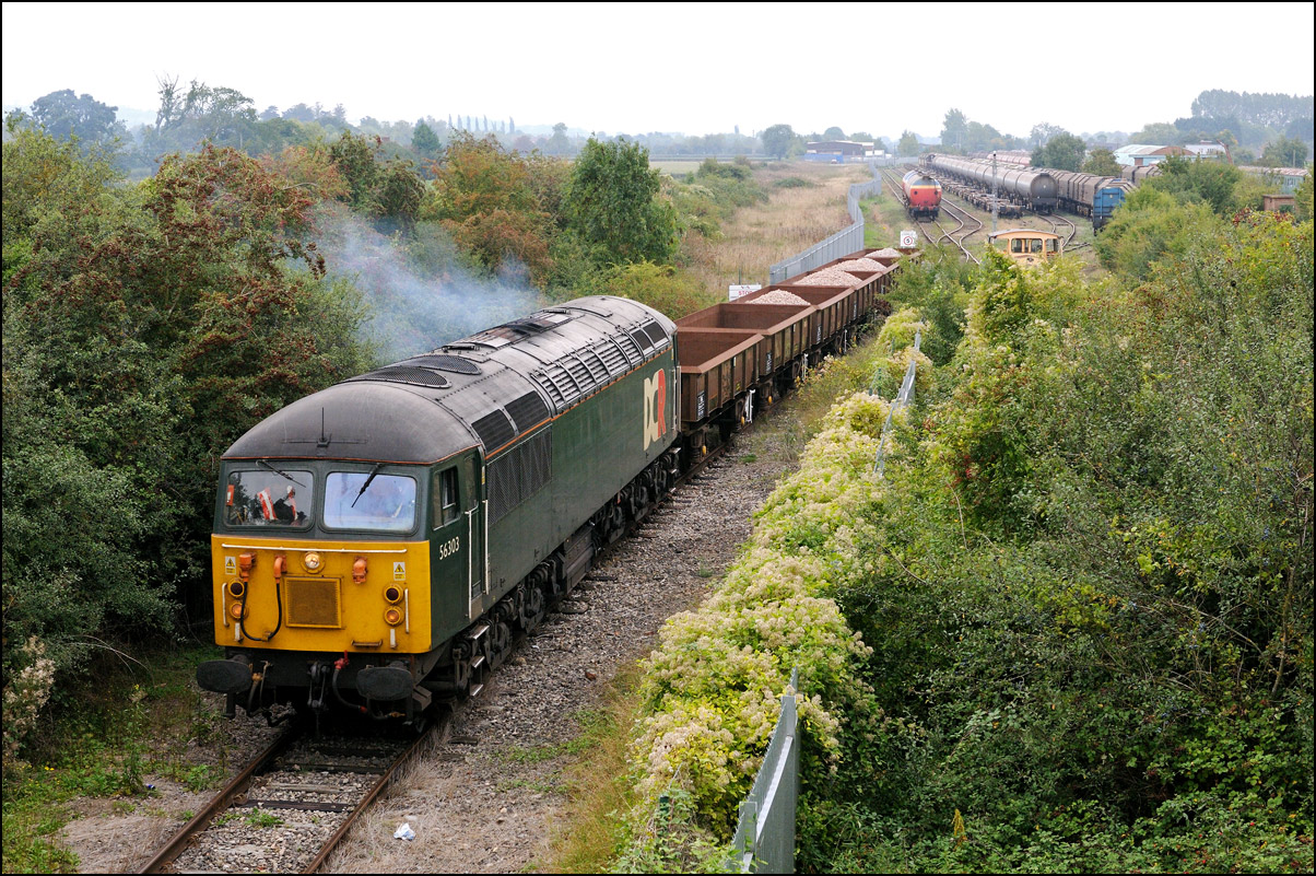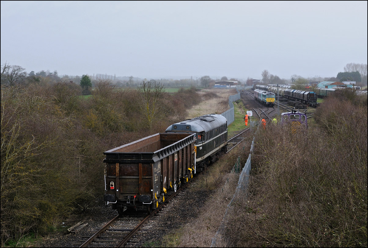The departure of 20096+20905 was slightly delayed while one of the operatives from the site fetched and fitted a point clip to the switch leading from the exchange sidings to the main line. This did not take long, and the locos are sen here leaving the site for the run back to Gloucester. Bearing in mind the poor state of the track and the branch being low on Network Rail's priority list, I wouldn't be surprised to see these lighter locomotives used on trains to this location more regularly. The shunting locomotive can just be made out as it approached the newly-arrived stock in the sidings. |