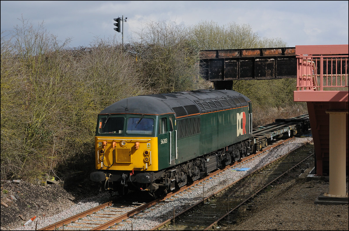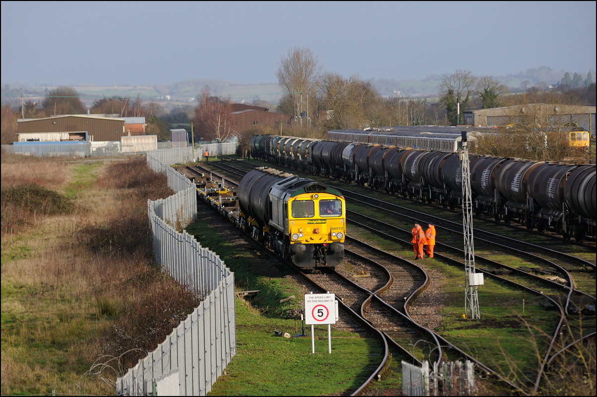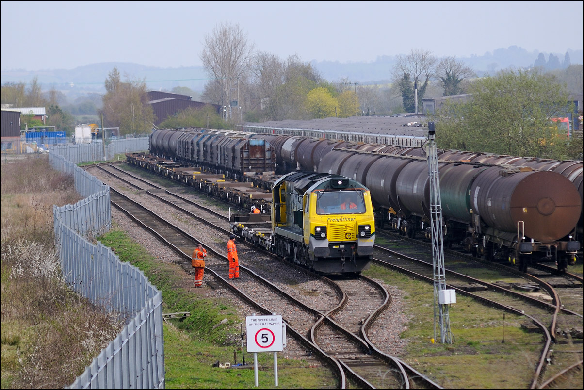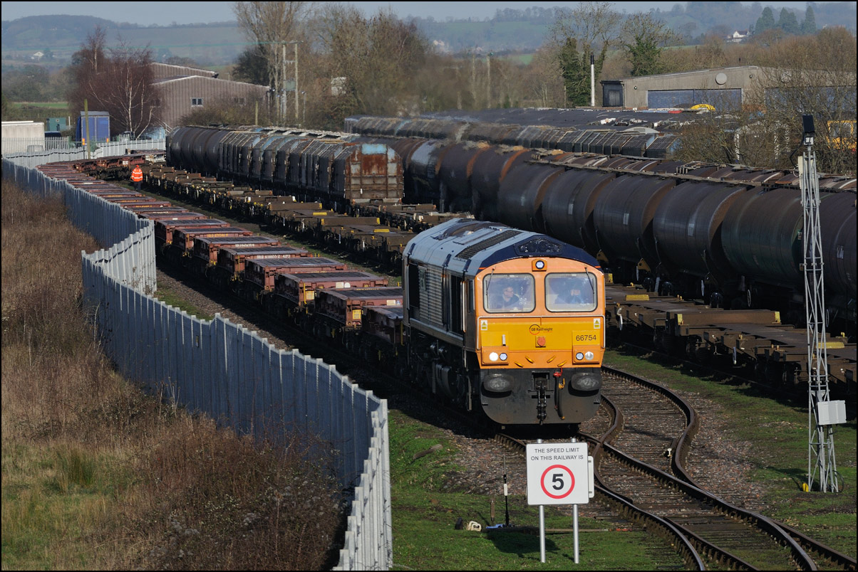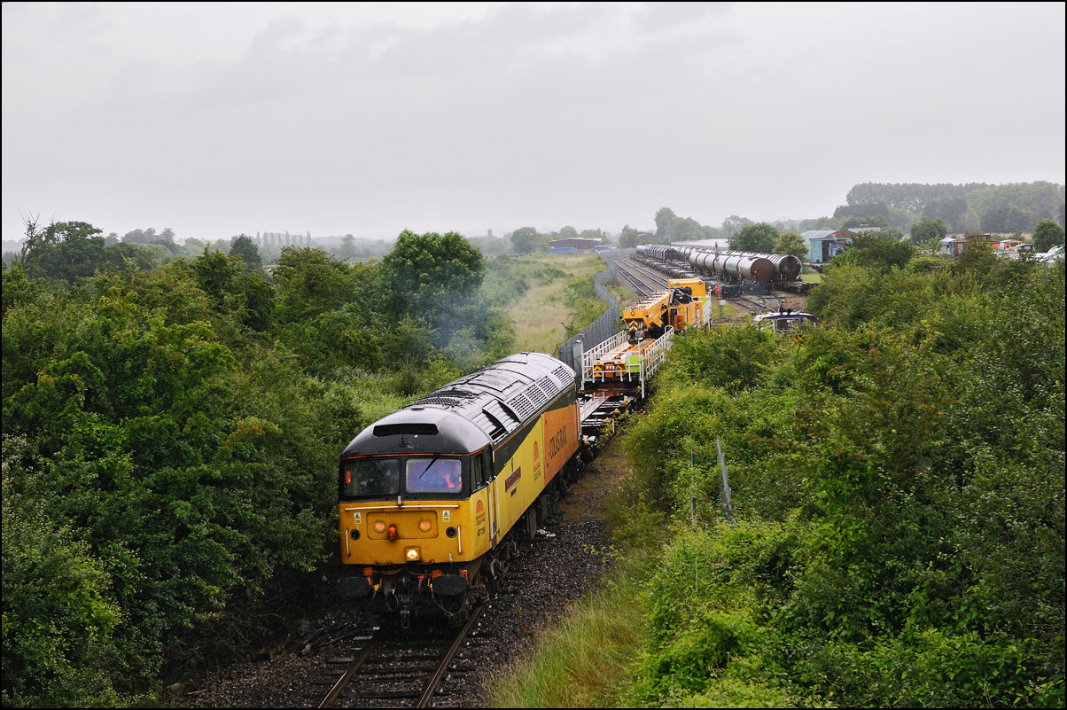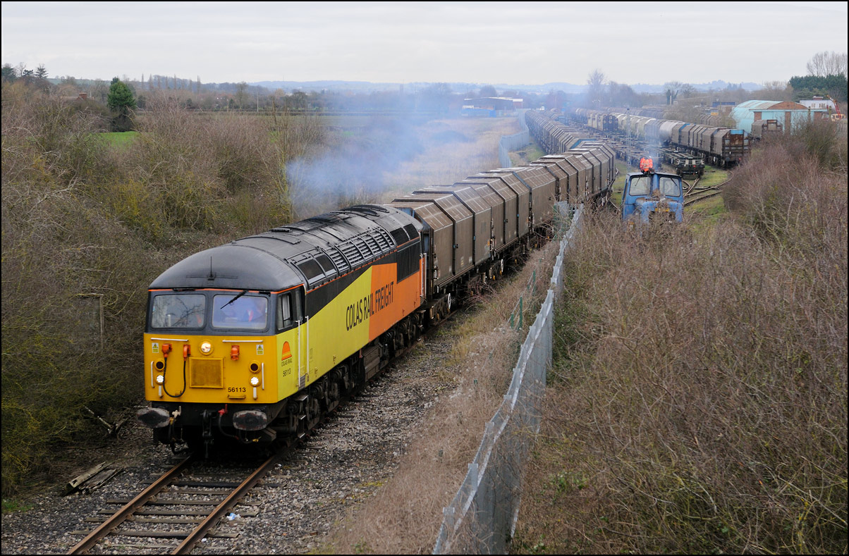 The departure of 20096+20905 was slightly delayed while one of the operatives from the site fetched and fitted a point clip to the switch leading from the exchange sidings to the main line. This did not take long, and the locos are sen here leaving the site for the run back to Gloucester. Bearing in mind the poor state of the track and the branch being low on Network Rail's priority list, I wouldn't be surprised to see these lighter locomotives used on trains to this location more regularly. The shunting locomotive can just be made out as it approached the newly-arrived stock in the sidings. |