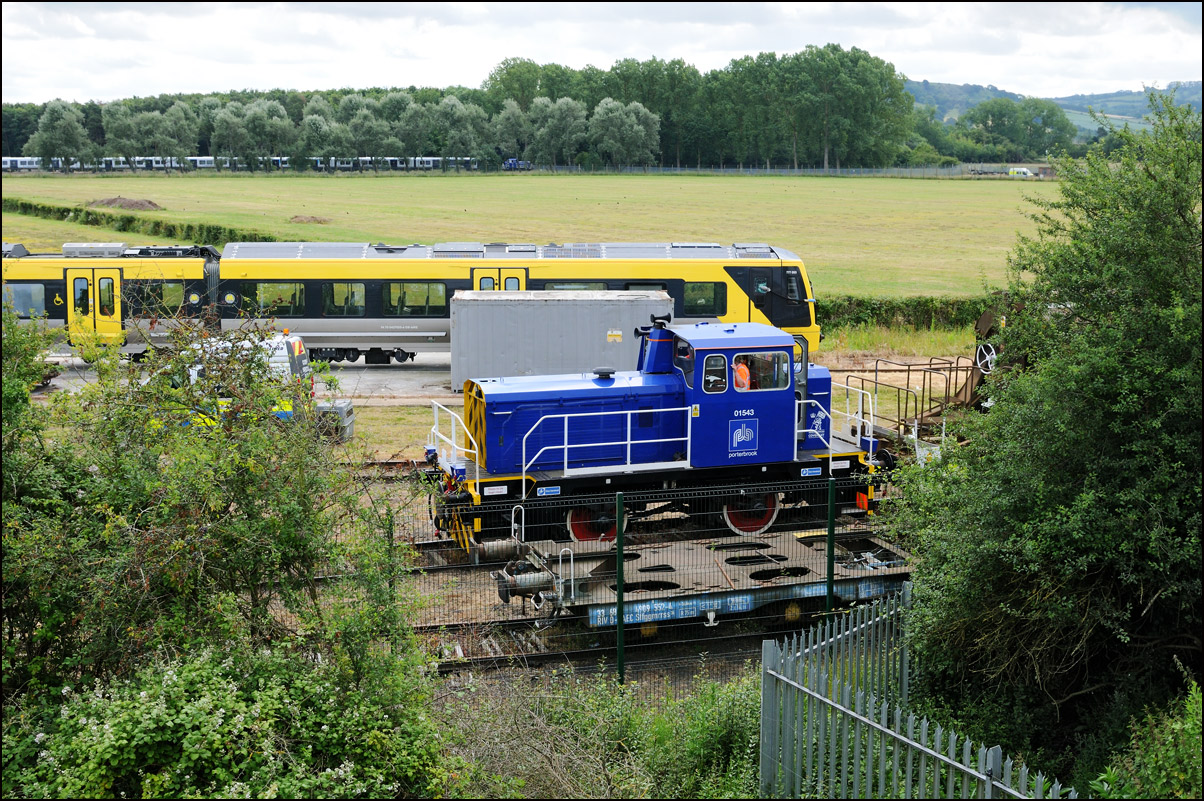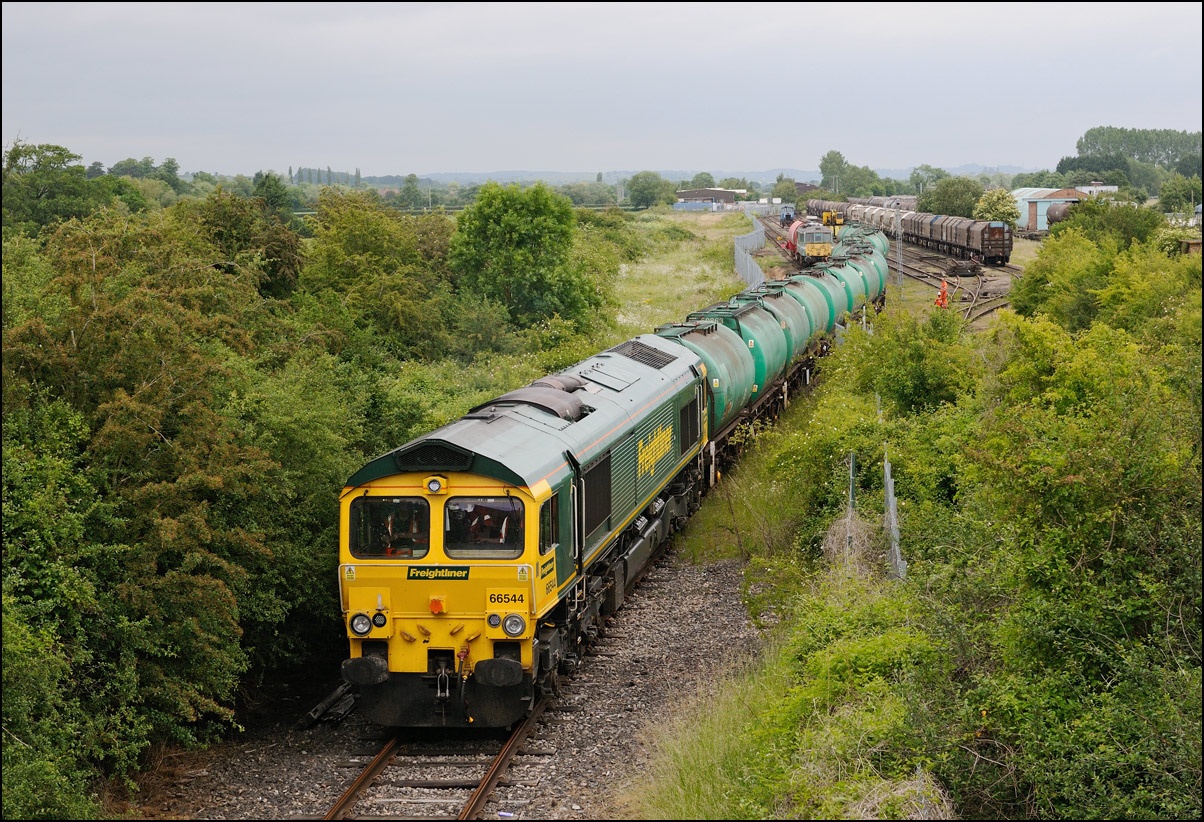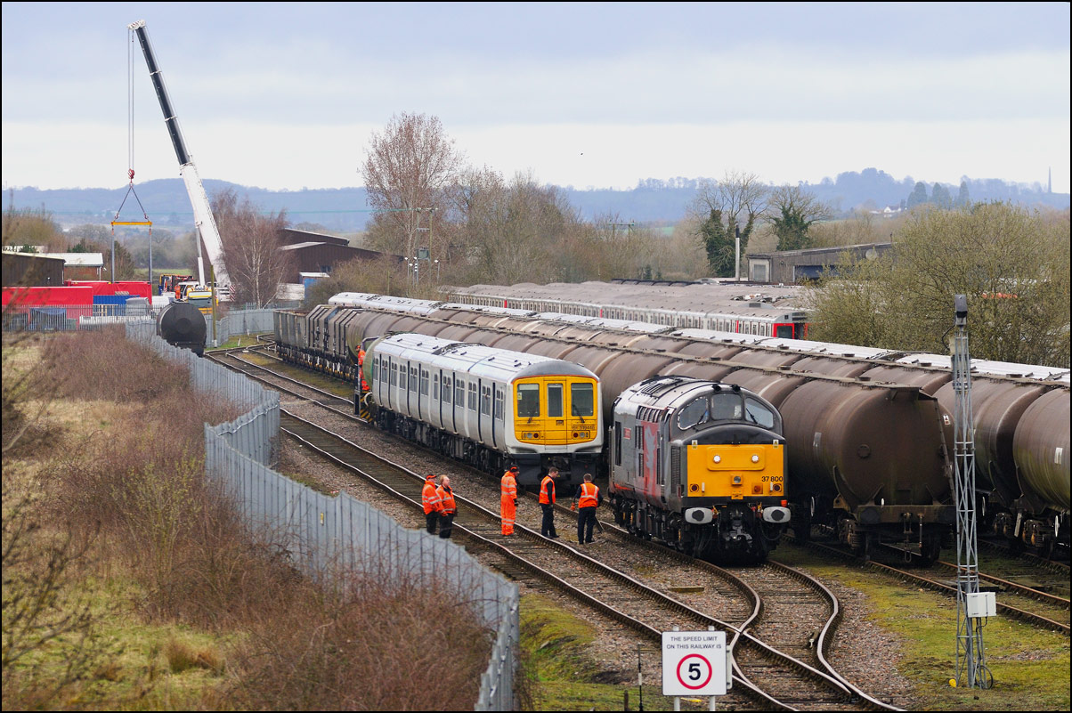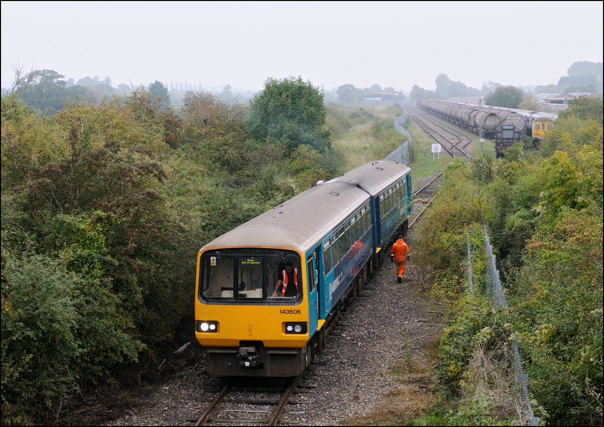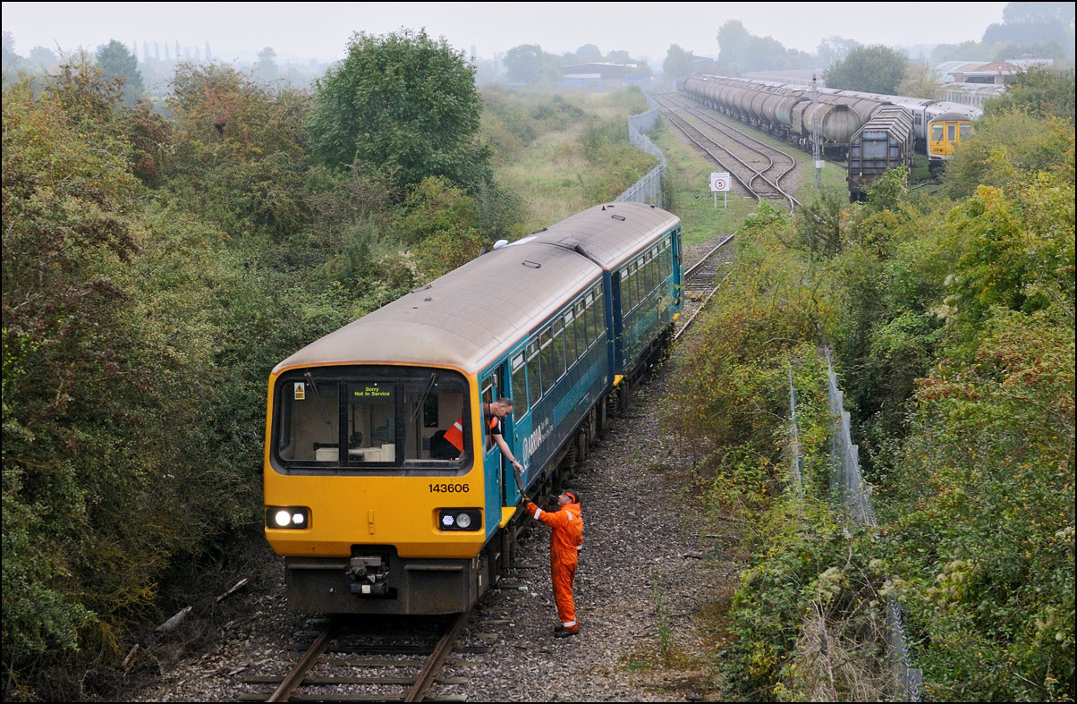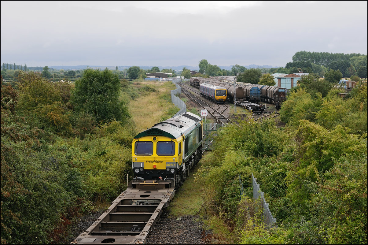 The departure of 20096+20905 was slightly delayed while one of the operatives from the site fetched and fitted a point clip to the switch leading from the exchange sidings to the main line. This did not take long, and the locos are sen here leaving the site for the run back to Gloucester. Bearing in mind the poor state of the track and the branch being low on Network Rail's priority list, I wouldn't be surprised to see these lighter locomotives used on trains to this location more regularly. The shunting locomotive can just be made out as it approached the newly-arrived stock in the sidings. |