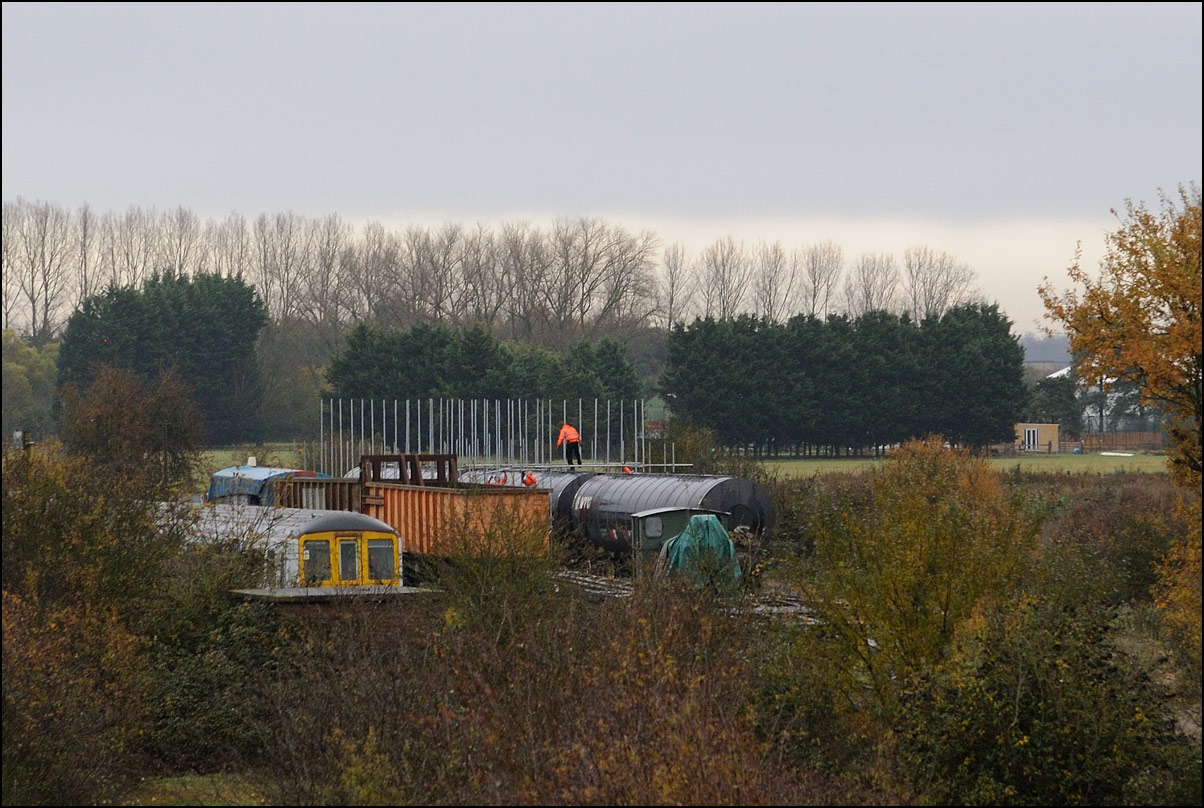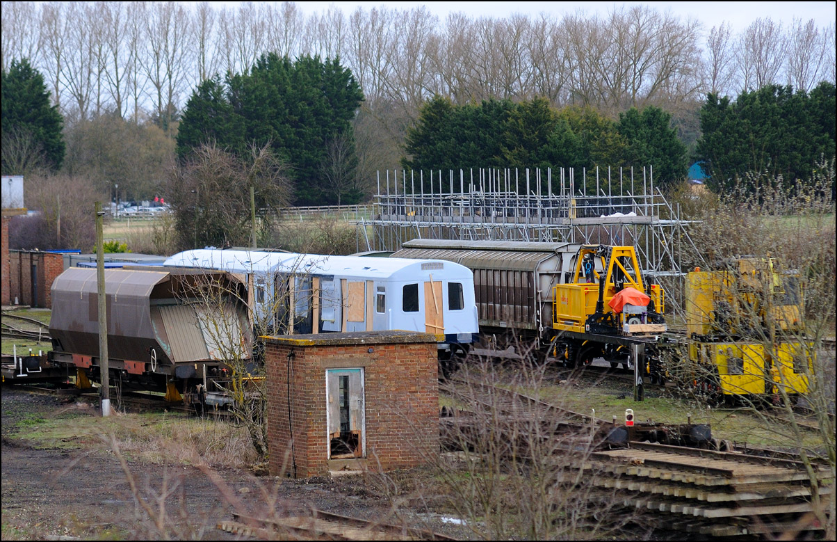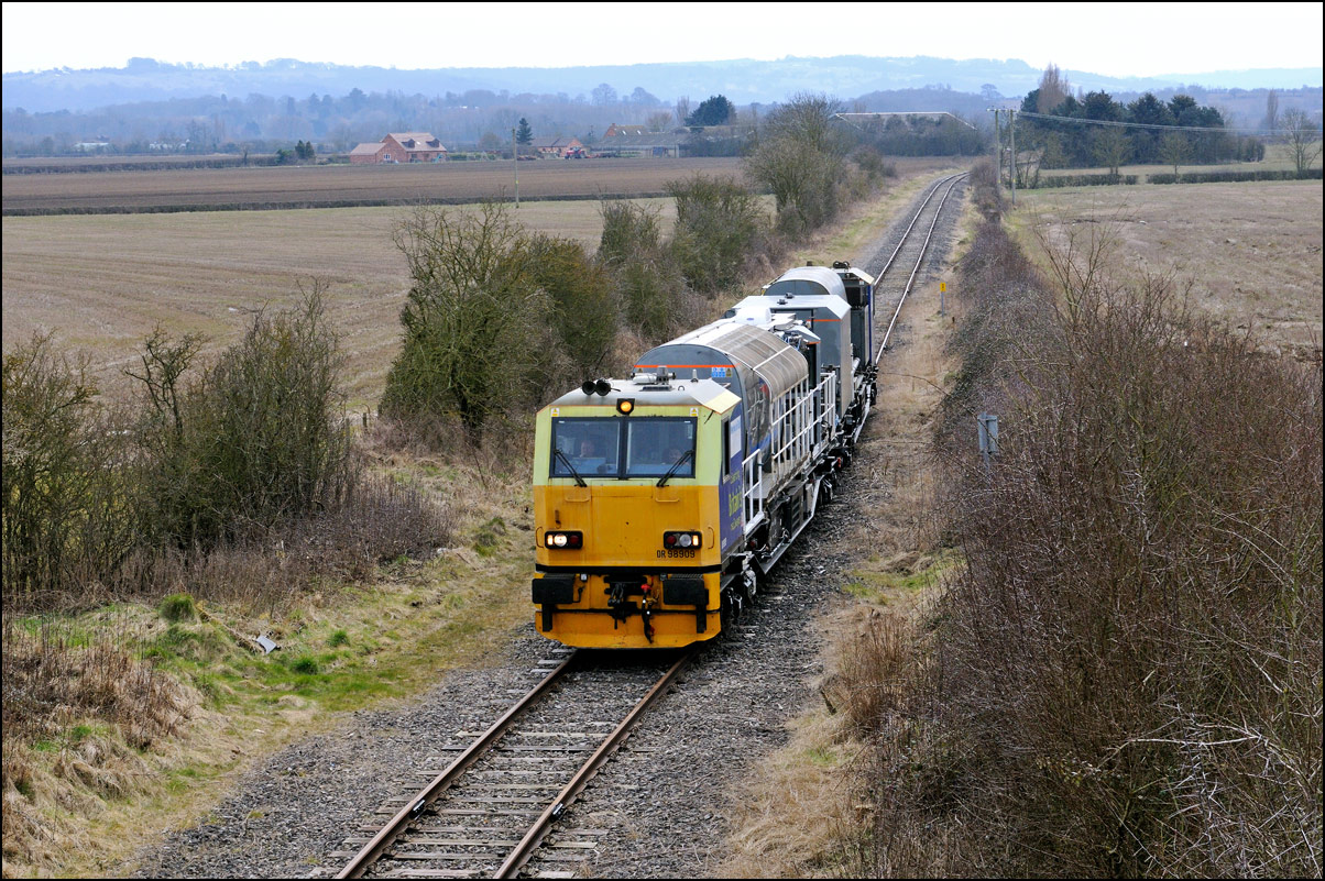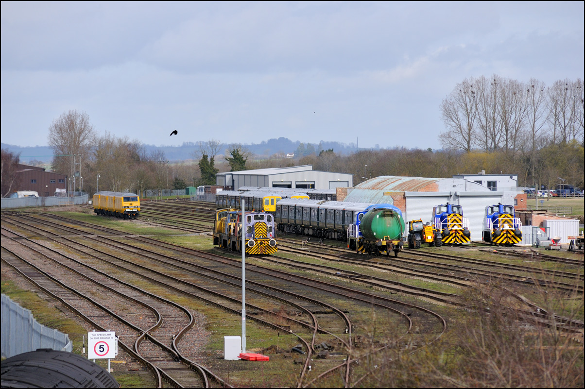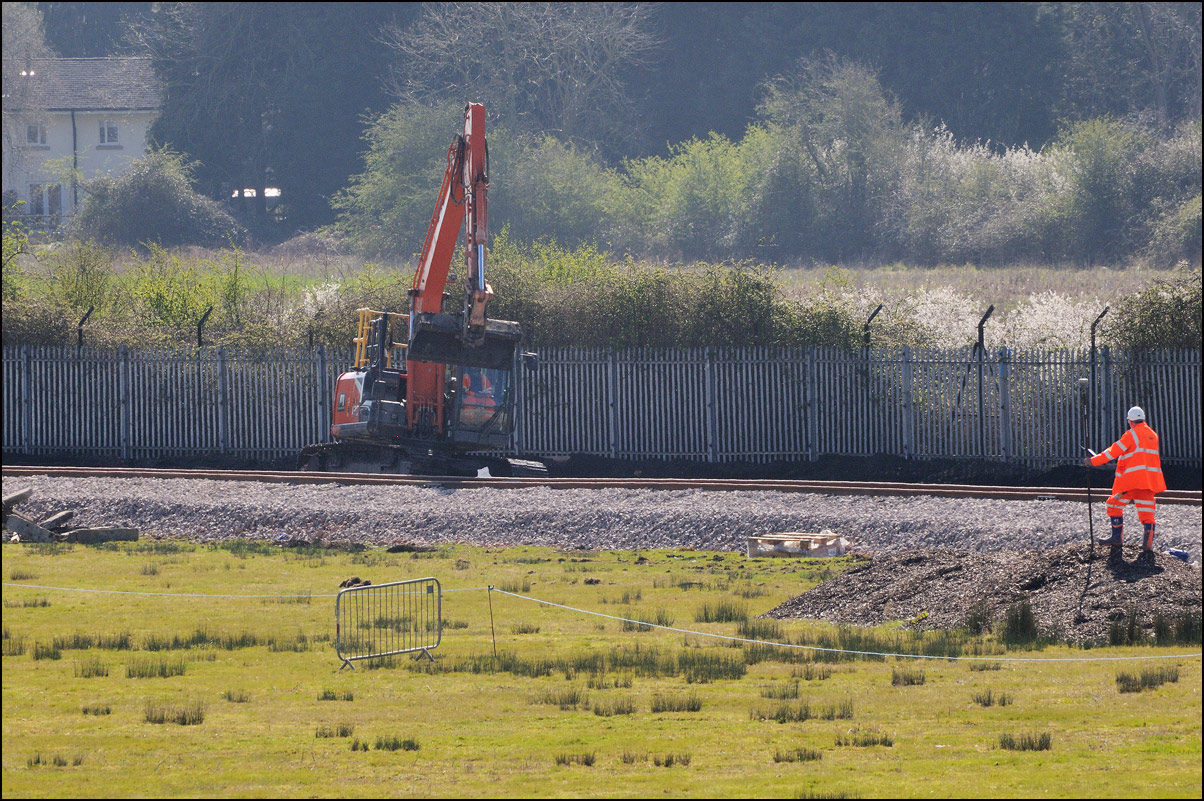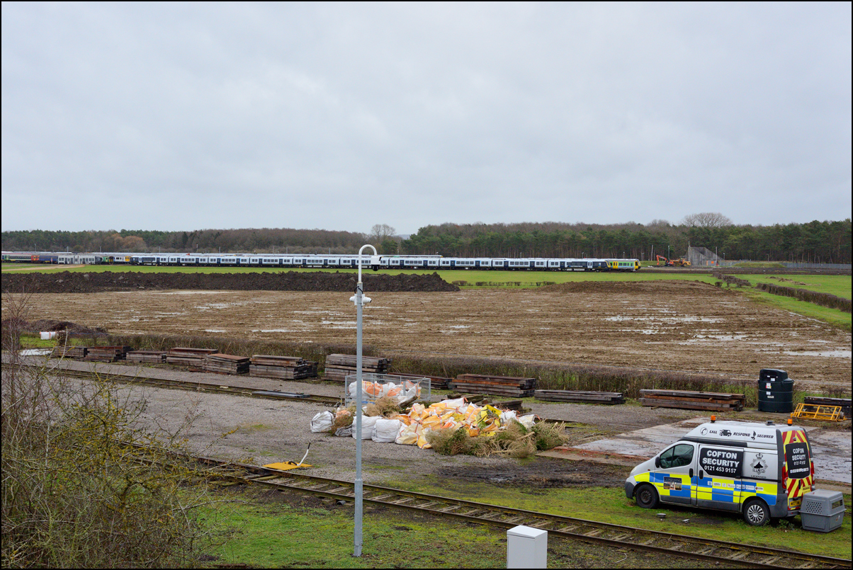 It took longer than expected for 5Q99 to reach Long Marston from Honeybourne giving me time to take a few pictures of some changes around the site. The major change is the clearance and building up of a field in preparation for the installation of solar panels to help power the planned 25kv infrastructure for the testing of new trains by Porterbrook. This pair of vehicles was parked on the curve alongside on of several security points scattered around the place. The shot also gave the chance to try out a new VR lens I have just acquired... |