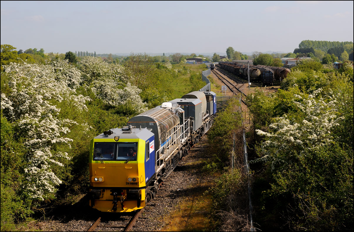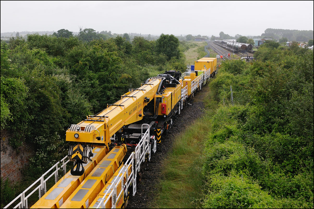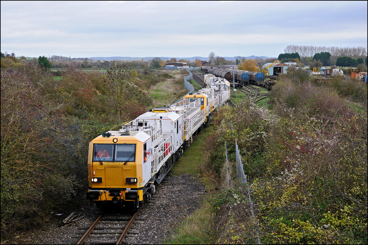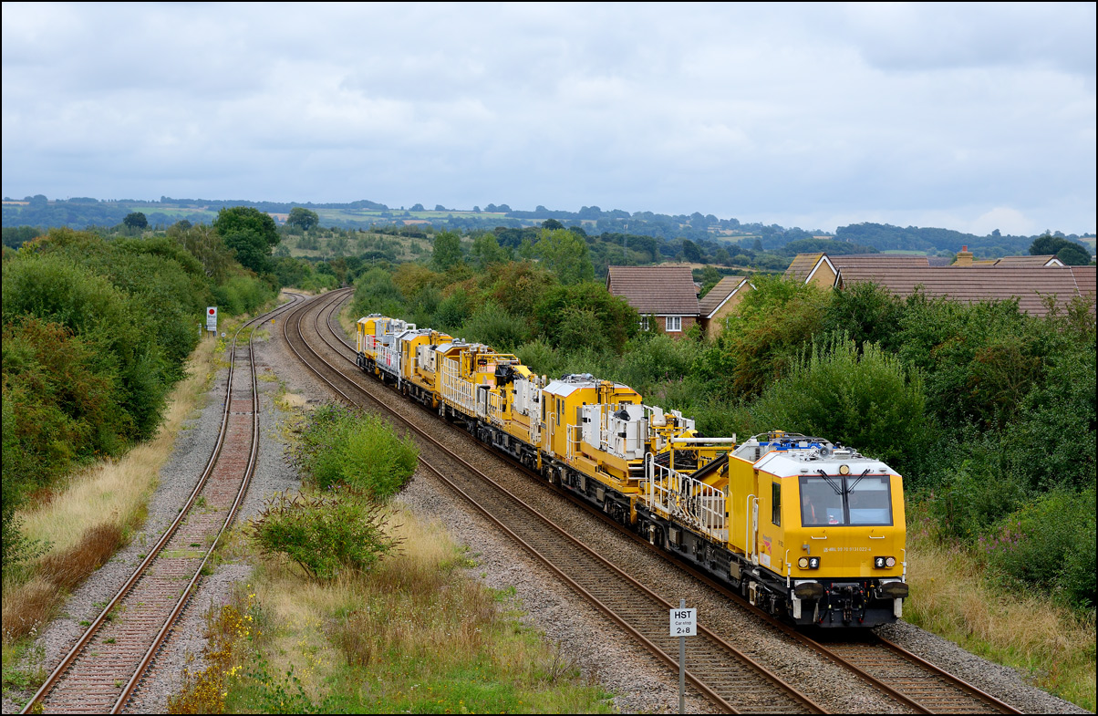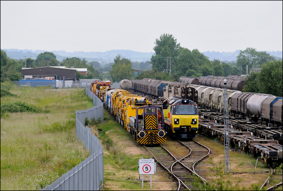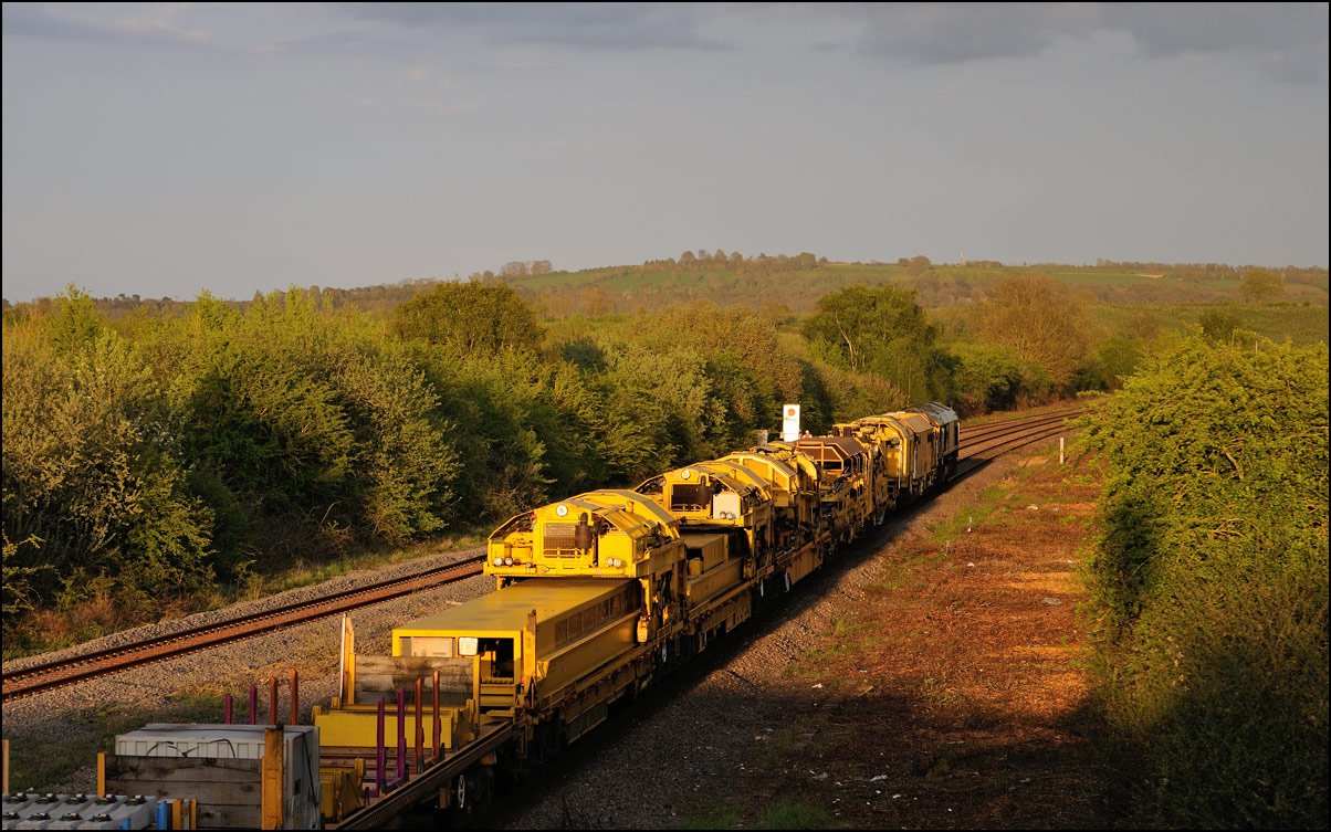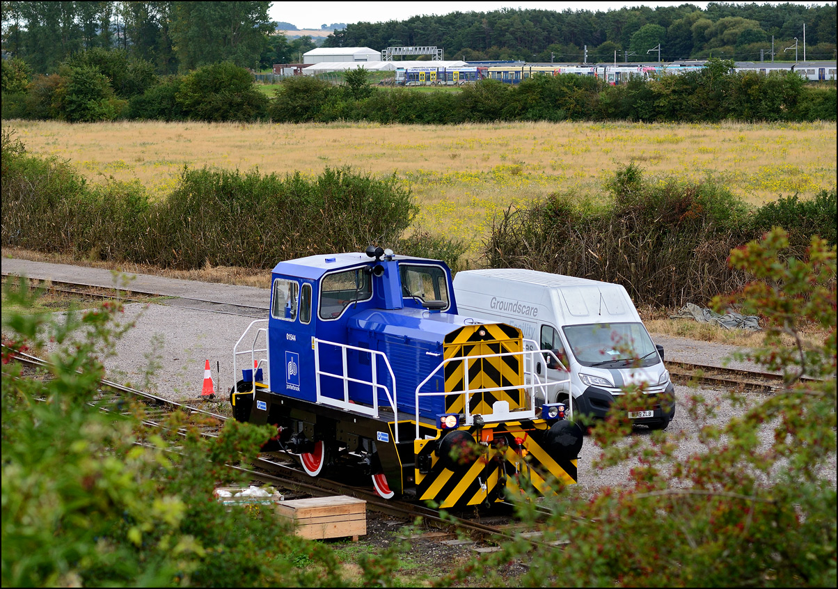 It took longer than expected for 5Q99 to reach Long Marston from Honeybourne giving me time to take a few pictures of some changes around the site. The major change is the clearance and building up of a field in preparation for the installation of solar panels to help power the planned 25kv infrastructure for the testing of new trains by Porterbrook. This pair of vehicles was parked on the curve alongside on of several security points scattered around the place. The shot also gave the chance to try out a new VR lens I have just acquired... |