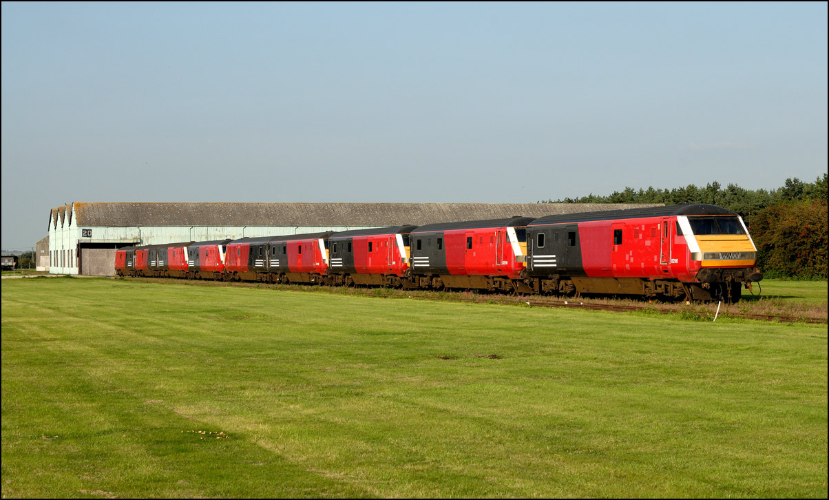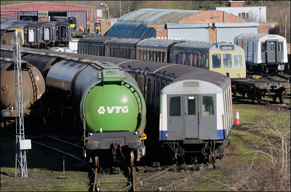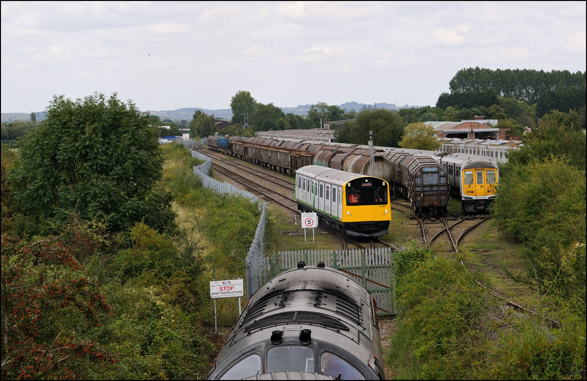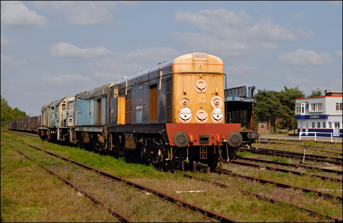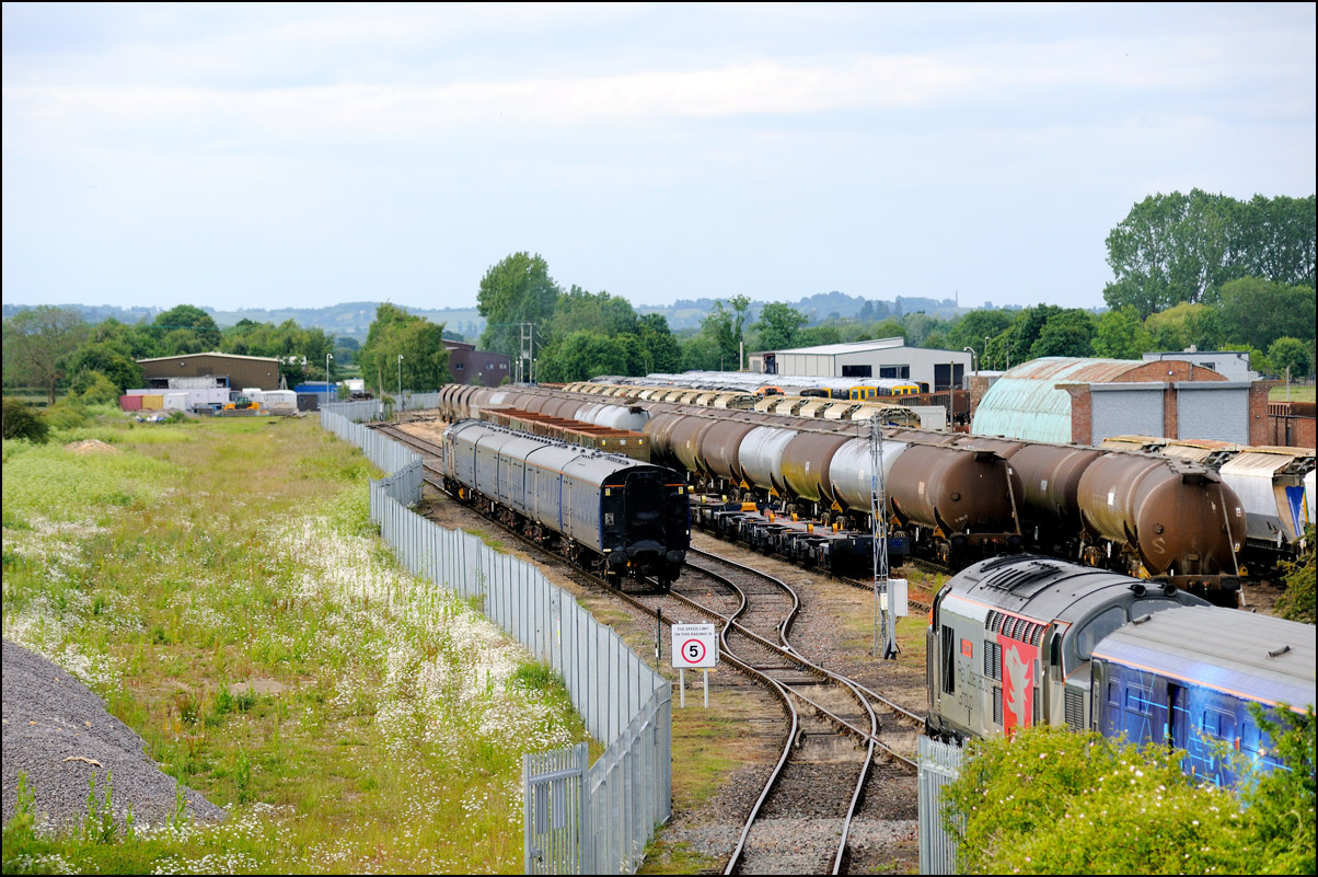 There are now many stored former main line locomotives at Long Marston. Because the Open Day involved the running lines being used by a passenger train, it was, quite understandably, not possible to wander around the site at will to photograph these. However, DRS liveried 20902 was just about in a photographable position between rakes of ICI tankers and cartics and it would have been unreasonable not to have taken a shot given the late summer sun being in a co-operative mood. |
