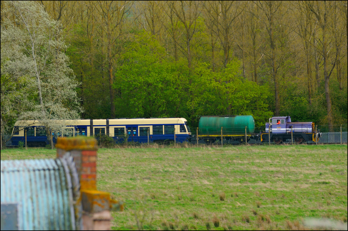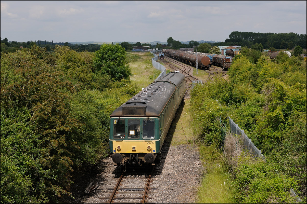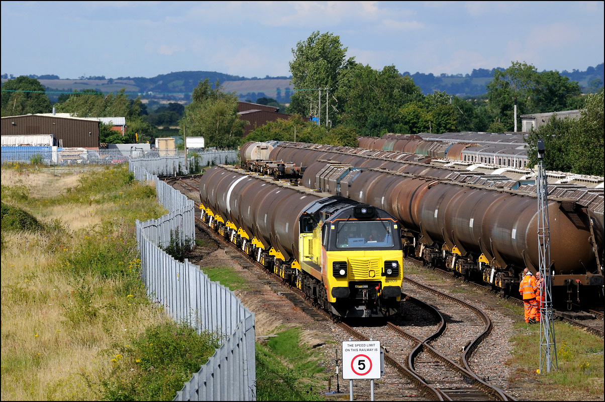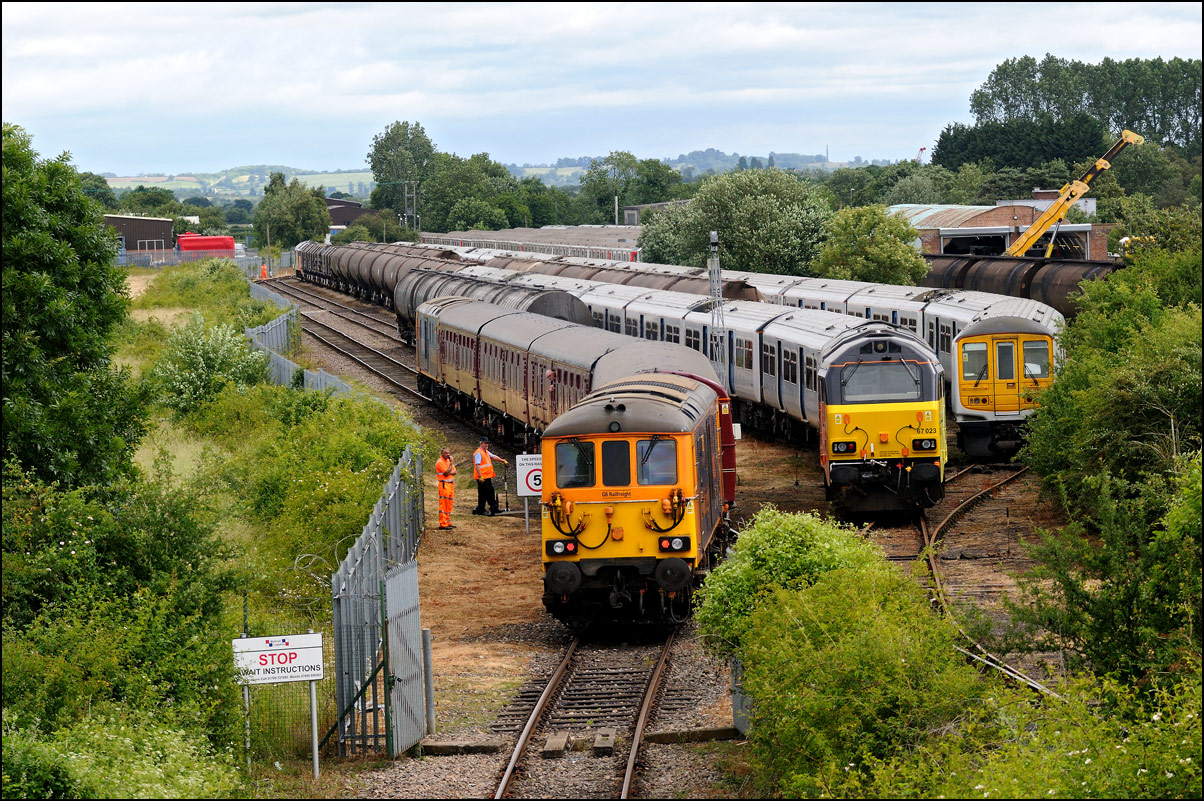 There are now many stored former main line locomotives at Long Marston. Because the Open Day involved the running lines being used by a passenger train, it was, quite understandably, not possible to wander around the site at will to photograph these. However, DRS liveried 20902 was just about in a photographable position between rakes of ICI tankers and cartics and it would have been unreasonable not to have taken a shot given the late summer sun being in a co-operative mood. |