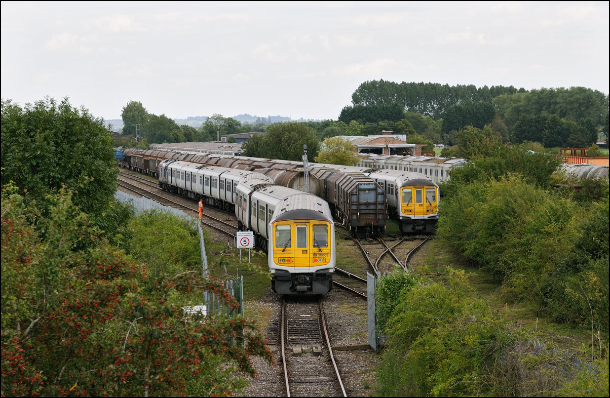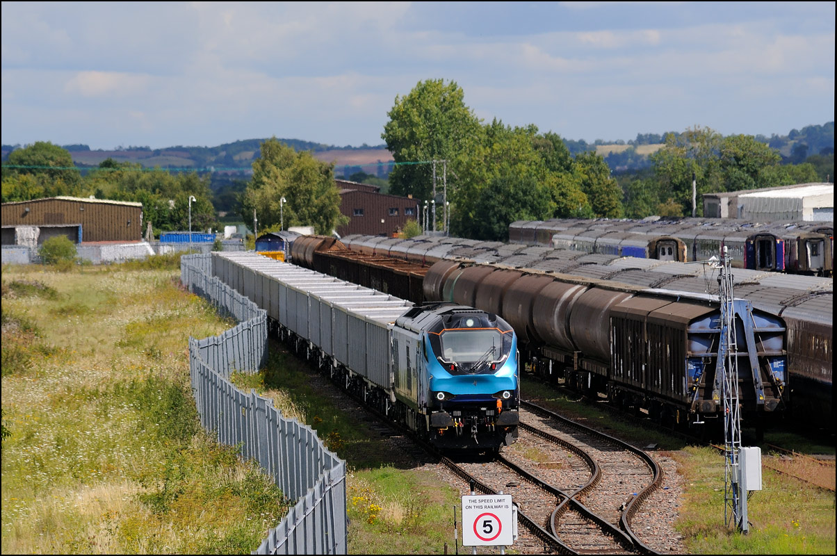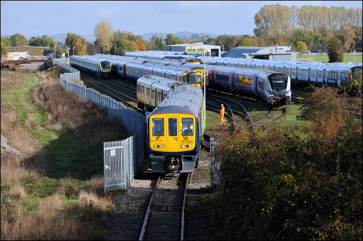 An image from a couple of weeks ago which was still on my memory card. The Hydroflex unit, 799201, made another test run to Kidderminster and back on 23 October 2024 and I dropped onto the road bridge at the former on the way to a couple of farm shops in the area. There was a lot of shadow around and this picture was the best available as 5Q61 moved onto the branch to Honeybourne. Note the variety of stored stock in the sidings; just a small proportion of that stored all over the site. |