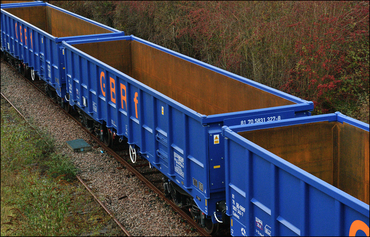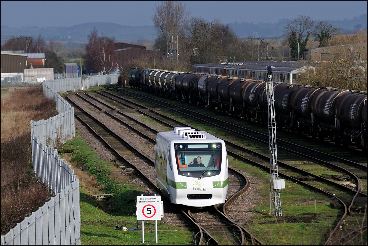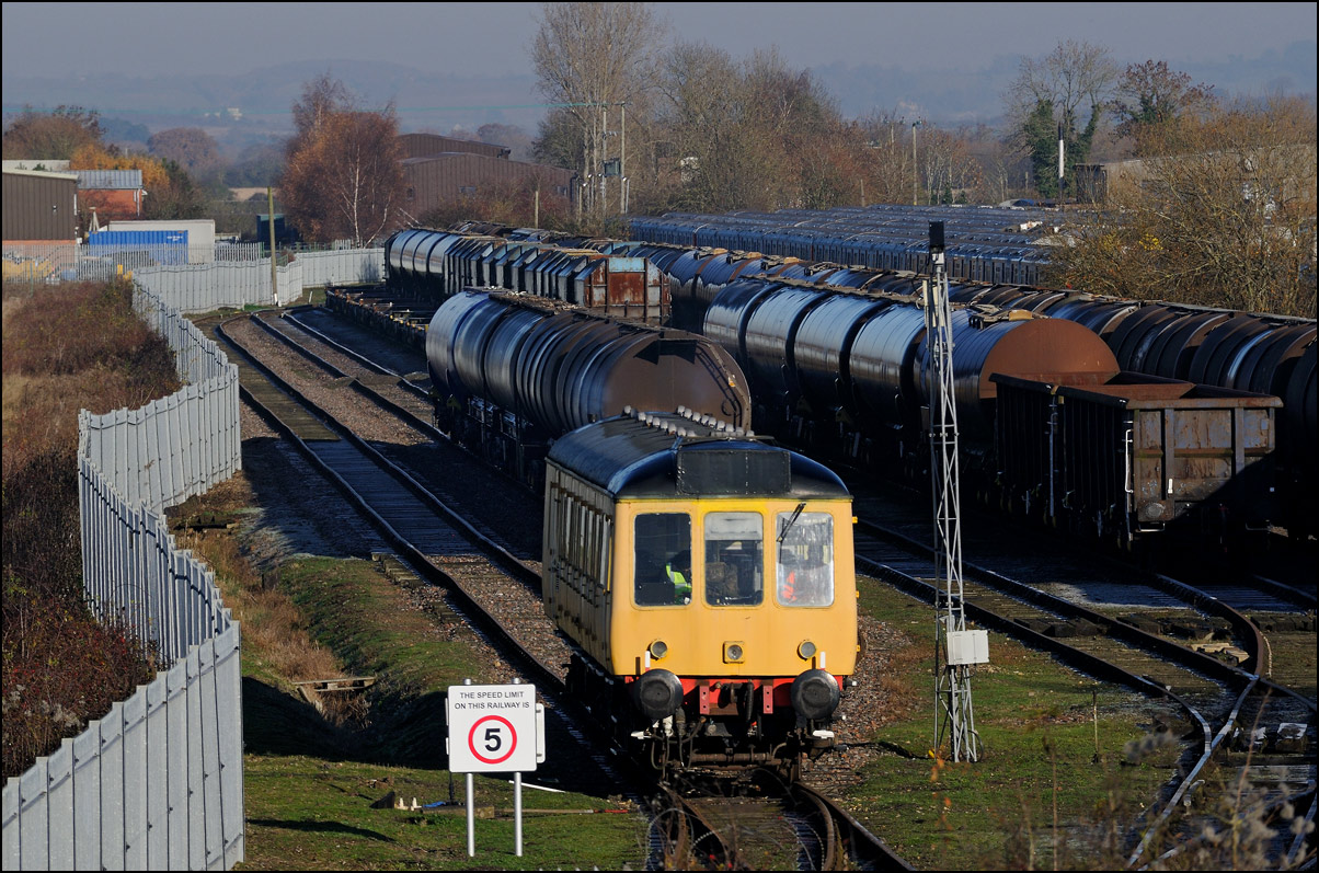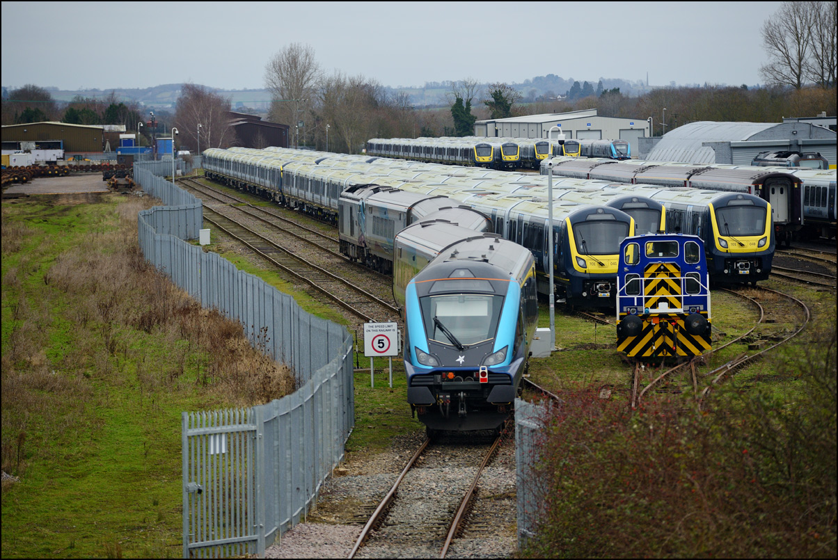 An image from a couple of weeks ago which was still on my memory card. The Hydroflex unit, 799201, made another test run to Kidderminster and back on 23 October 2024 and I dropped onto the road bridge at the former on the way to a couple of farm shops in the area. There was a lot of shadow around and this picture was the best available as 5Q61 moved onto the branch to Honeybourne. Note the variety of stored stock in the sidings; just a small proportion of that stored all over the site. |