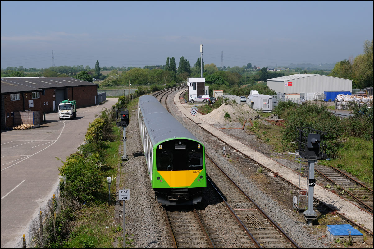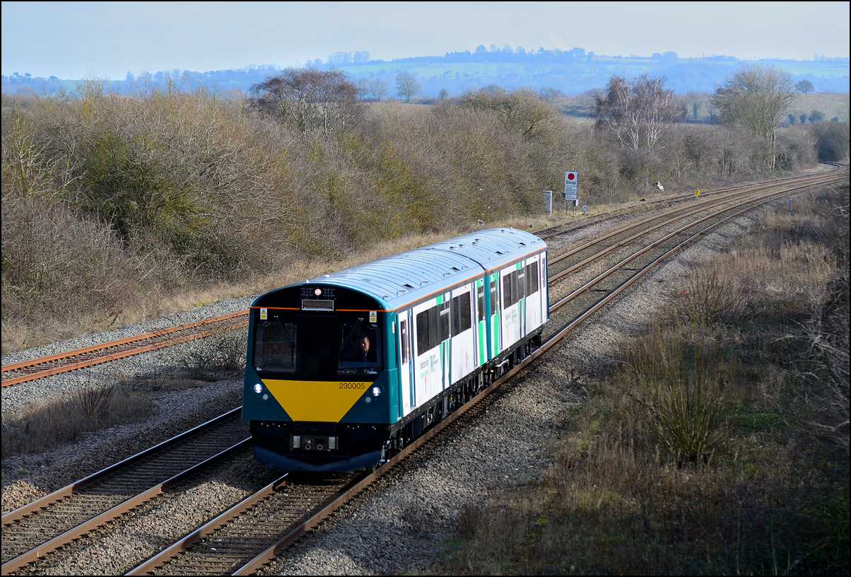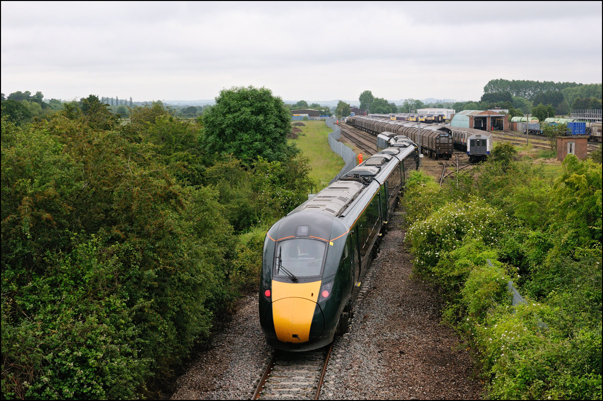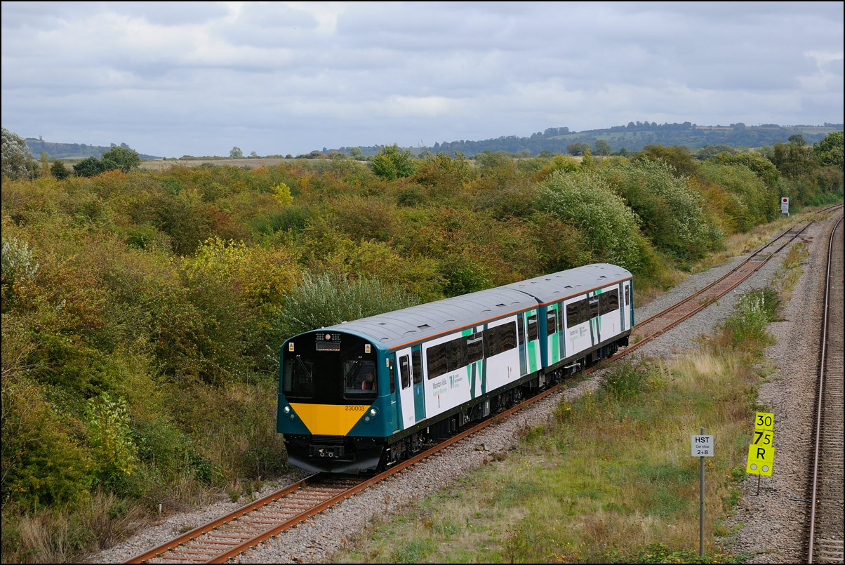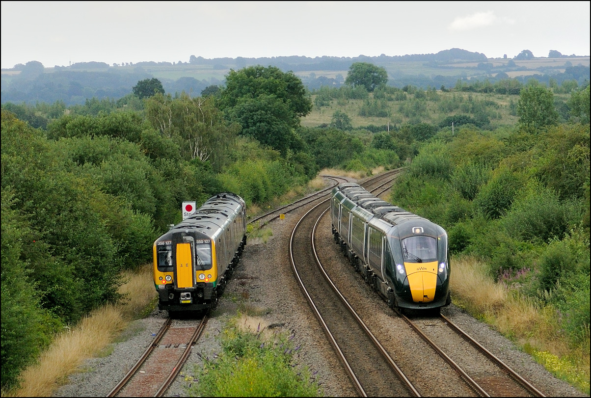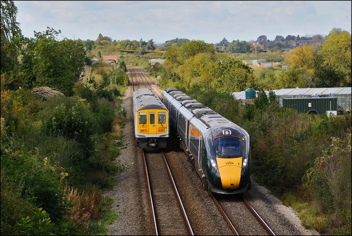 I walked from Moreton-in-Marsh station to the nearby roadbridge in the hope that 230001 would run as scheduled and make another trip up to Moreton. It did not report after leaving Honeybourne North Junction so I was pleased when it appeared and came to a stop at the starting signal just before 800022 arrived giving the chance for a shot of the strange bedfellows side-by-side. |