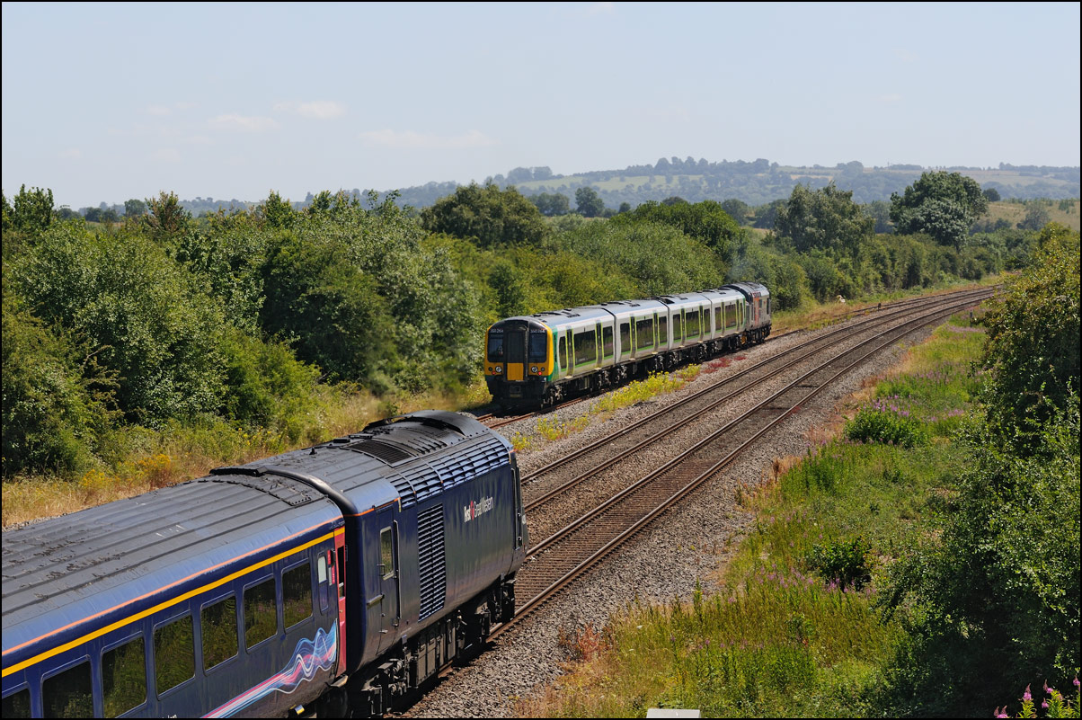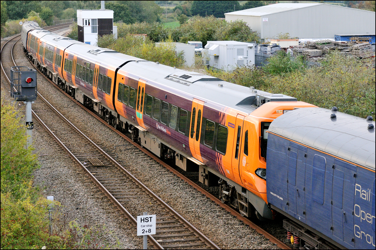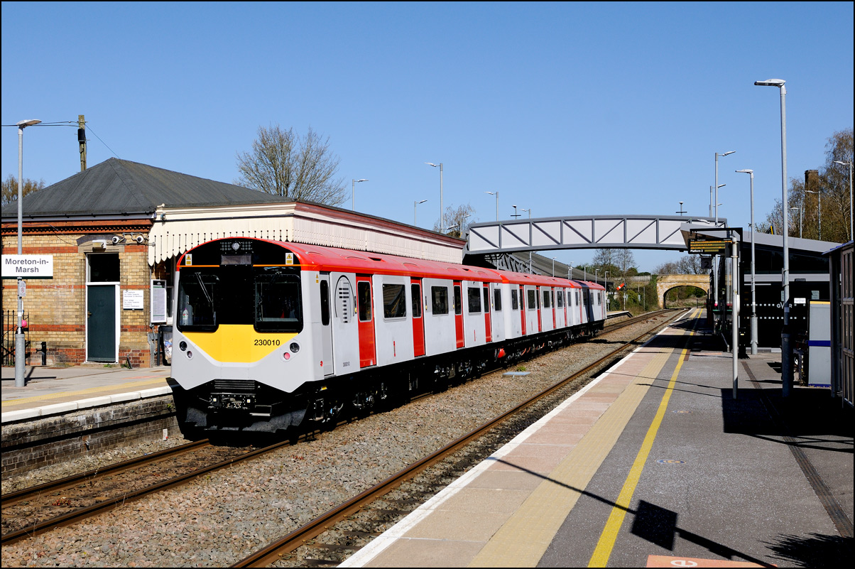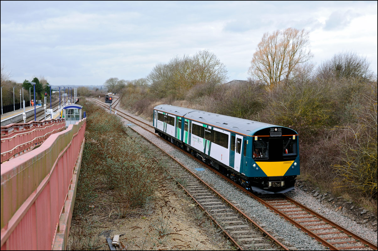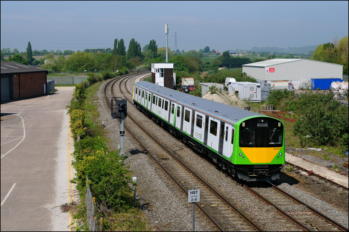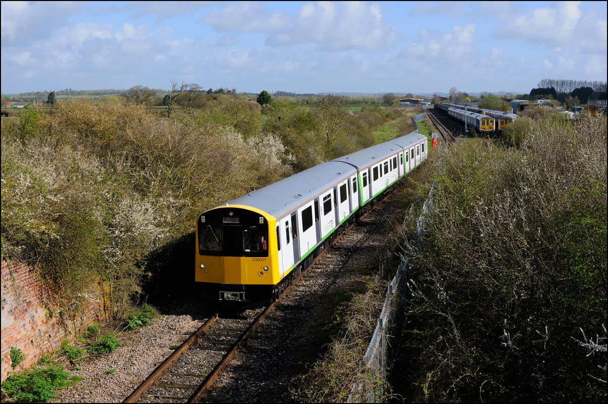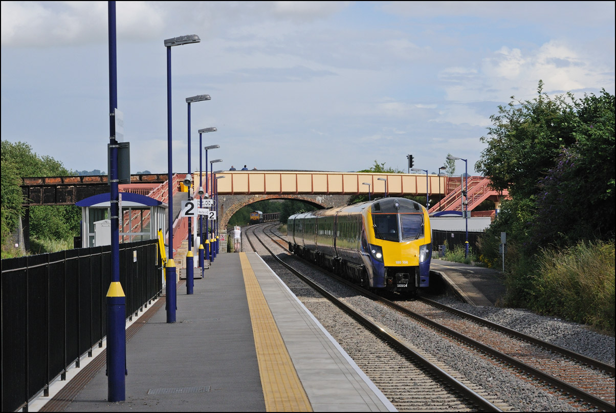 I walked from Moreton-in-Marsh station to the nearby roadbridge in the hope that 230001 would run as scheduled and make another trip up to Moreton. It did not report after leaving Honeybourne North Junction so I was pleased when it appeared and came to a stop at the starting signal just before 800022 arrived giving the chance for a shot of the strange bedfellows side-by-side. |