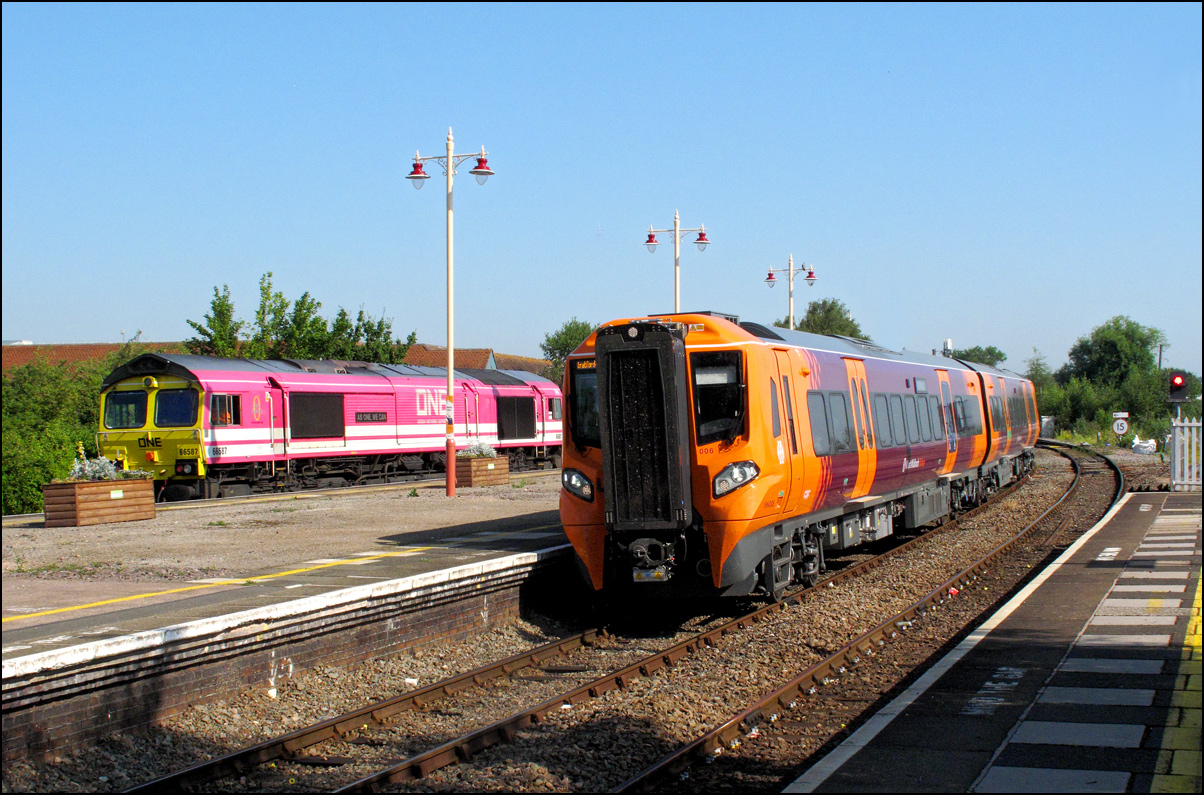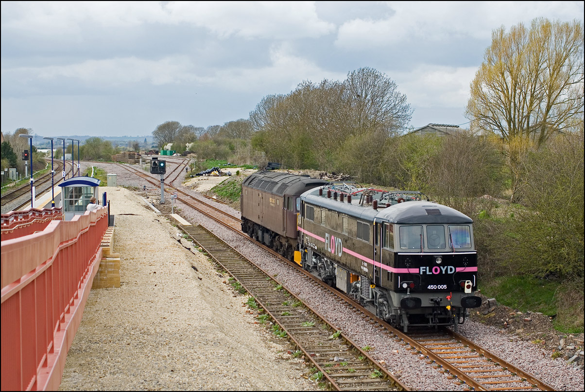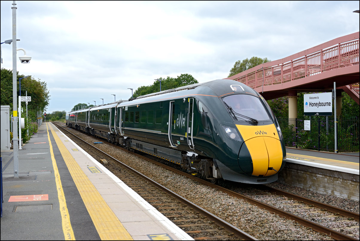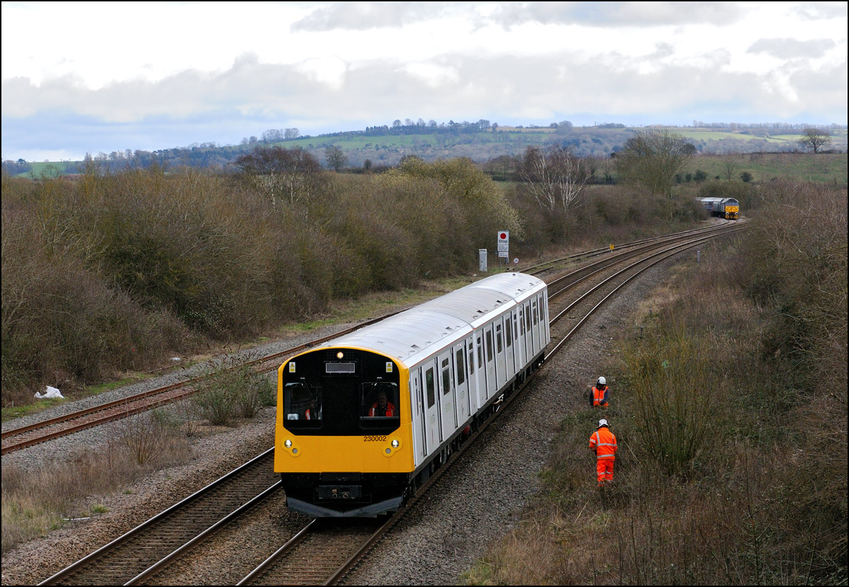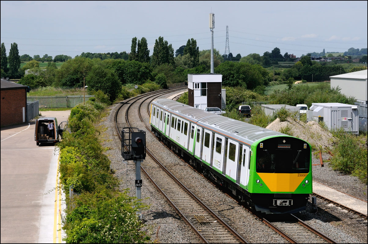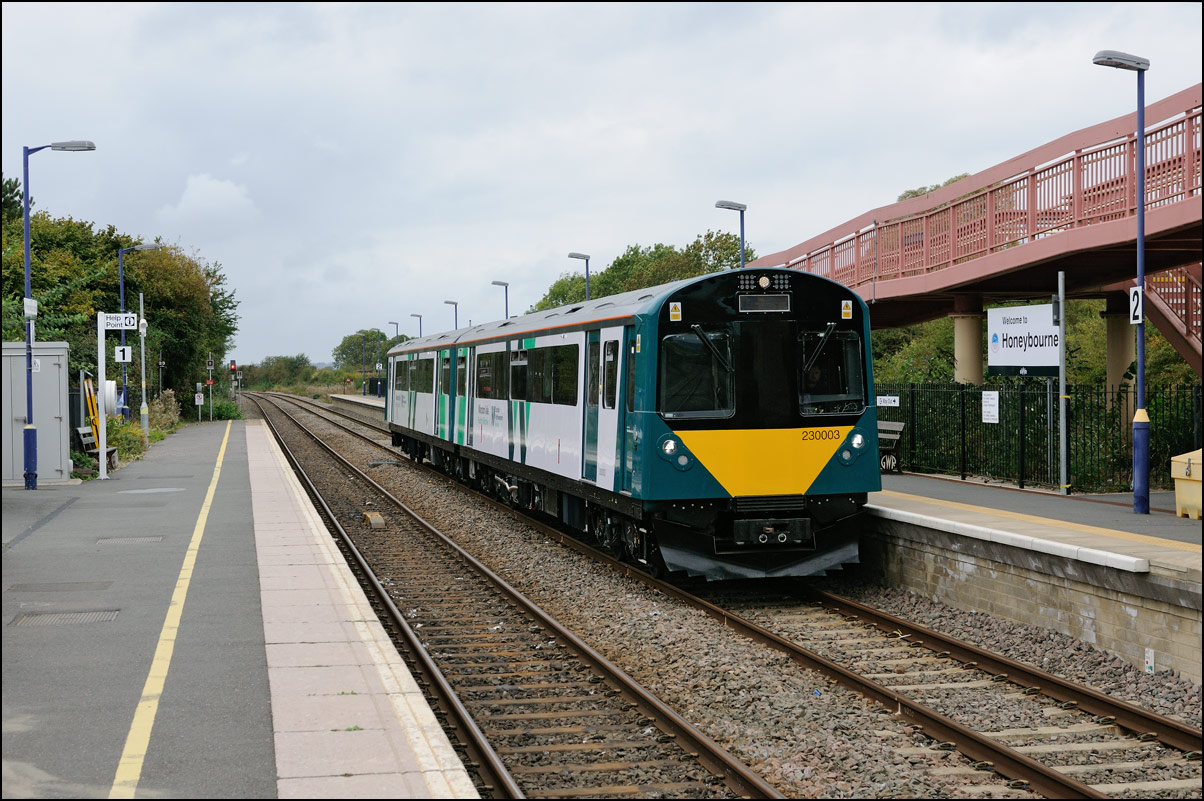 I walked from Moreton-in-Marsh station to the nearby roadbridge in the hope that 230001 would run as scheduled and make another trip up to Moreton. It did not report after leaving Honeybourne North Junction so I was pleased when it appeared and came to a stop at the starting signal just before 800022 arrived giving the chance for a shot of the strange bedfellows side-by-side. |