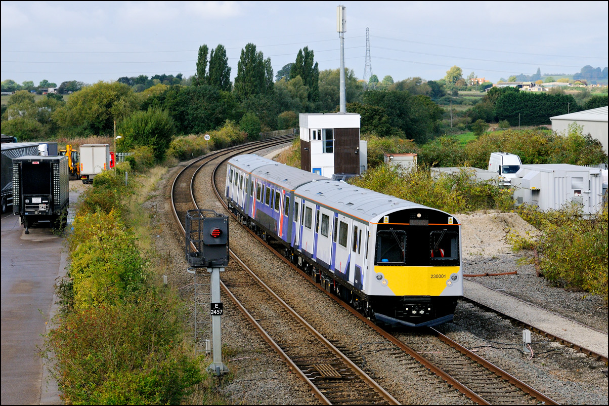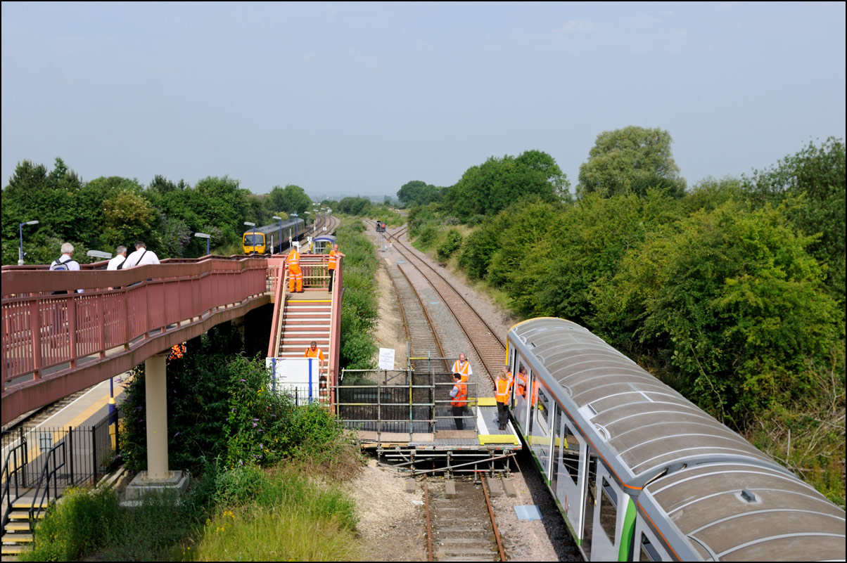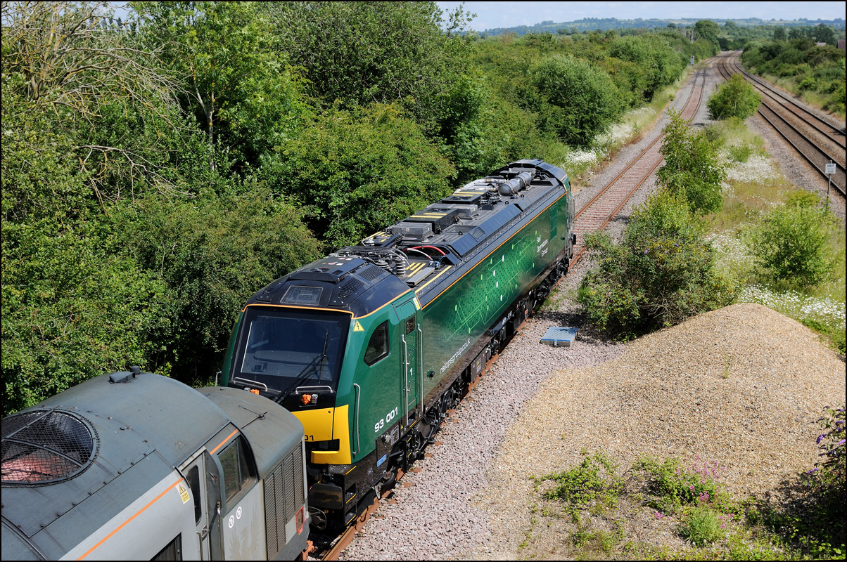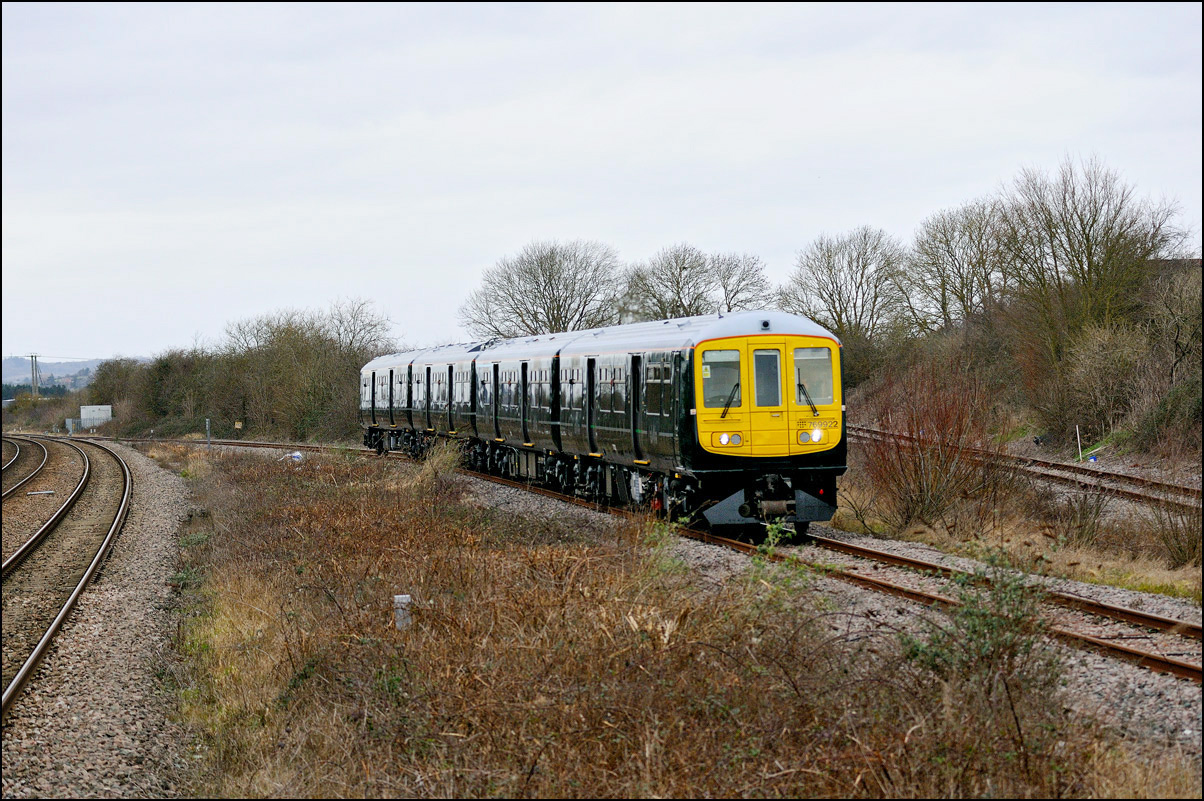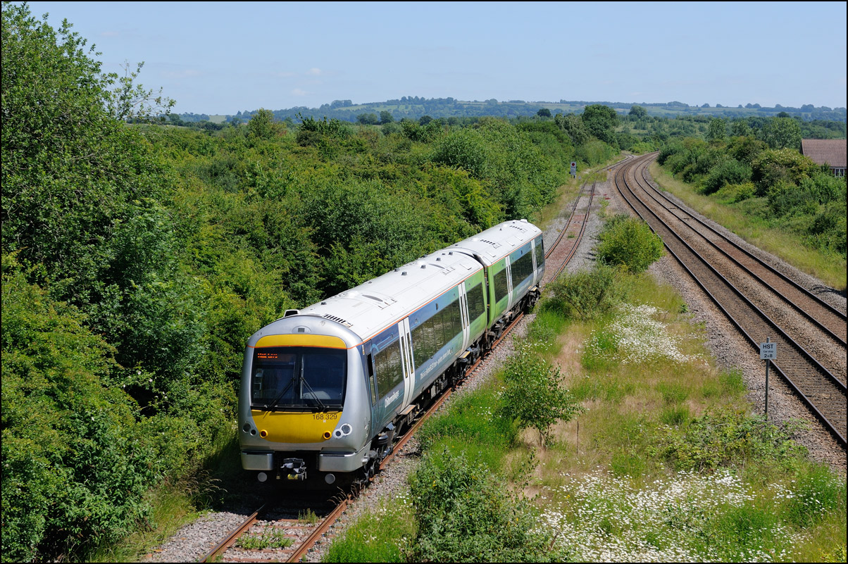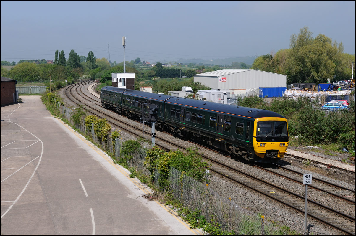 I walked from Moreton-in-Marsh station to the nearby roadbridge in the hope that 230001 would run as scheduled and make another trip up to Moreton. It did not report after leaving Honeybourne North Junction so I was pleased when it appeared and came to a stop at the starting signal just before 800022 arrived giving the chance for a shot of the strange bedfellows side-by-side. |