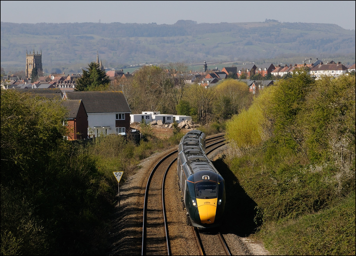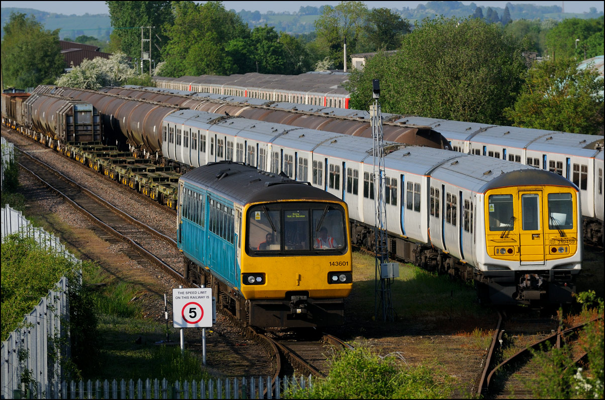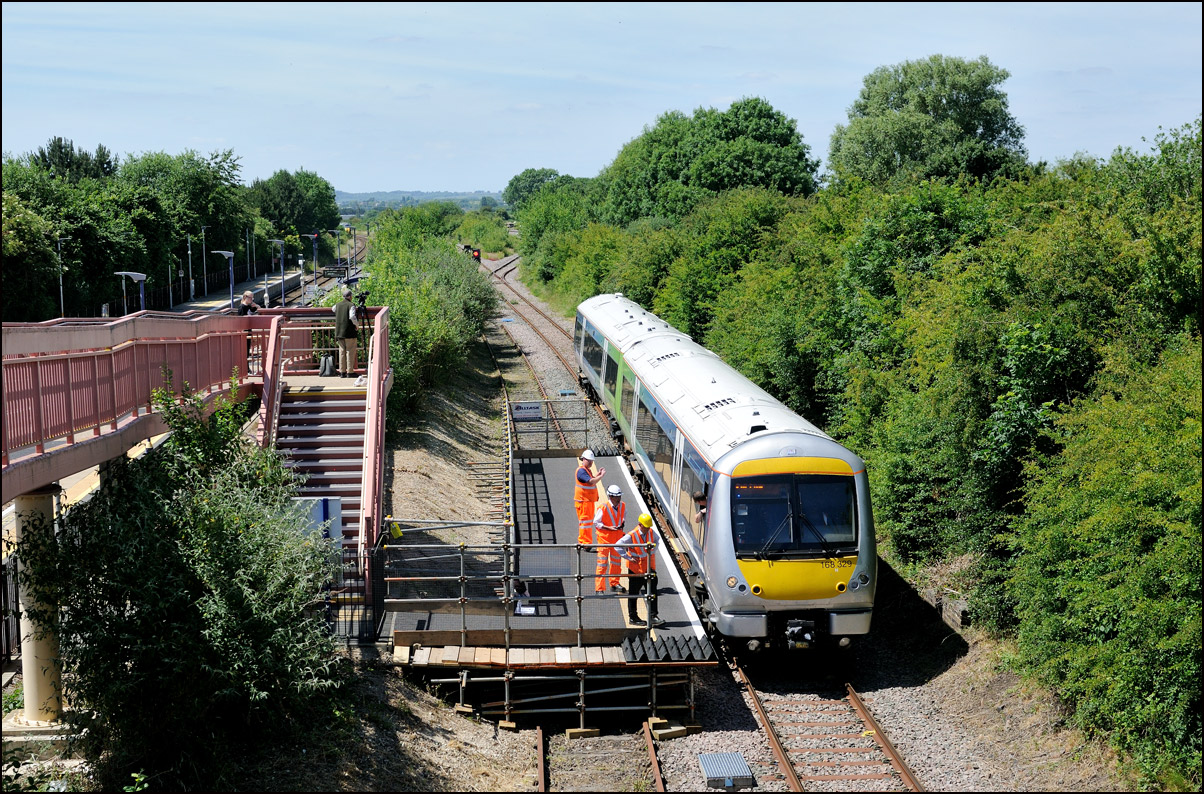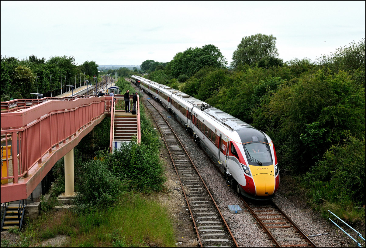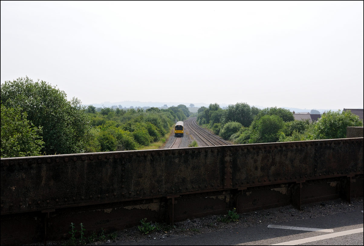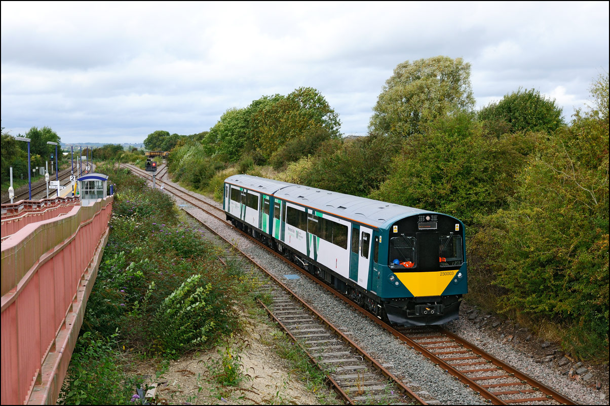 I walked from Moreton-in-Marsh station to the nearby roadbridge in the hope that 230001 would run as scheduled and make another trip up to Moreton. It did not report after leaving Honeybourne North Junction so I was pleased when it appeared and came to a stop at the starting signal just before 800022 arrived giving the chance for a shot of the strange bedfellows side-by-side. |