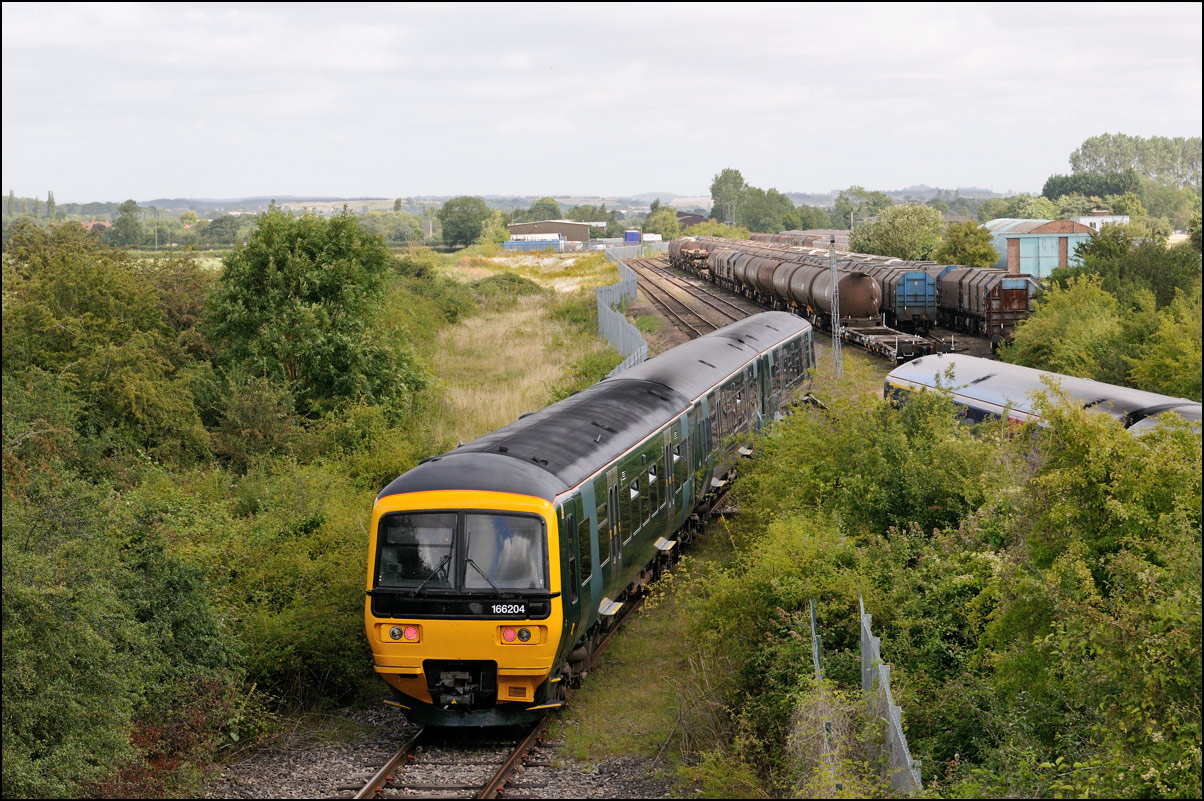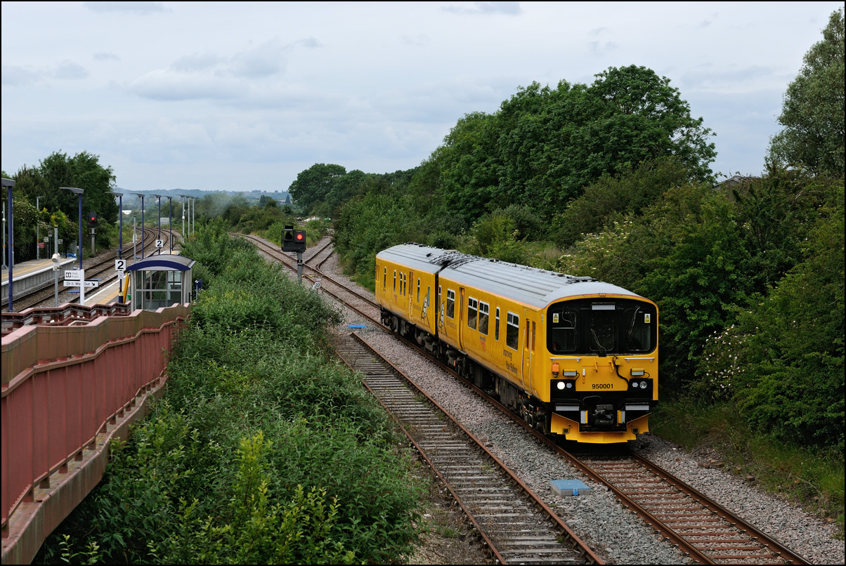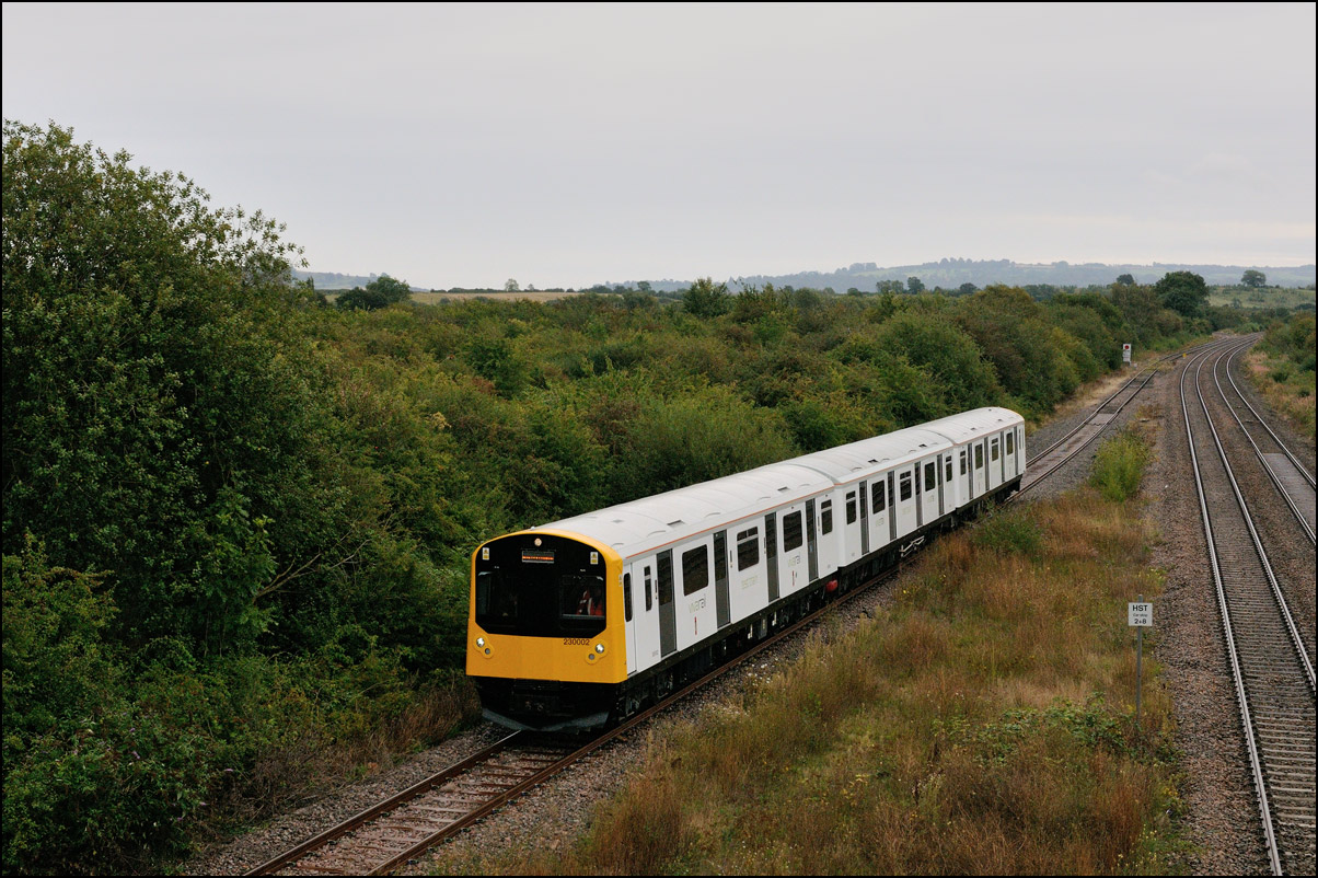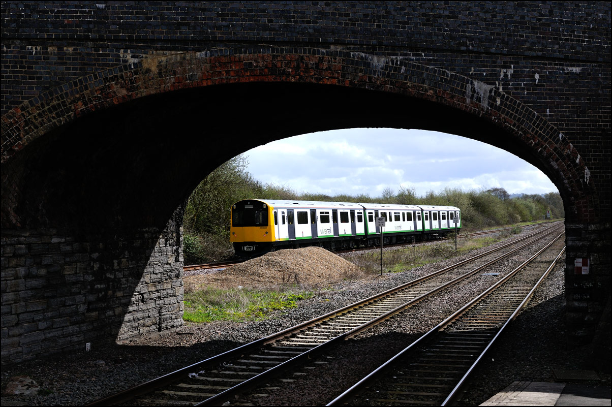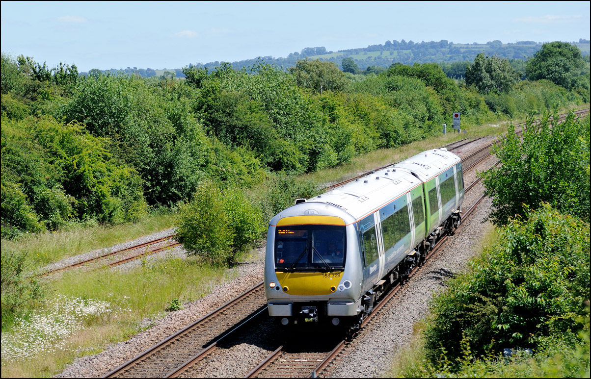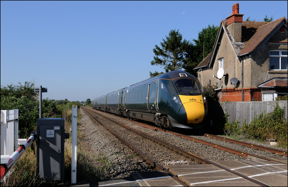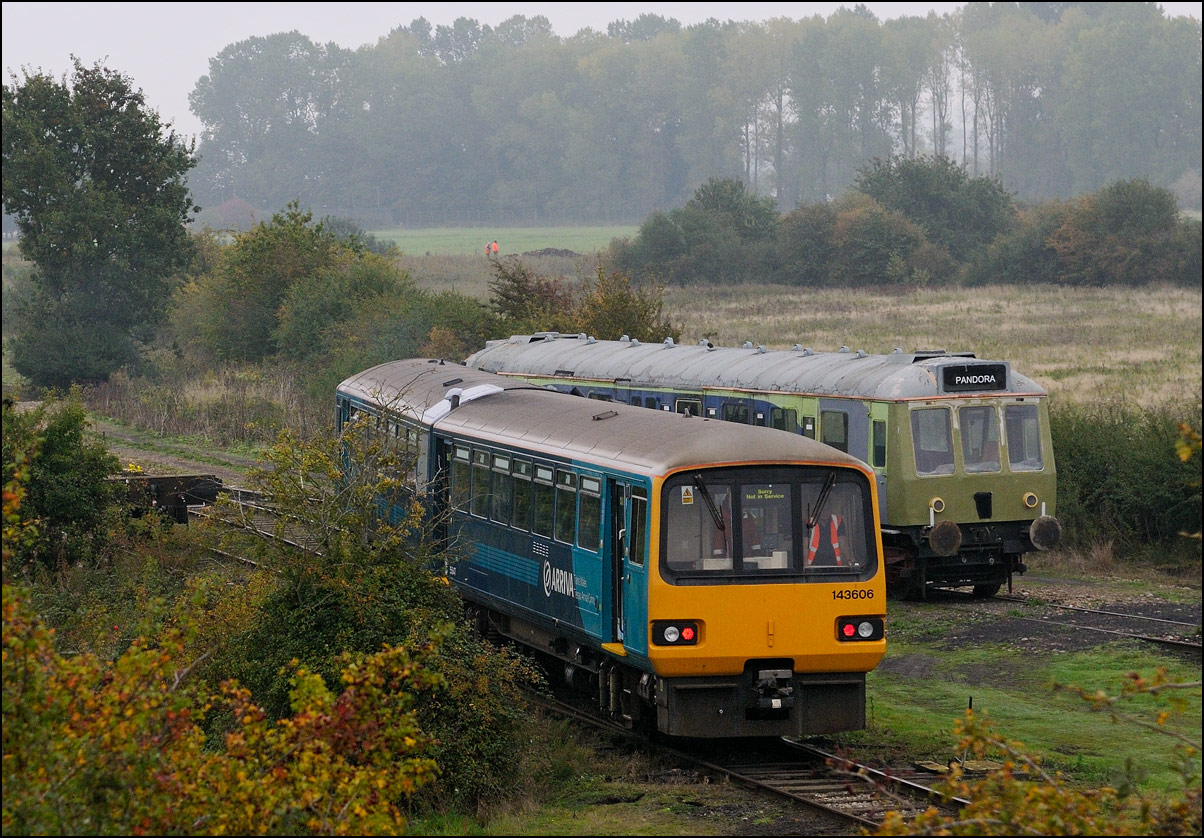 I walked from Moreton-in-Marsh station to the nearby roadbridge in the hope that 230001 would run as scheduled and make another trip up to Moreton. It did not report after leaving Honeybourne North Junction so I was pleased when it appeared and came to a stop at the starting signal just before 800022 arrived giving the chance for a shot of the strange bedfellows side-by-side. |