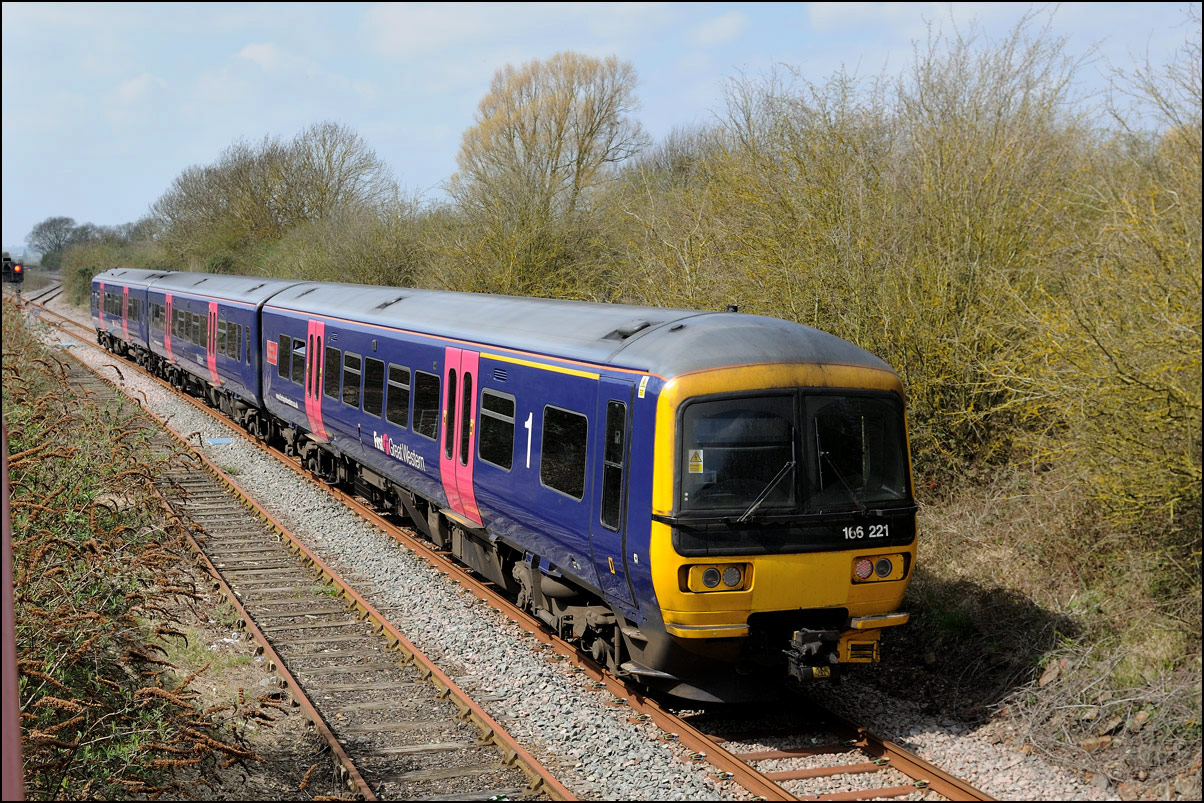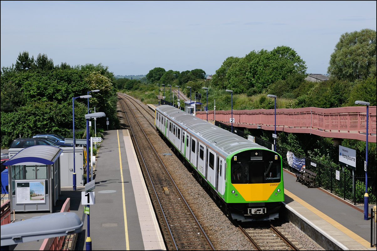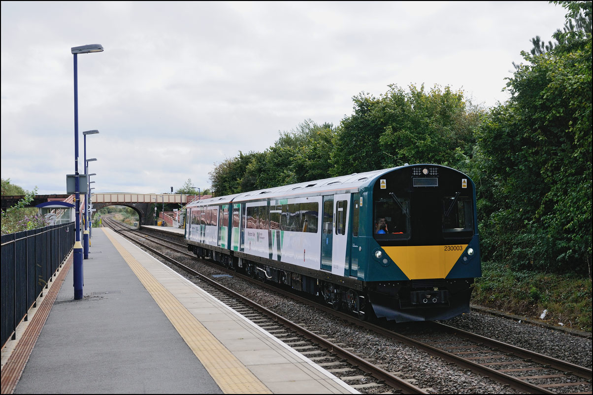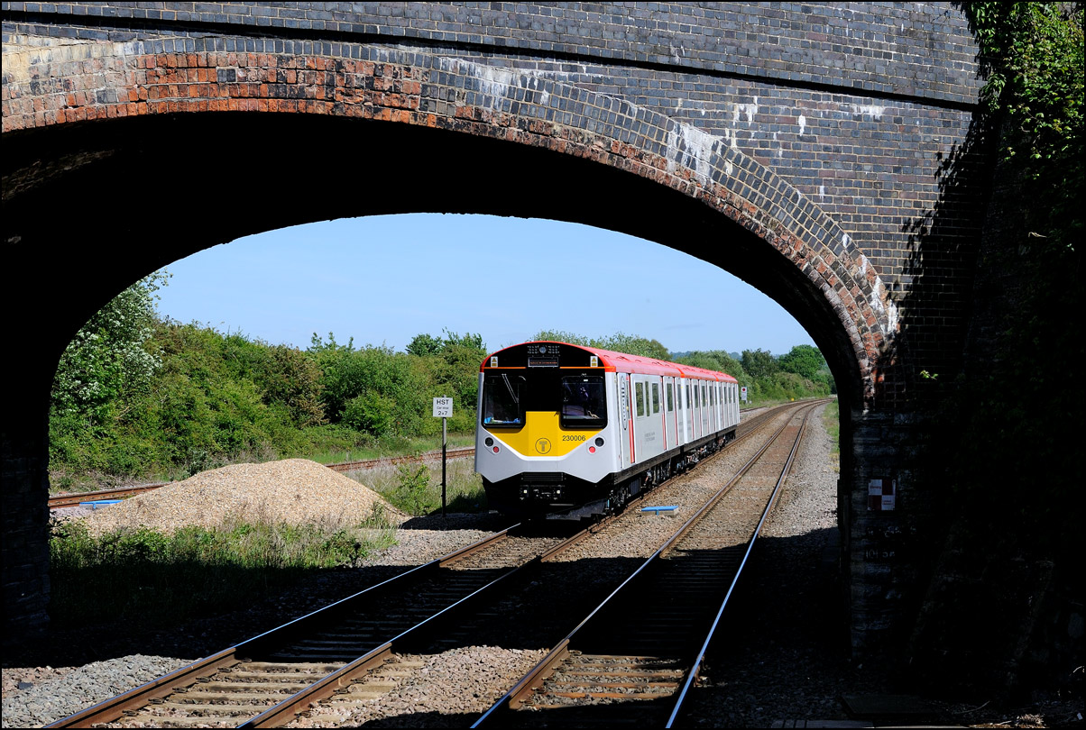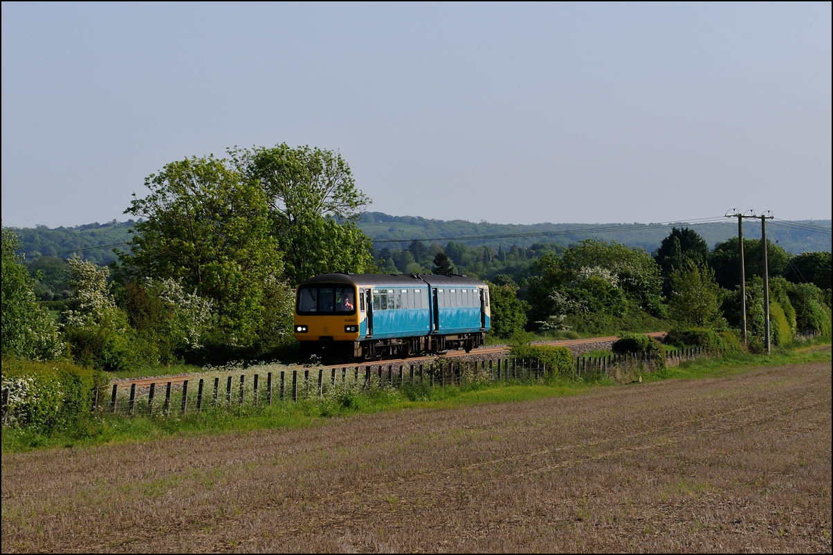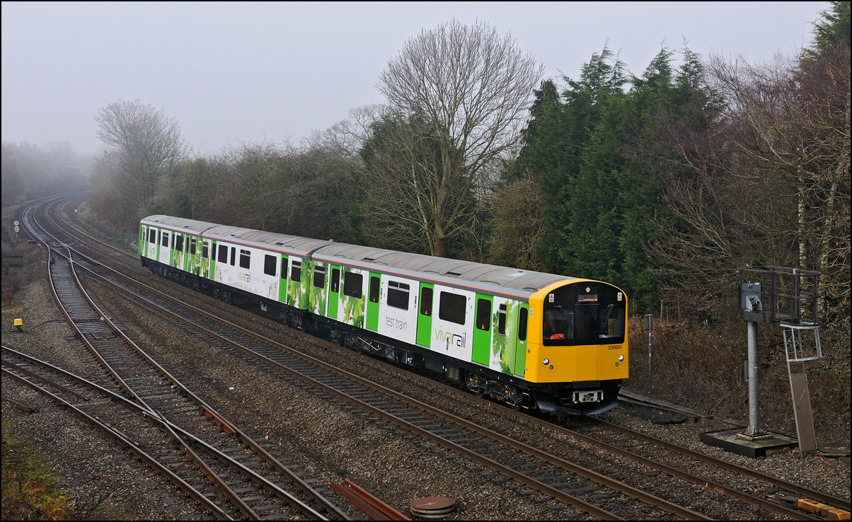 I walked from Moreton-in-Marsh station to the nearby roadbridge in the hope that 230001 would run as scheduled and make another trip up to Moreton. It did not report after leaving Honeybourne North Junction so I was pleased when it appeared and came to a stop at the starting signal just before 800022 arrived giving the chance for a shot of the strange bedfellows side-by-side. |