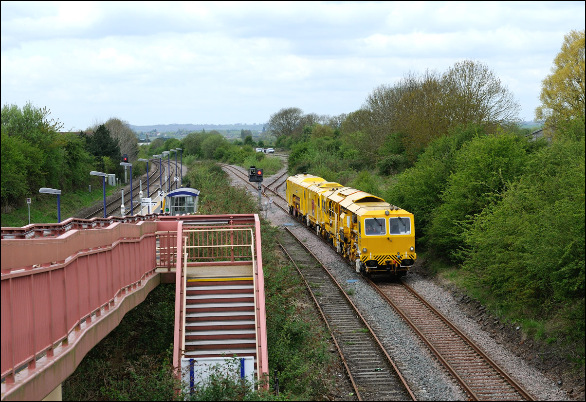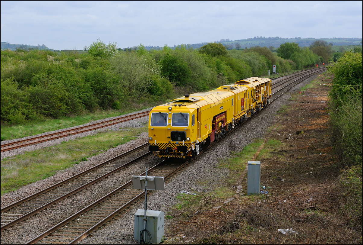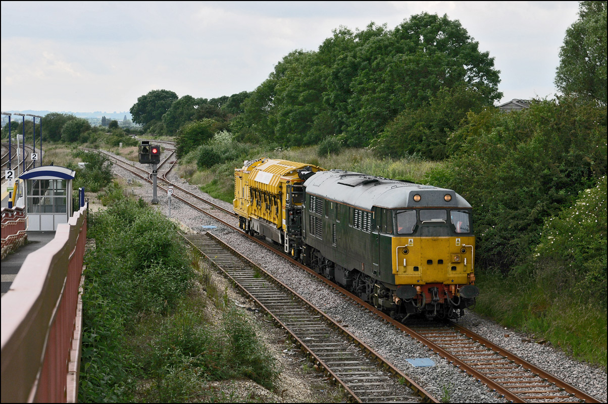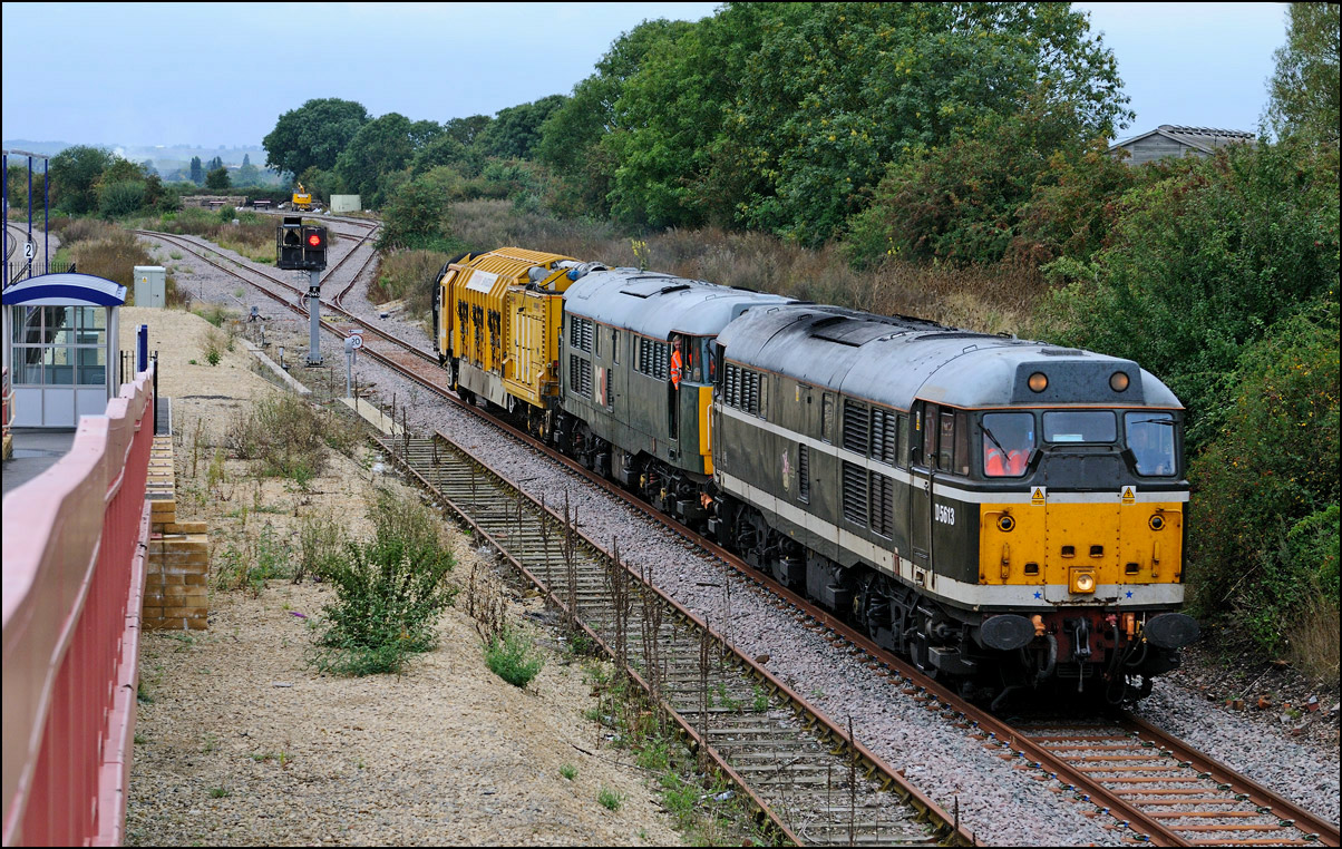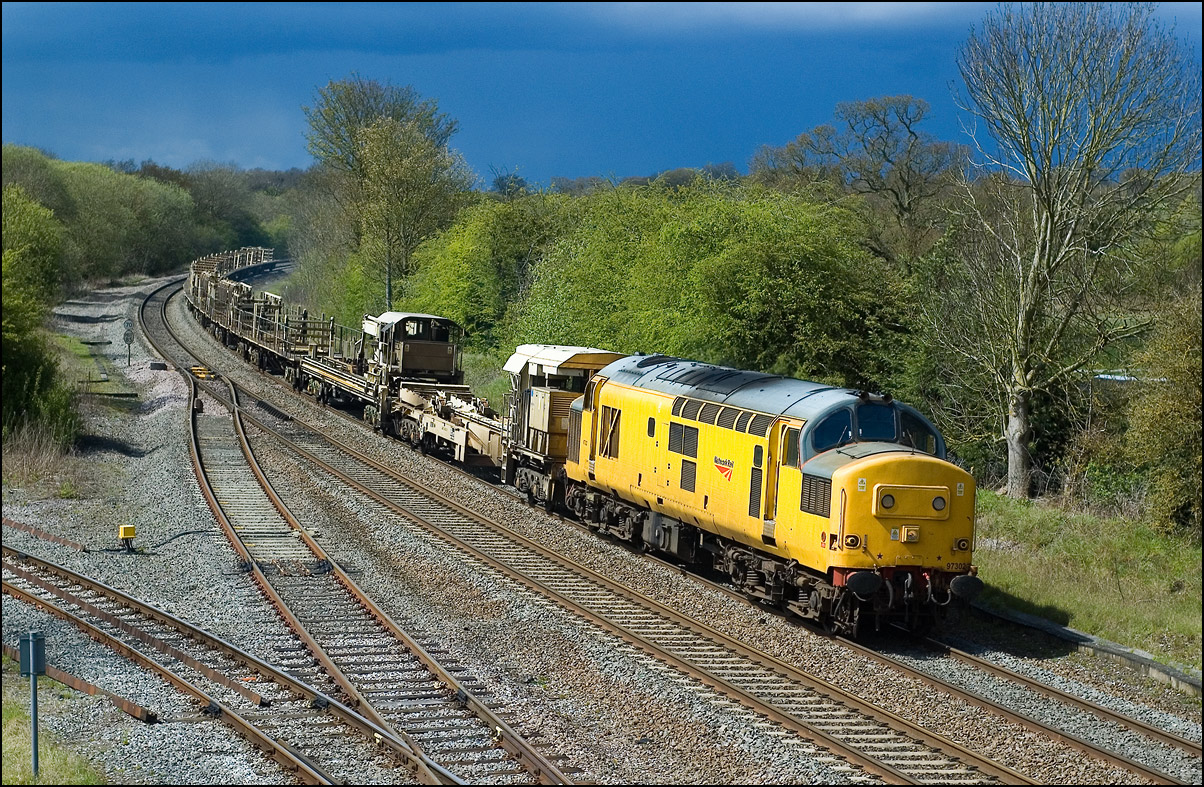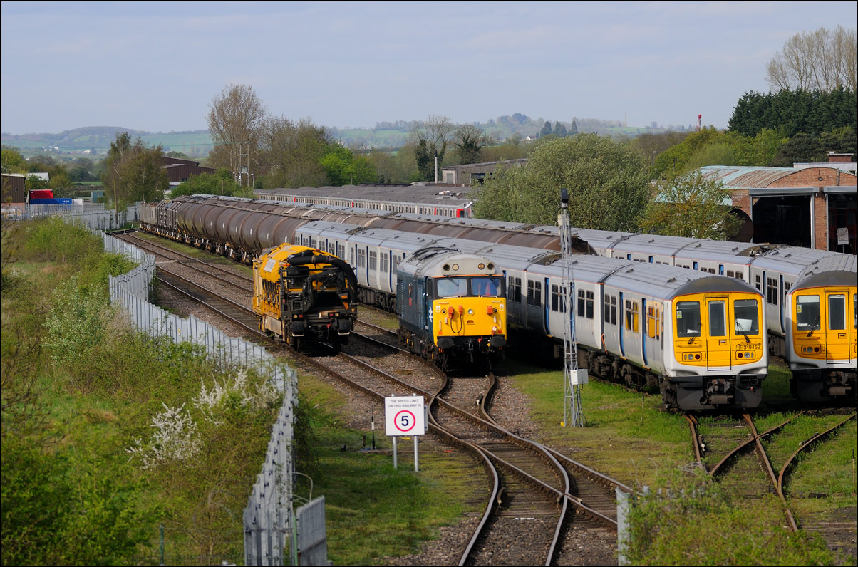 It wasn't long before the line was clear and the weedkilling train was allowed access to the main Cotswold Line. It is here seen crossing over the spur where, if I remember correctly, it reversed at headed south towards Moreton-in-Marsh and Oxford. This location is set to change during 2010 when the single track here is doubled and the arrangements to allow train onto the branch are revised with the track through the former branch platforms at the station being relaid with the connection to the main line placed at the south (east) end. |