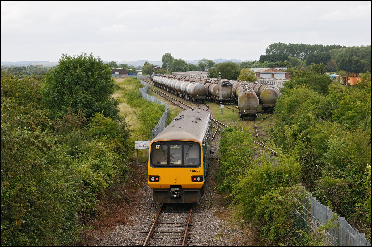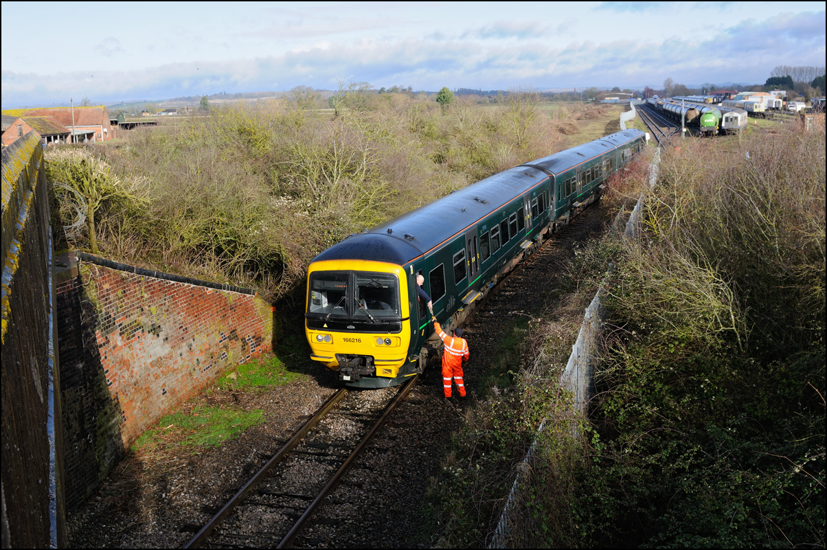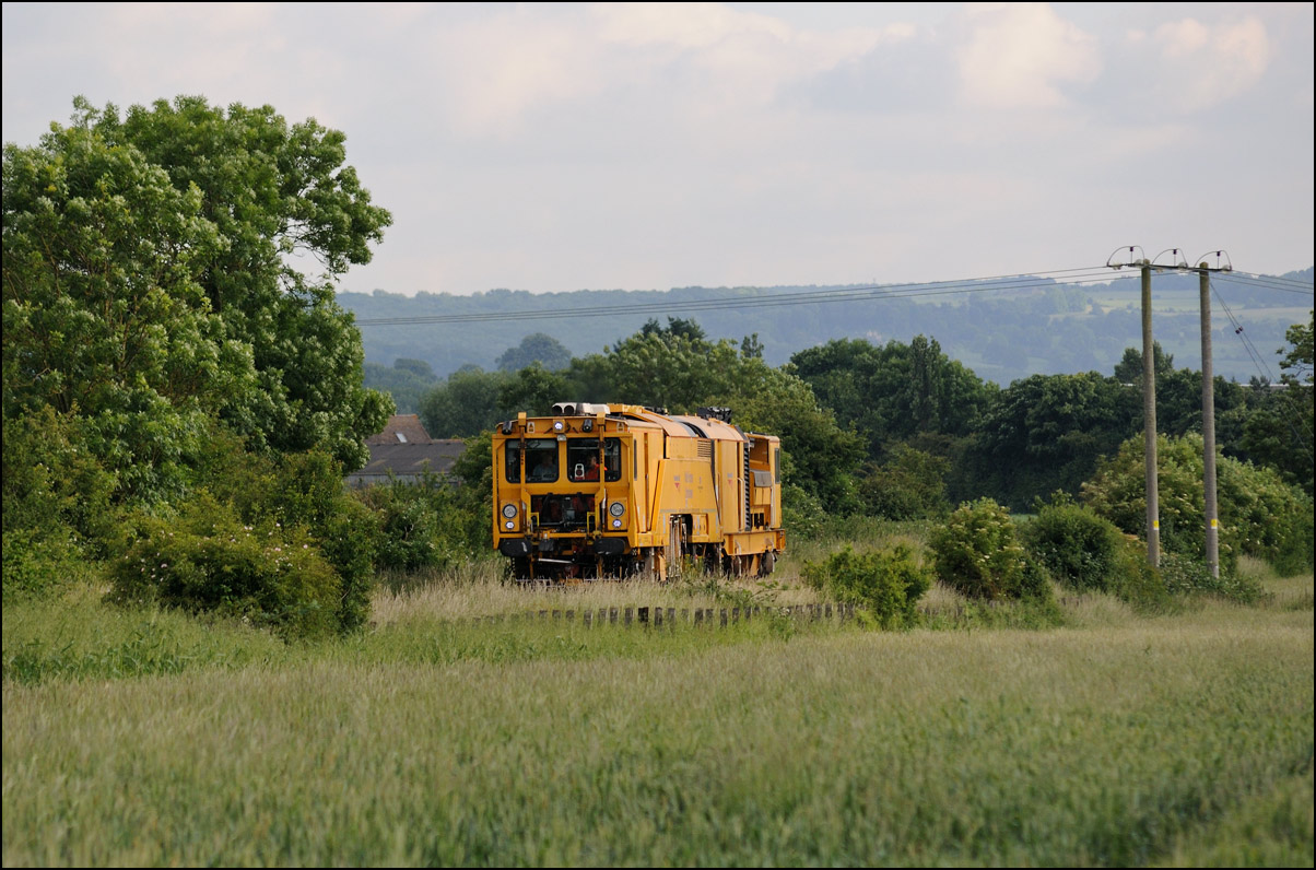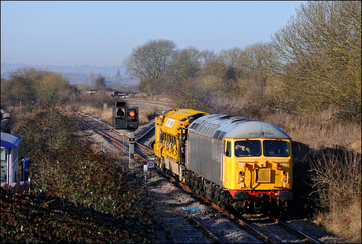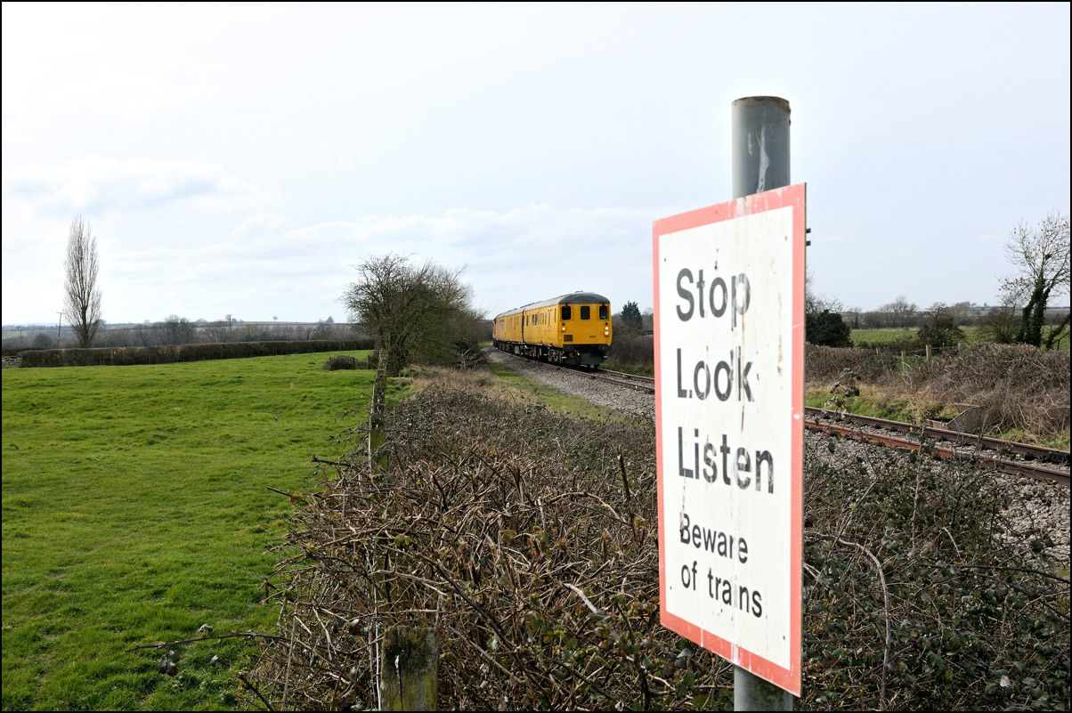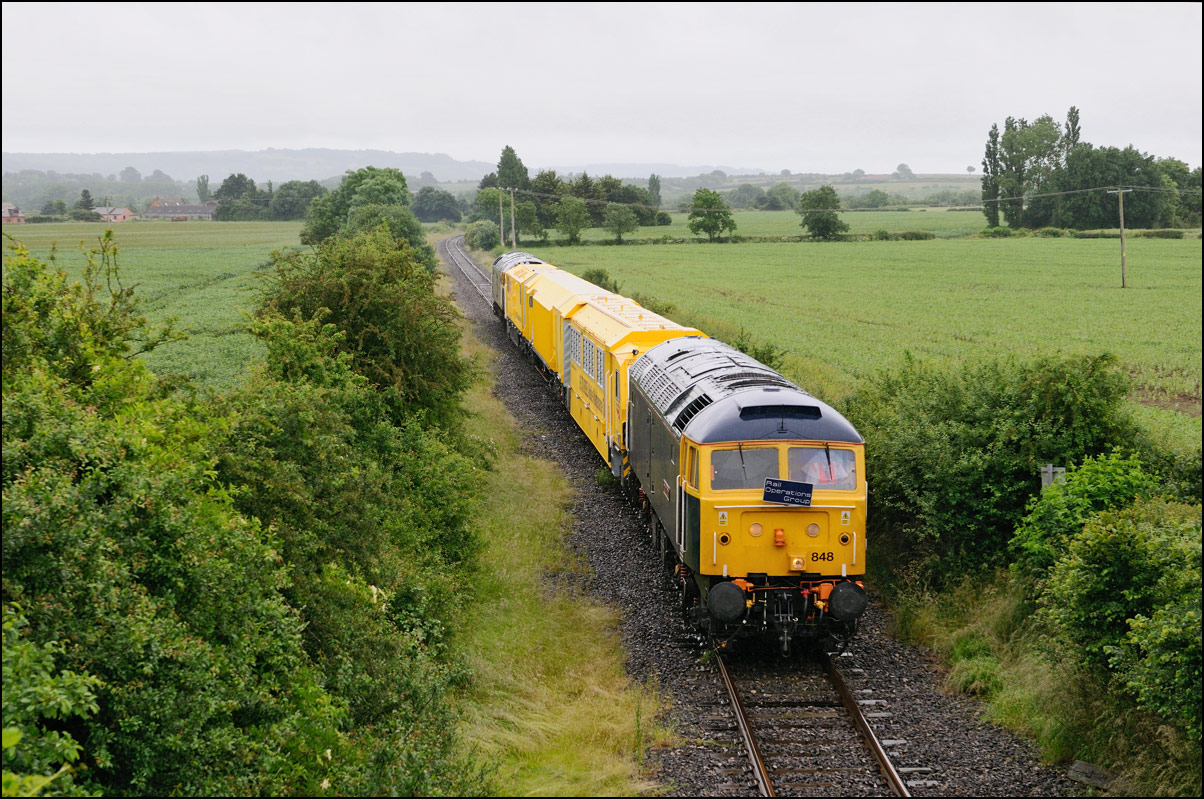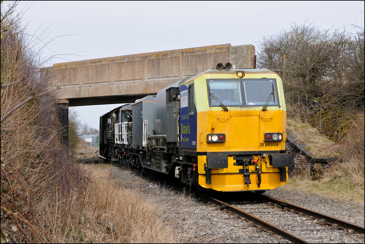 It wasn't long before the line was clear and the weedkilling train was allowed access to the main Cotswold Line. It is here seen crossing over the spur where, if I remember correctly, it reversed at headed south towards Moreton-in-Marsh and Oxford. This location is set to change during 2010 when the single track here is doubled and the arrangements to allow train onto the branch are revised with the track through the former branch platforms at the station being relaid with the connection to the main line placed at the south (east) end. |