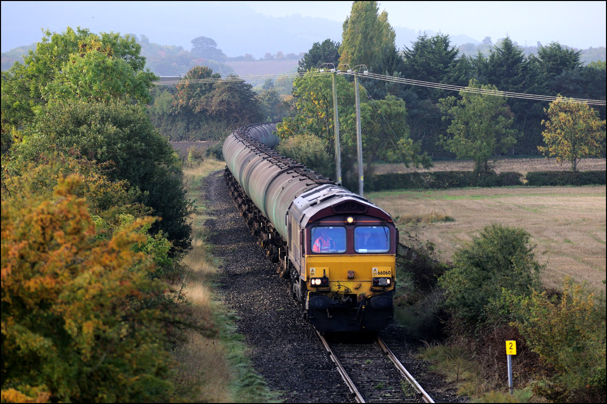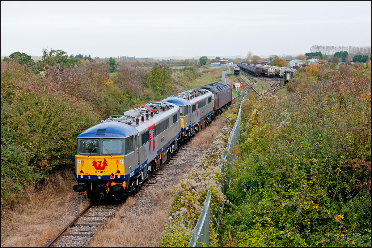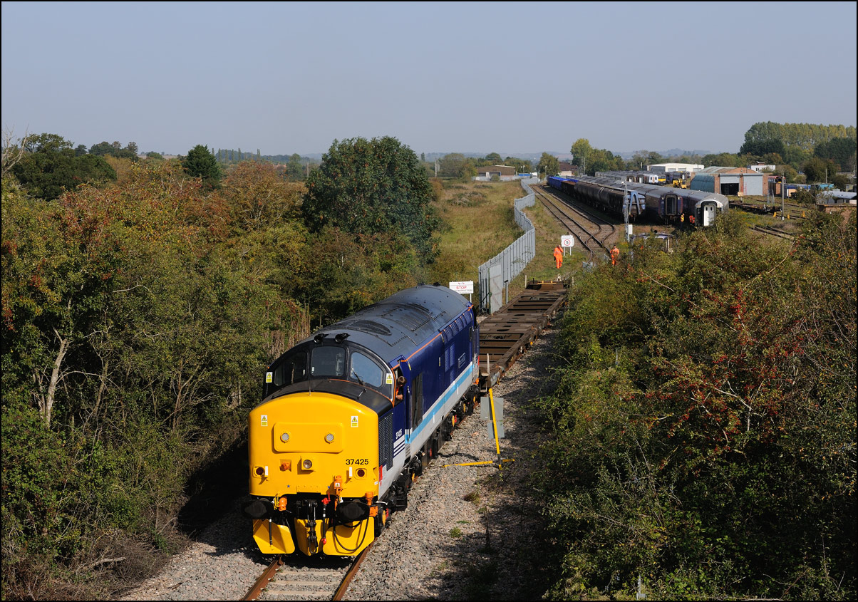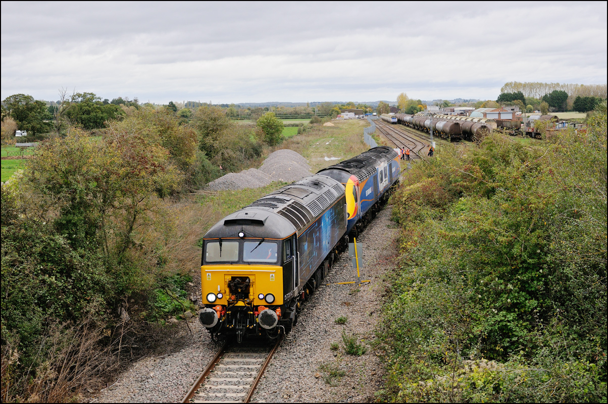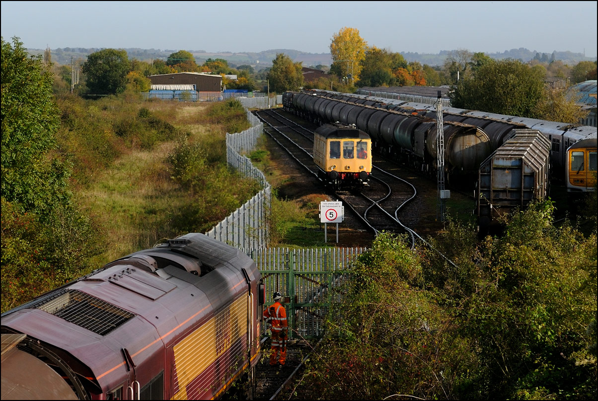 Despite the dull and misty weather I went out for a shot or two of the Tyseley to Long Marston class 196 move with 37601 and 37510 topping and tailing 196114, largely because for a change it was running without translator wagons. My intention was to go to a bridge just to the west of Pershore station but long traffic queues thanks to never-ending roadworks meant that there wasn't time to get there so I turned off to Lower Moor leaving about 5 minutes to spare. The headcode was 8Q94, timed at 30 mph, so the train took quite a while to reach me from Norton Junction. There was never going to be a lot of noise from 37601 at such a low speed but I took a piece of video as it passed by. There was plenty of time to move to the other side of the bridge for another shot the train went away towards some impressive autumn colours which would look good on a sunny day. |