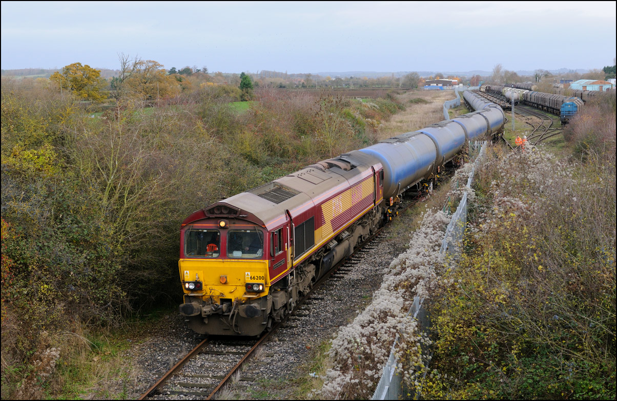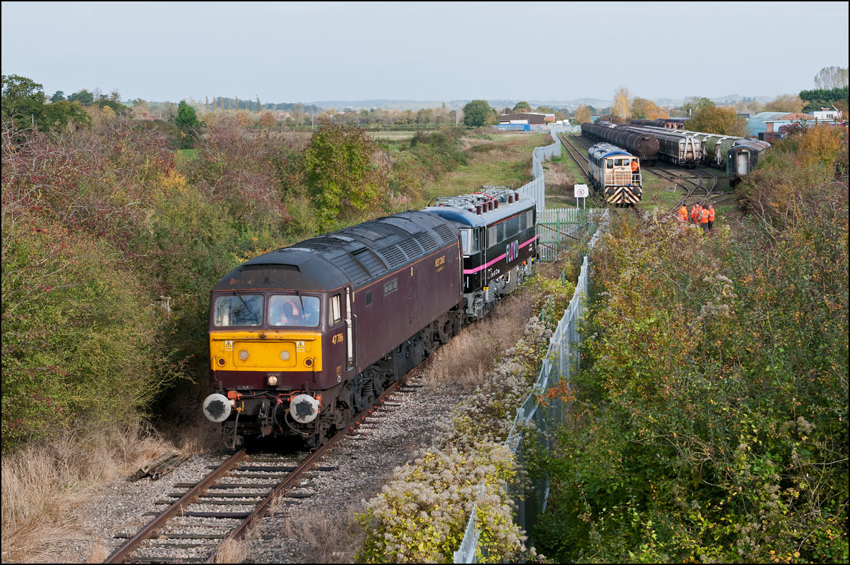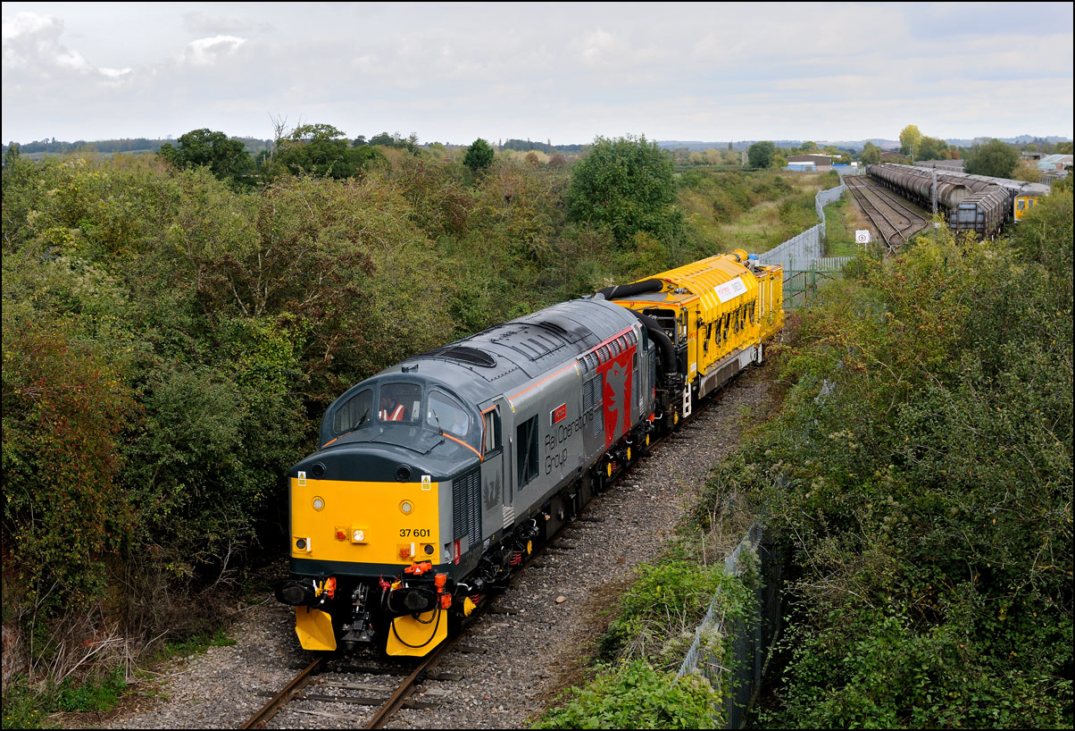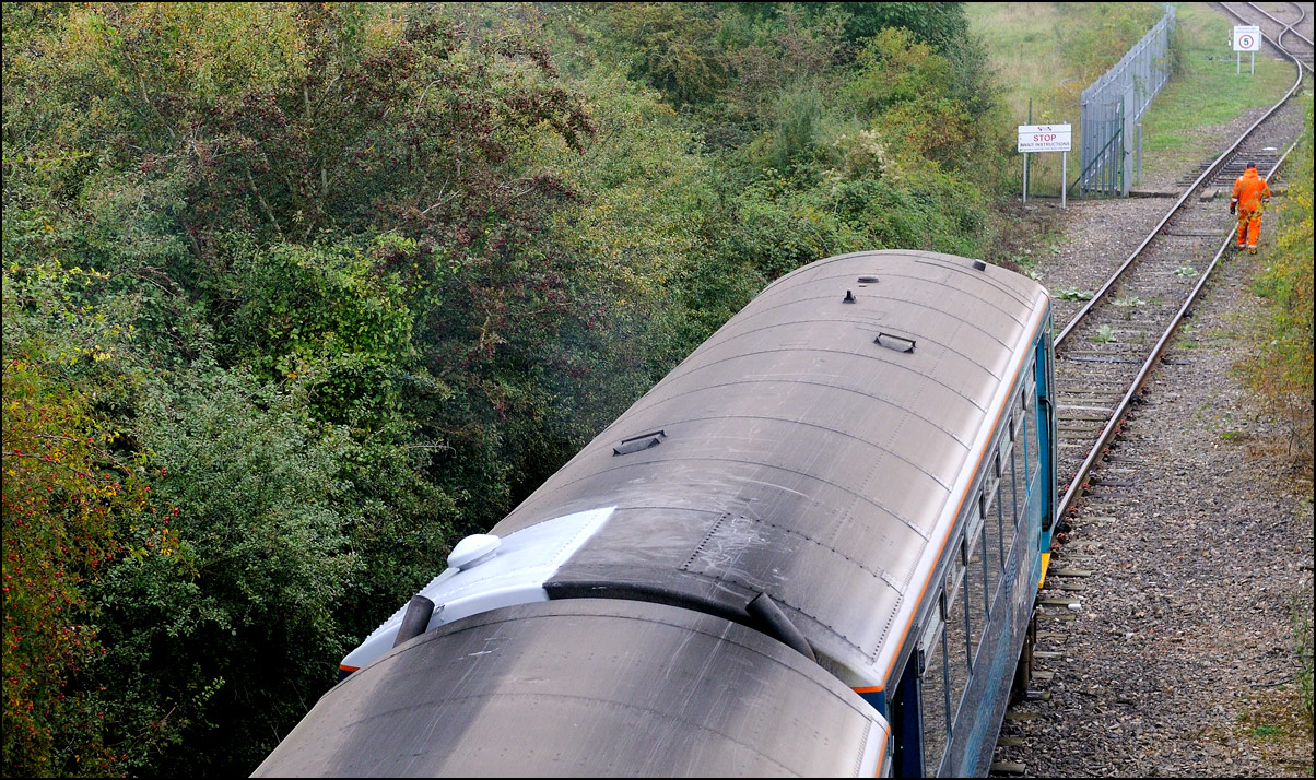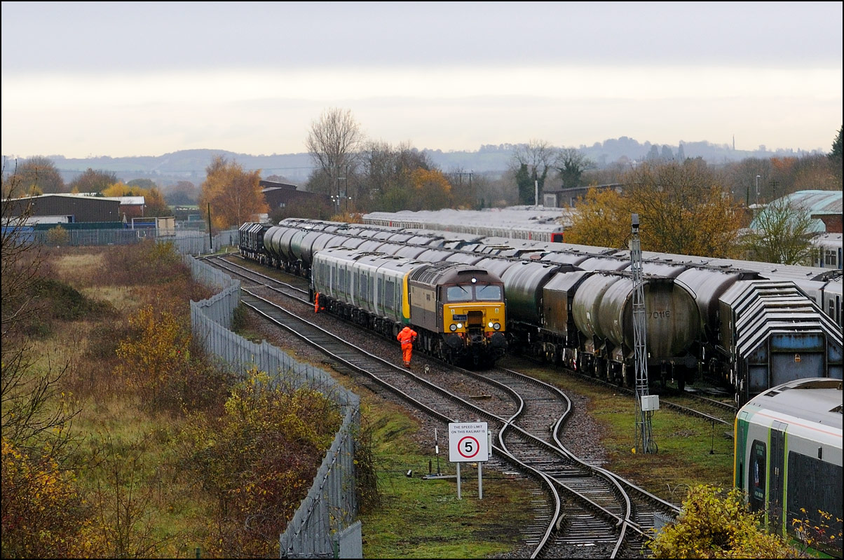 Despite the dull and misty weather I went out for a shot or two of the Tyseley to Long Marston class 196 move with 37601 and 37510 topping and tailing 196114, largely because for a change it was running without translator wagons. My intention was to go to a bridge just to the west of Pershore station but long traffic queues thanks to never-ending roadworks meant that there wasn't time to get there so I turned off to Lower Moor leaving about 5 minutes to spare. The headcode was 8Q94, timed at 30 mph, so the train took quite a while to reach me from Norton Junction. There was never going to be a lot of noise from 37601 at such a low speed but I took a piece of video as it passed by. There was plenty of time to move to the other side of the bridge for another shot the train went away towards some impressive autumn colours which would look good on a sunny day. |