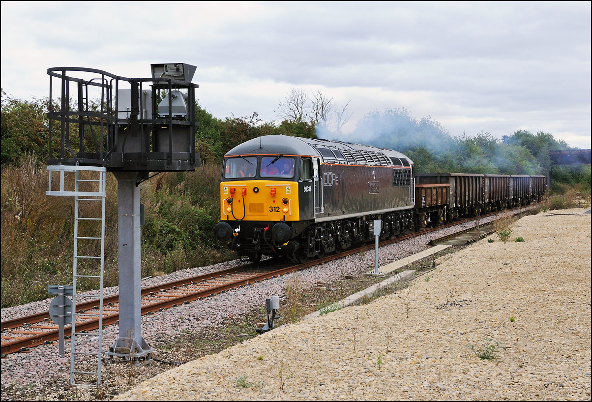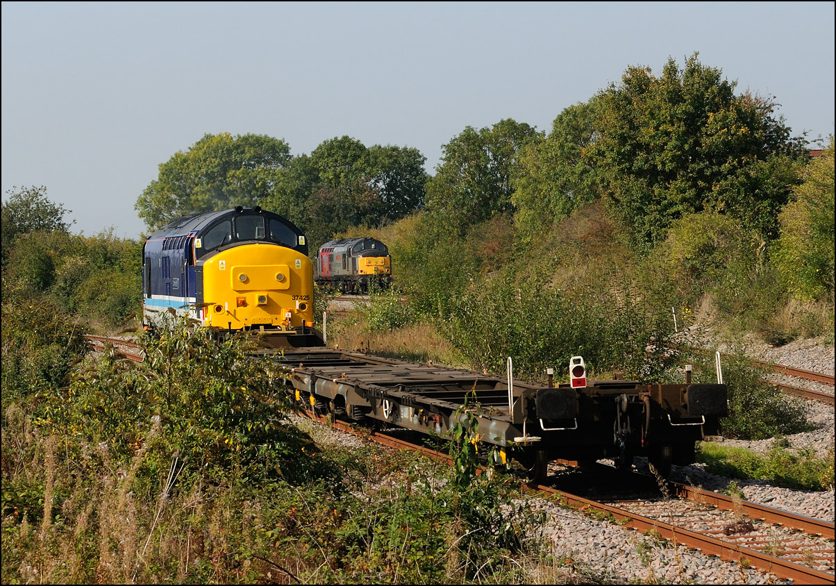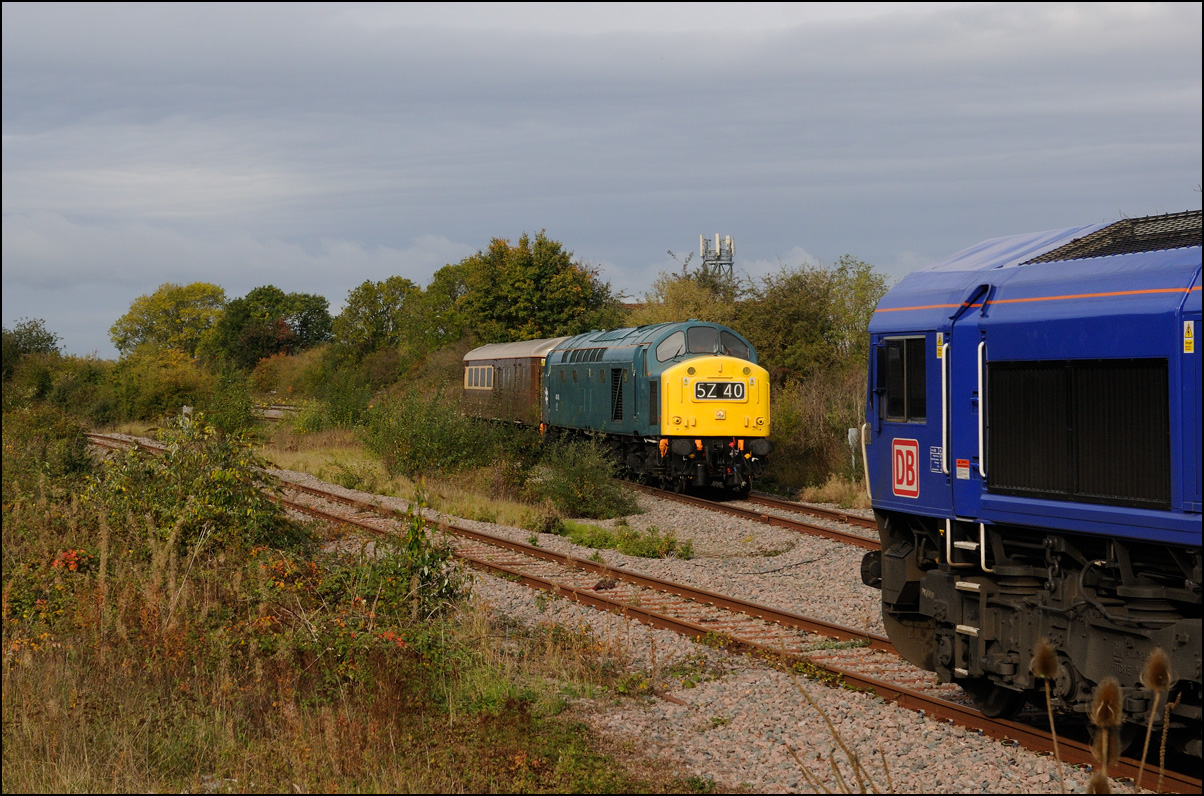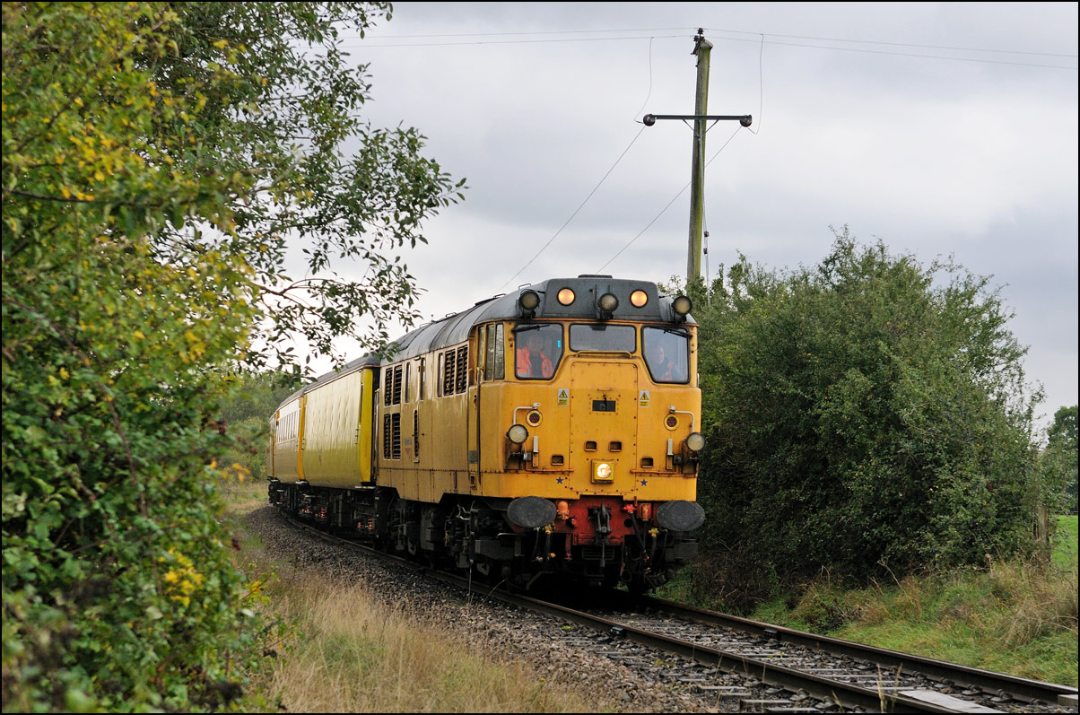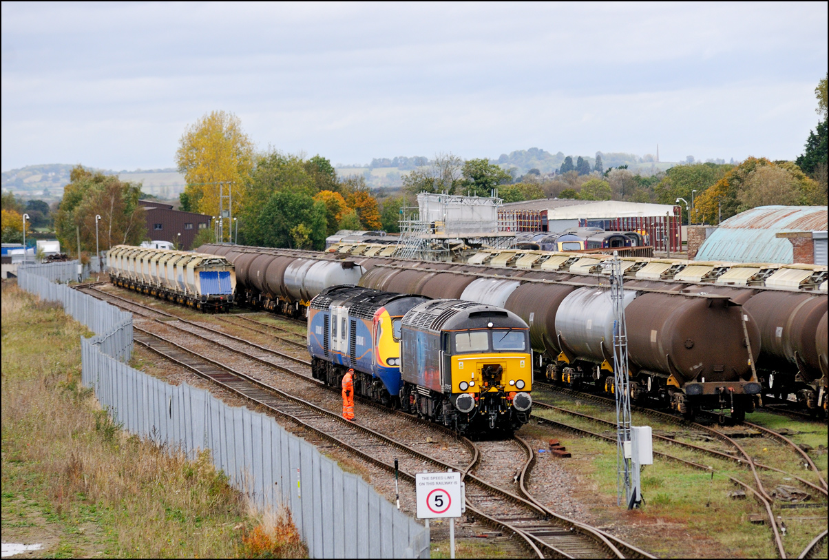 Despite the dull and misty weather I went out for a shot or two of the Tyseley to Long Marston class 196 move with 37601 and 37510 topping and tailing 196114, largely because for a change it was running without translator wagons. My intention was to go to a bridge just to the west of Pershore station but long traffic queues thanks to never-ending roadworks meant that there wasn't time to get there so I turned off to Lower Moor leaving about 5 minutes to spare. The headcode was 8Q94, timed at 30 mph, so the train took quite a while to reach me from Norton Junction. There was never going to be a lot of noise from 37601 at such a low speed but I took a piece of video as it passed by. There was plenty of time to move to the other side of the bridge for another shot the train went away towards some impressive autumn colours which would look good on a sunny day. |
