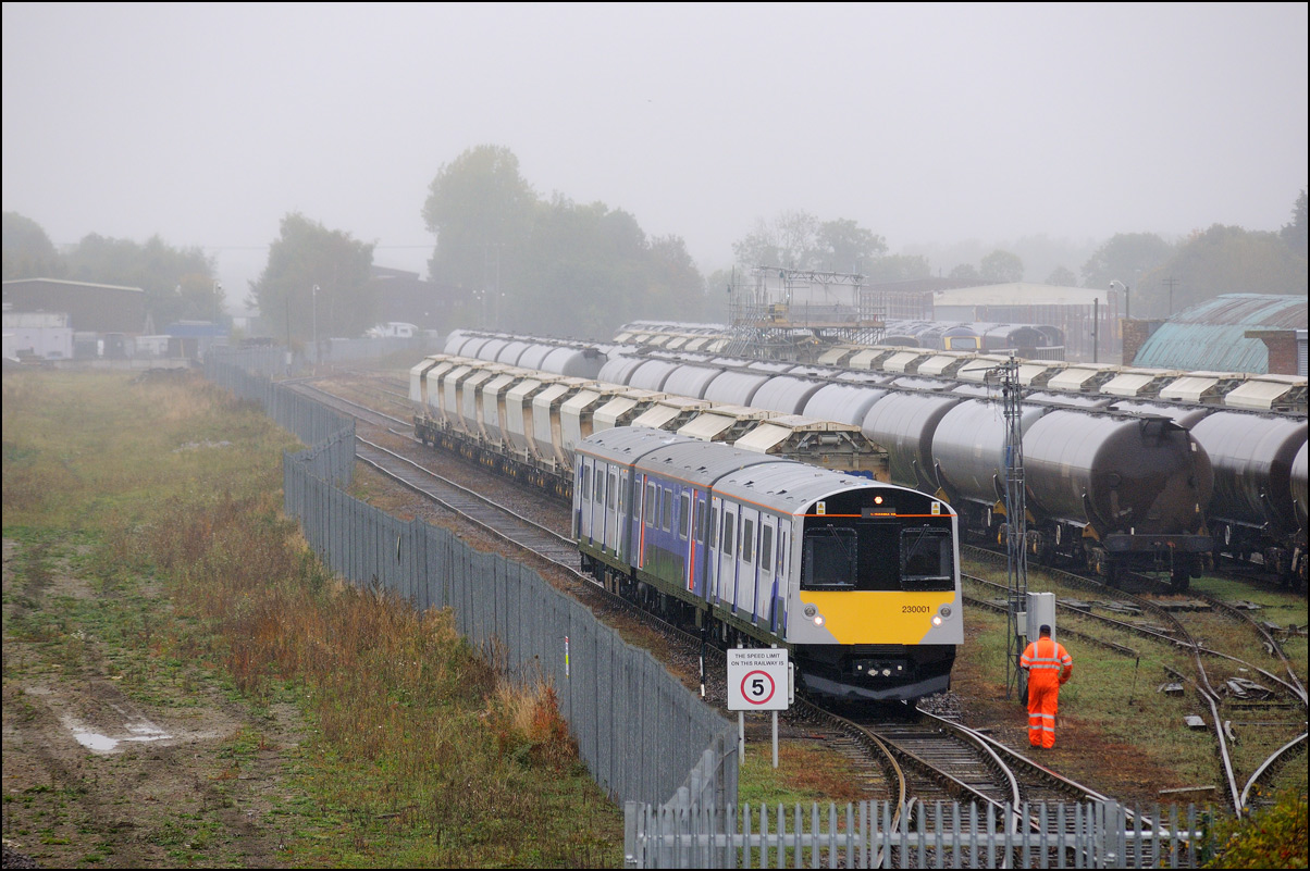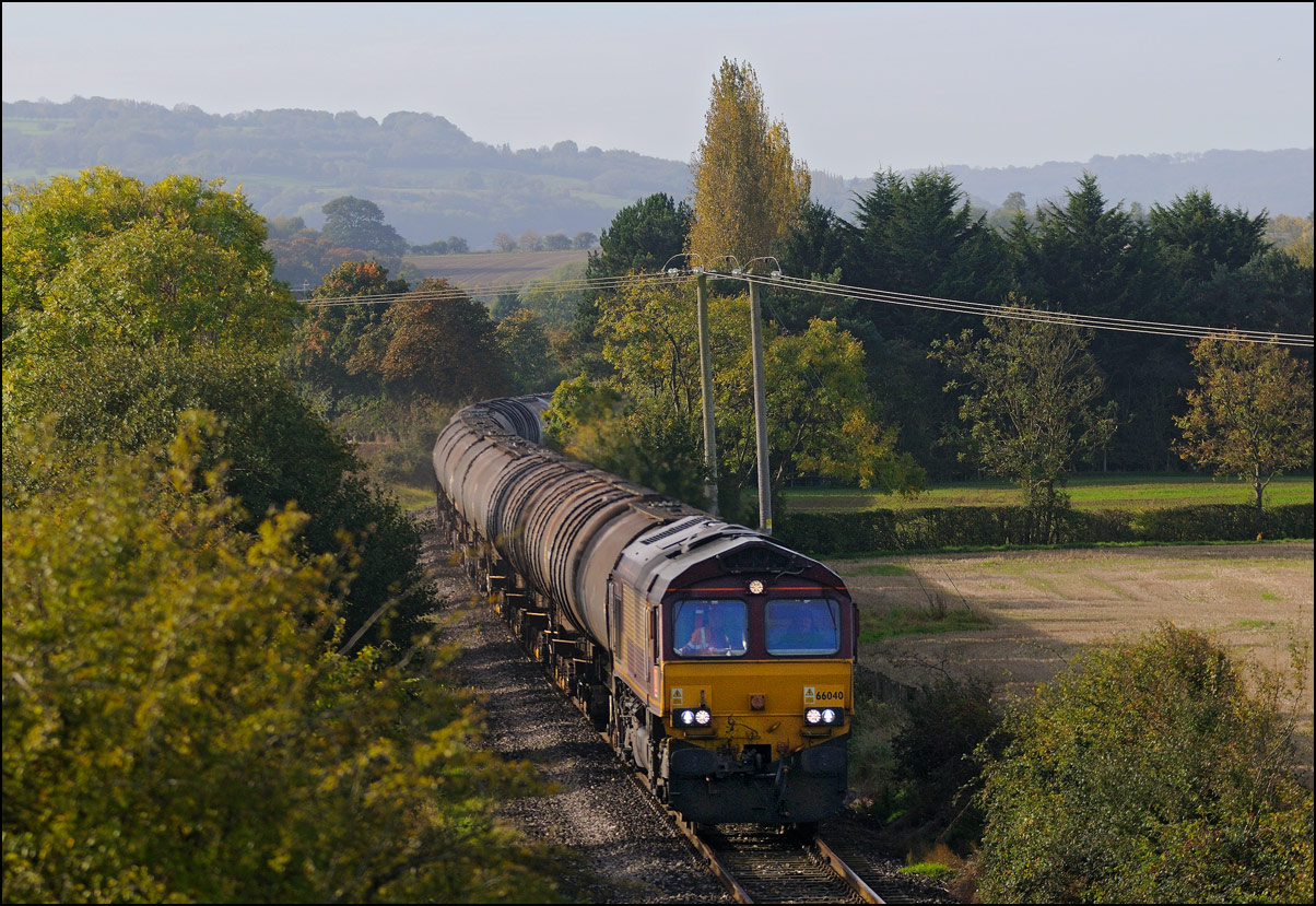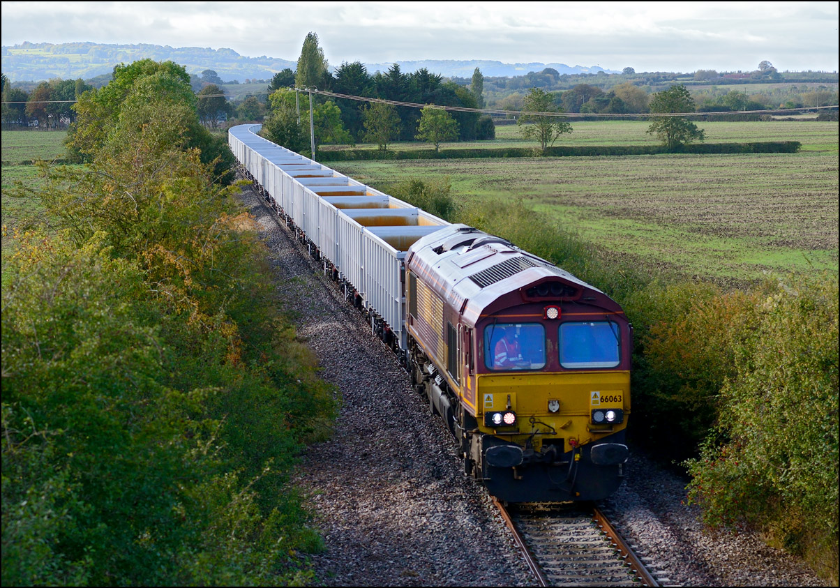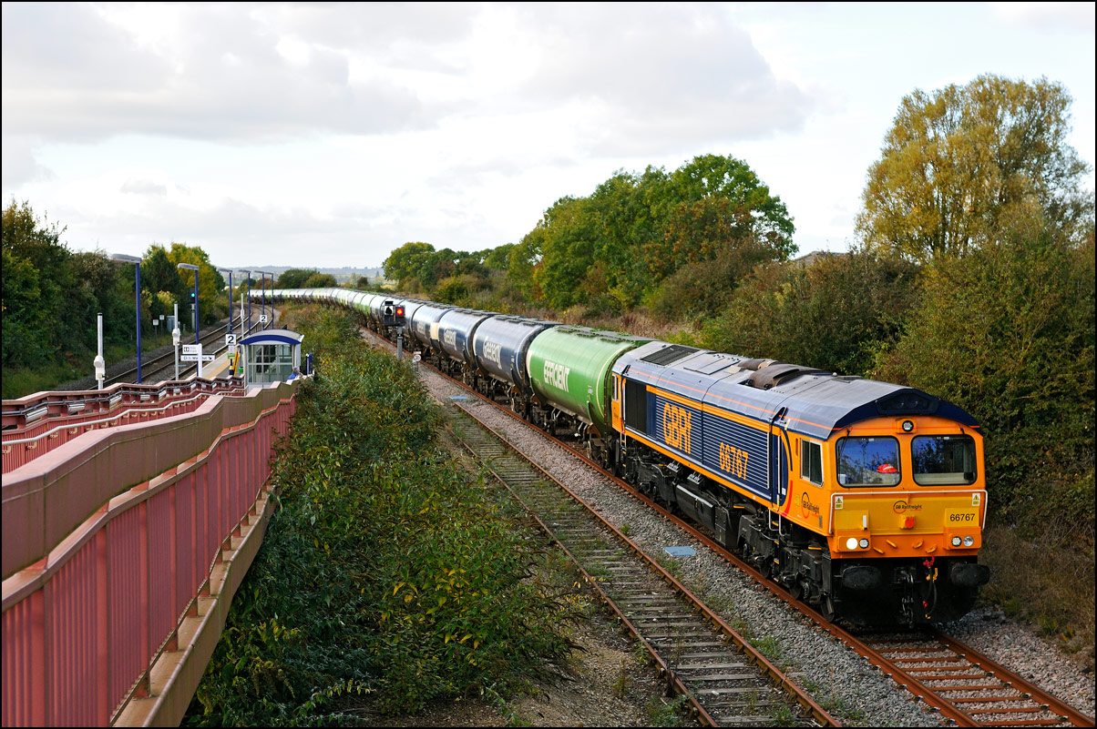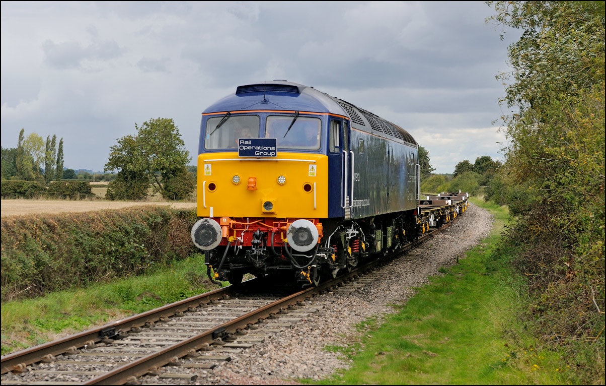 Despite the dull and misty weather I went out for a shot or two of the Tyseley to Long Marston class 196 move with 37601 and 37510 topping and tailing 196114, largely because for a change it was running without translator wagons. My intention was to go to a bridge just to the west of Pershore station but long traffic queues thanks to never-ending roadworks meant that there wasn't time to get there so I turned off to Lower Moor leaving about 5 minutes to spare. The headcode was 8Q94, timed at 30 mph, so the train took quite a while to reach me from Norton Junction. There was never going to be a lot of noise from 37601 at such a low speed but I took a piece of video as it passed by. There was plenty of time to move to the other side of the bridge for another shot the train went away towards some impressive autumn colours which would look good on a sunny day. |