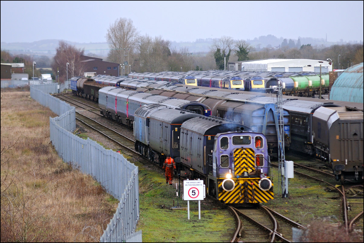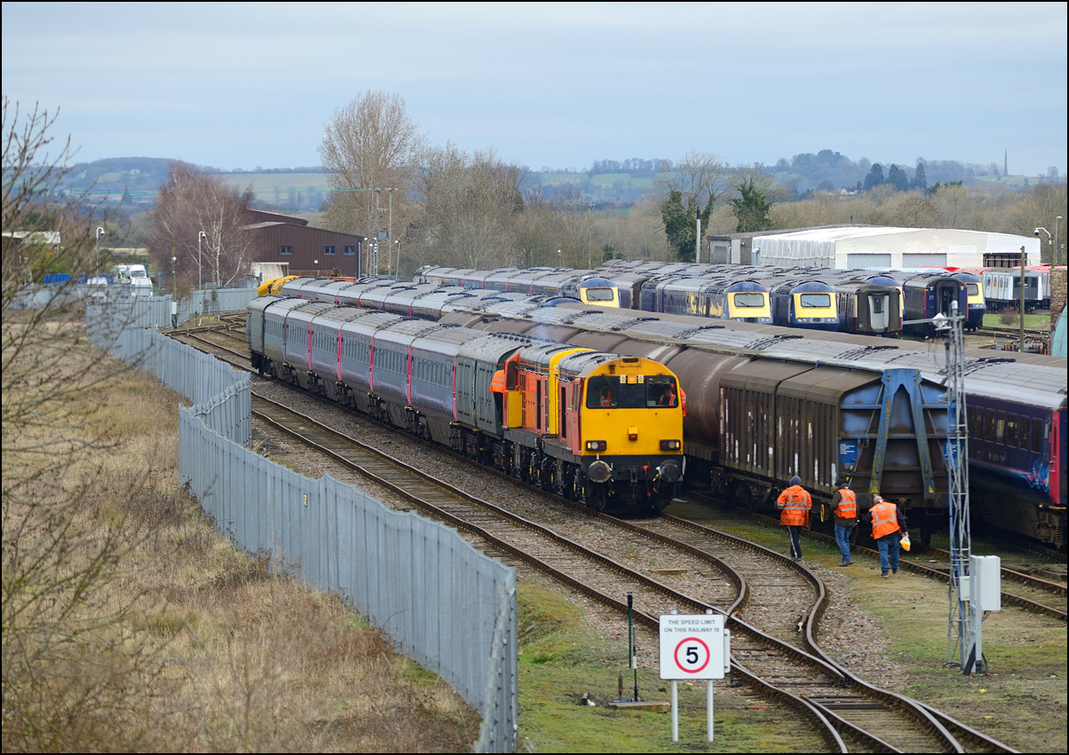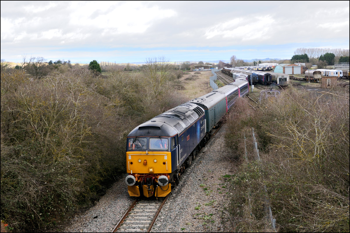 While I was waiting for the delayed 0Z43 from Derby I had a look at the recently arrived stock in the storage site at Long Marston. Here is a distant view of a Virgin HST with, in the background, some Midland and CR Mk III stock, the latter of which arrived last Sunday. The black sky over the depot was, luckily, passing away from the camera leaving some pleasant winter sunshine over me. |