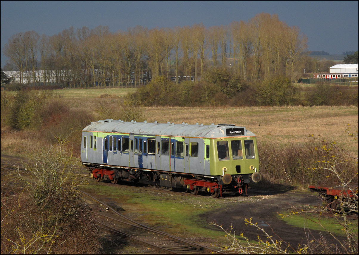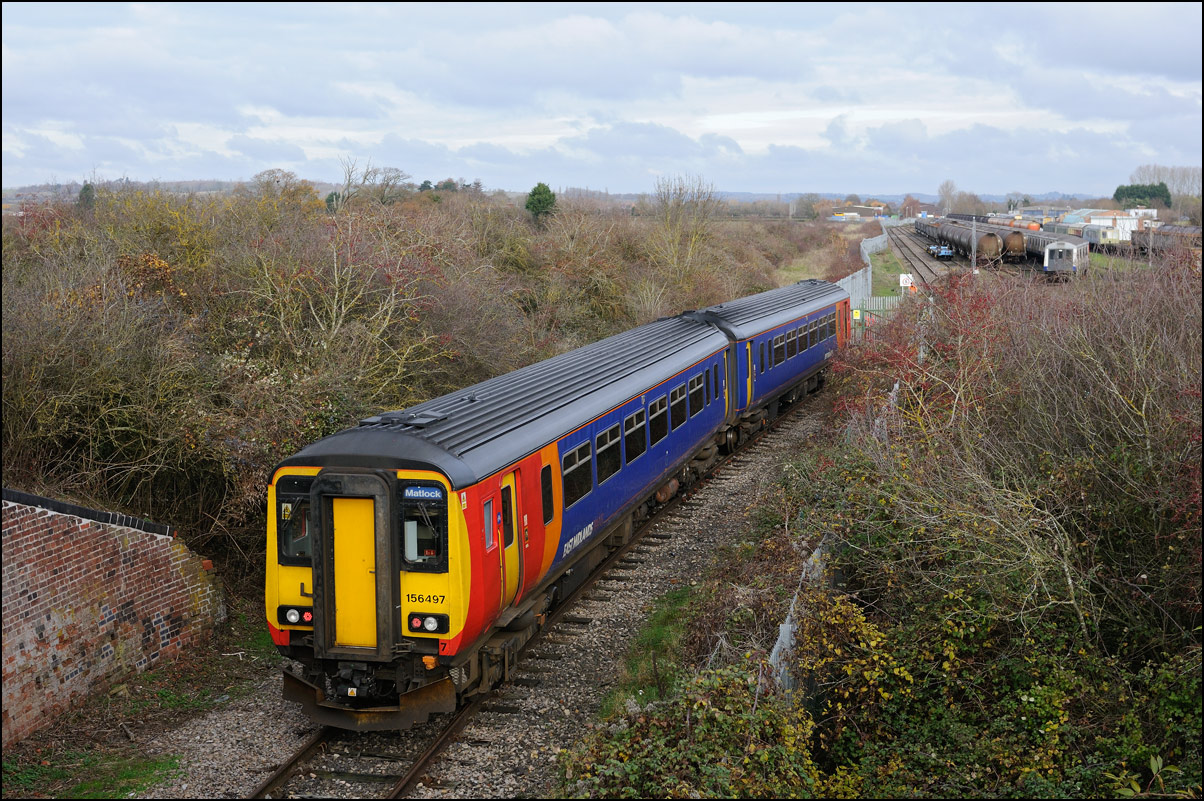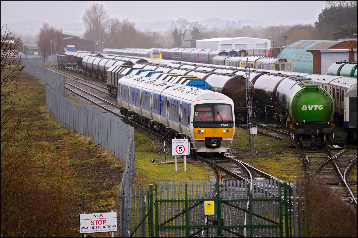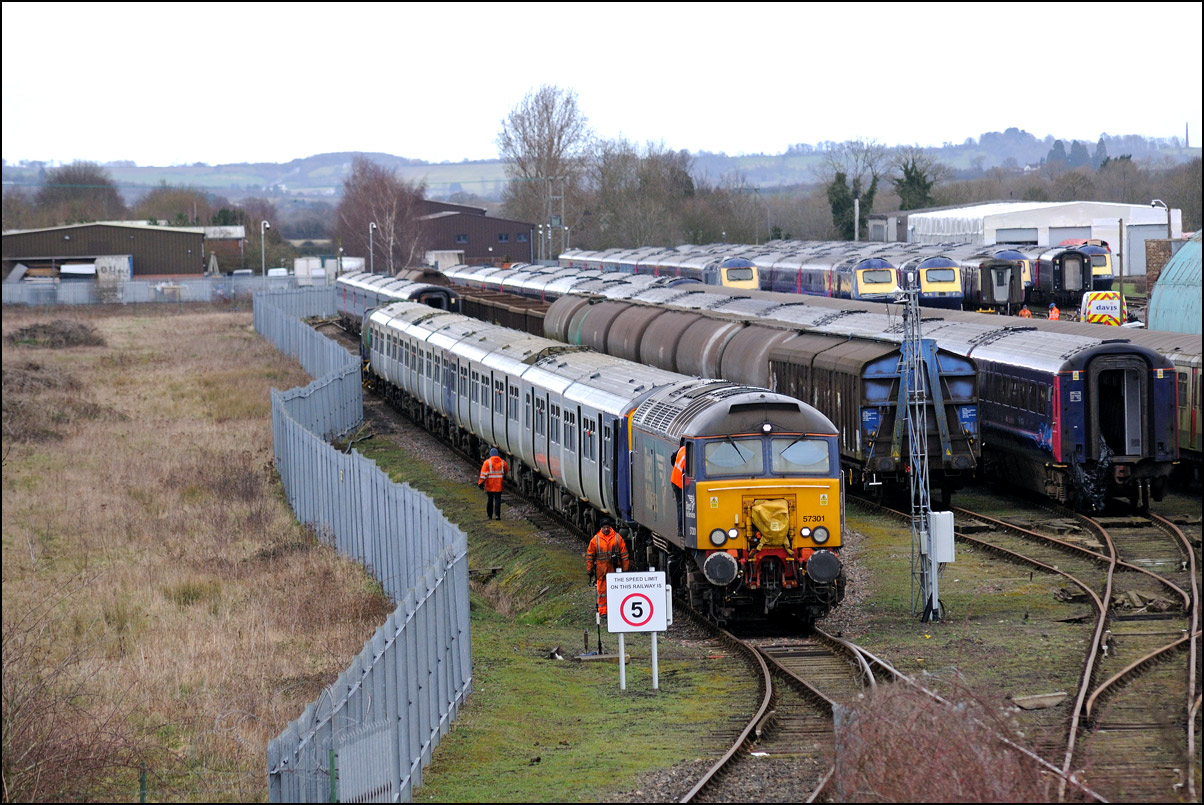 While I was waiting for the delayed 0Z43 from Derby I had a look at the recently arrived stock in the storage site at Long Marston. Here is a distant view of a Virgin HST with, in the background, some Midland and CR Mk III stock, the latter of which arrived last Sunday. The black sky over the depot was, luckily, passing away from the camera leaving some pleasant winter sunshine over me. |