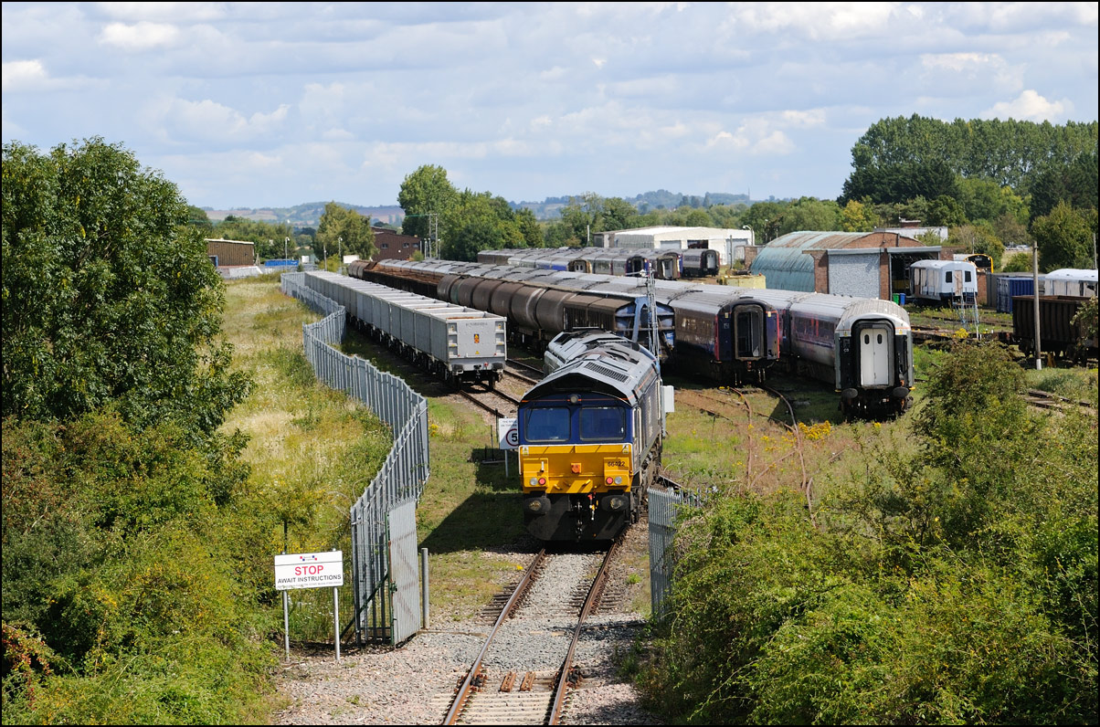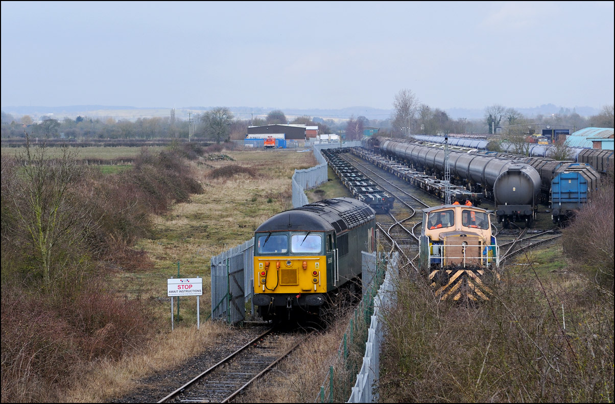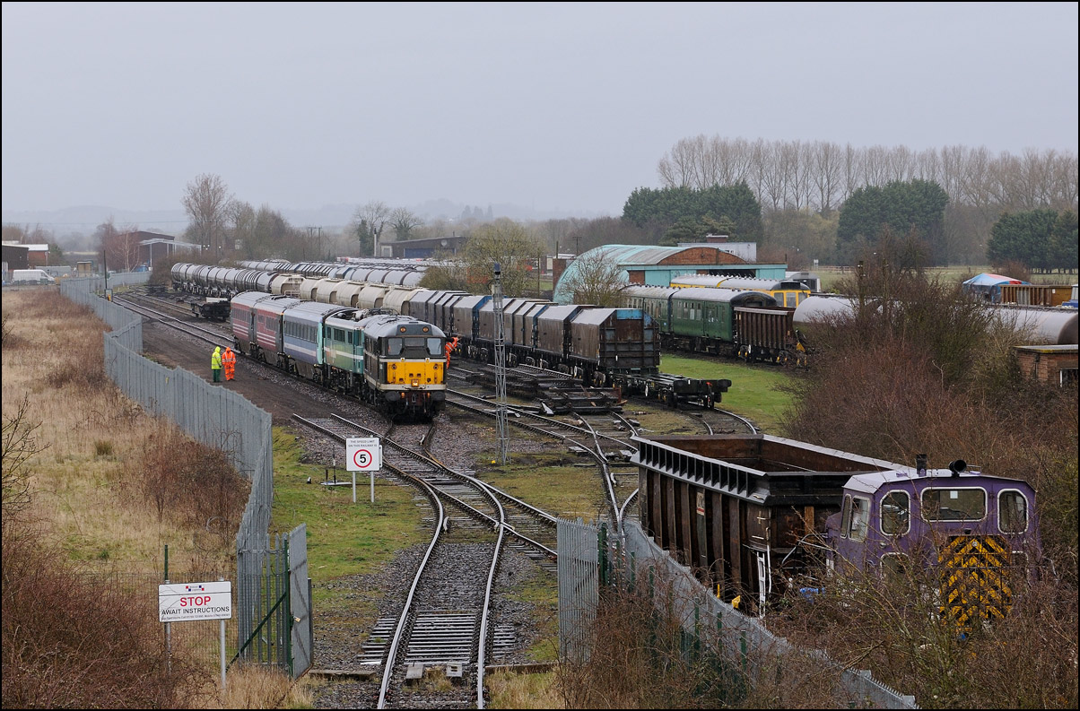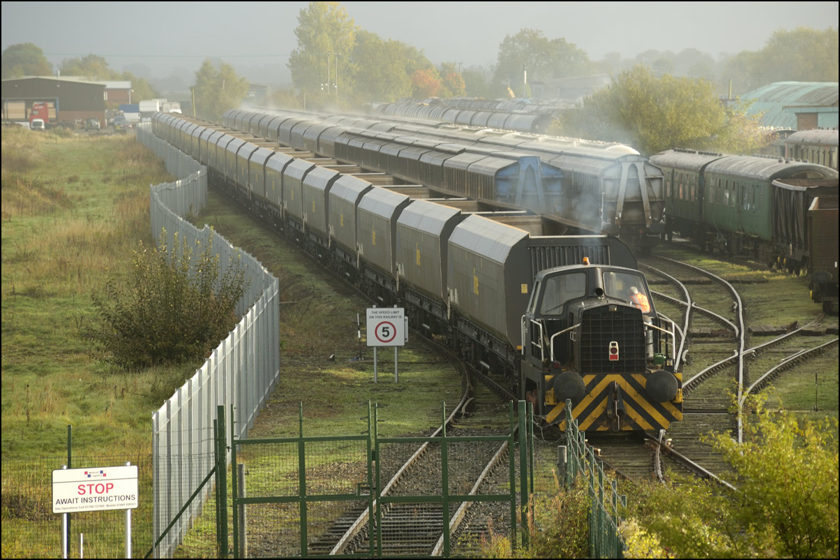 Once the train to Long Marston had entered the exchange sidings, HNRC 12082 was hooked onto the back to take the stock into the secure area, and to release the 66. In earlier times, the loco would simply have used one of the other roads, but as the track is not in an especially good state these days, it was decided not to risk it. |