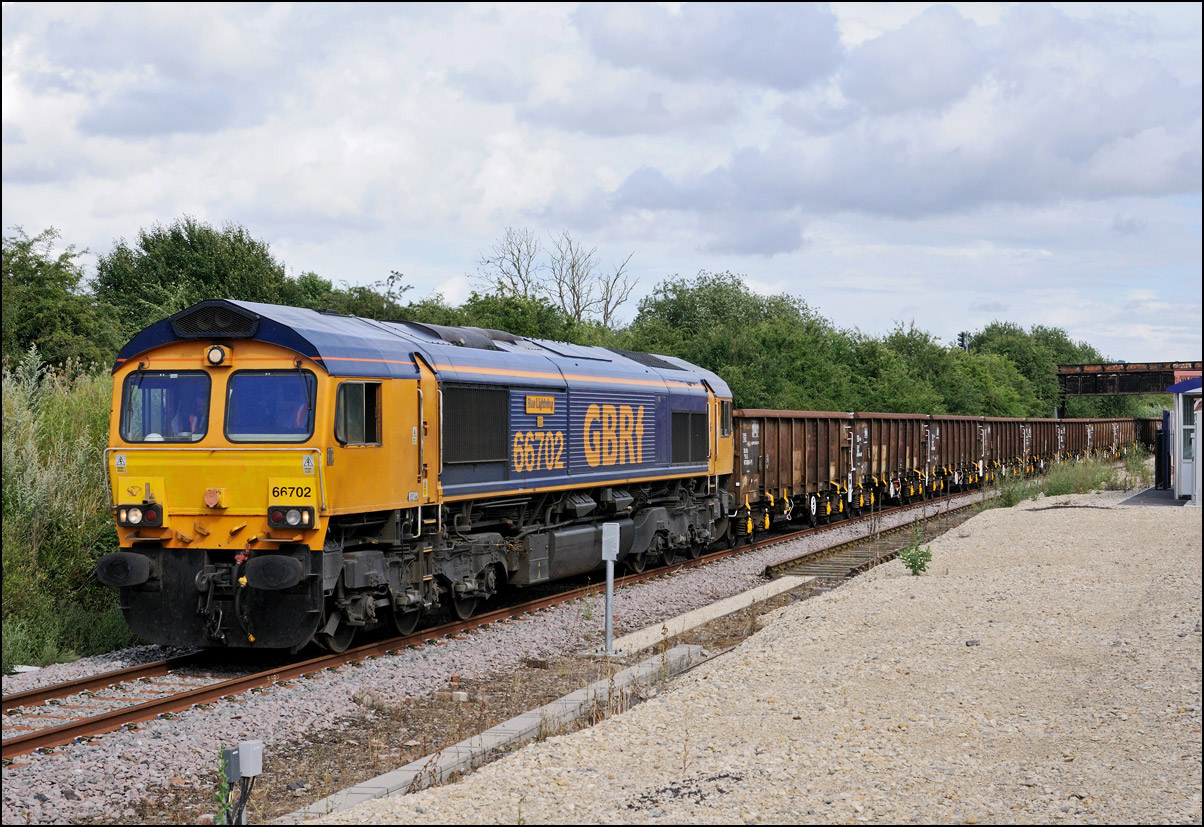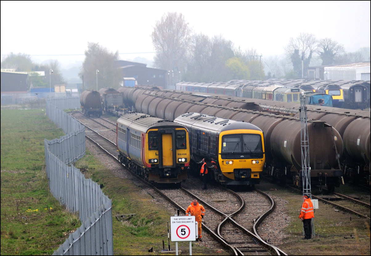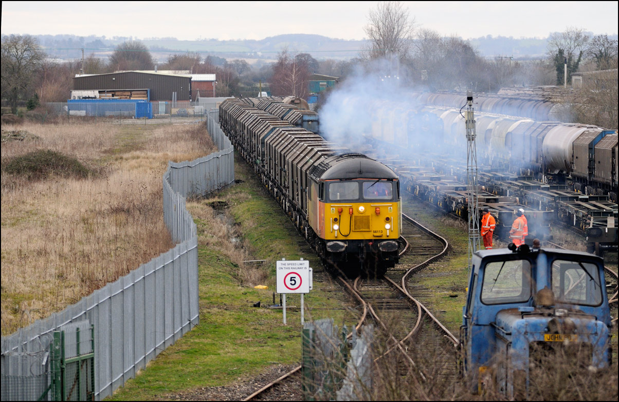 Once the train to Long Marston had entered the exchange sidings, HNRC 12082 was hooked onto the back to take the stock into the secure area, and to release the 66. In earlier times, the loco would simply have used one of the other roads, but as the track is not in an especially good state these days, it was decided not to risk it. |