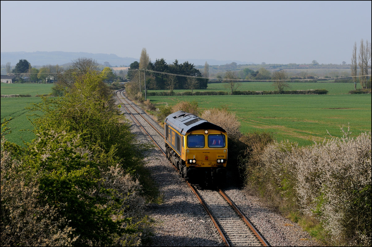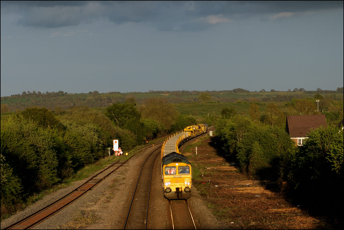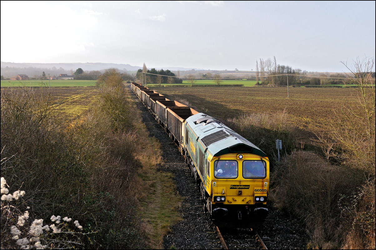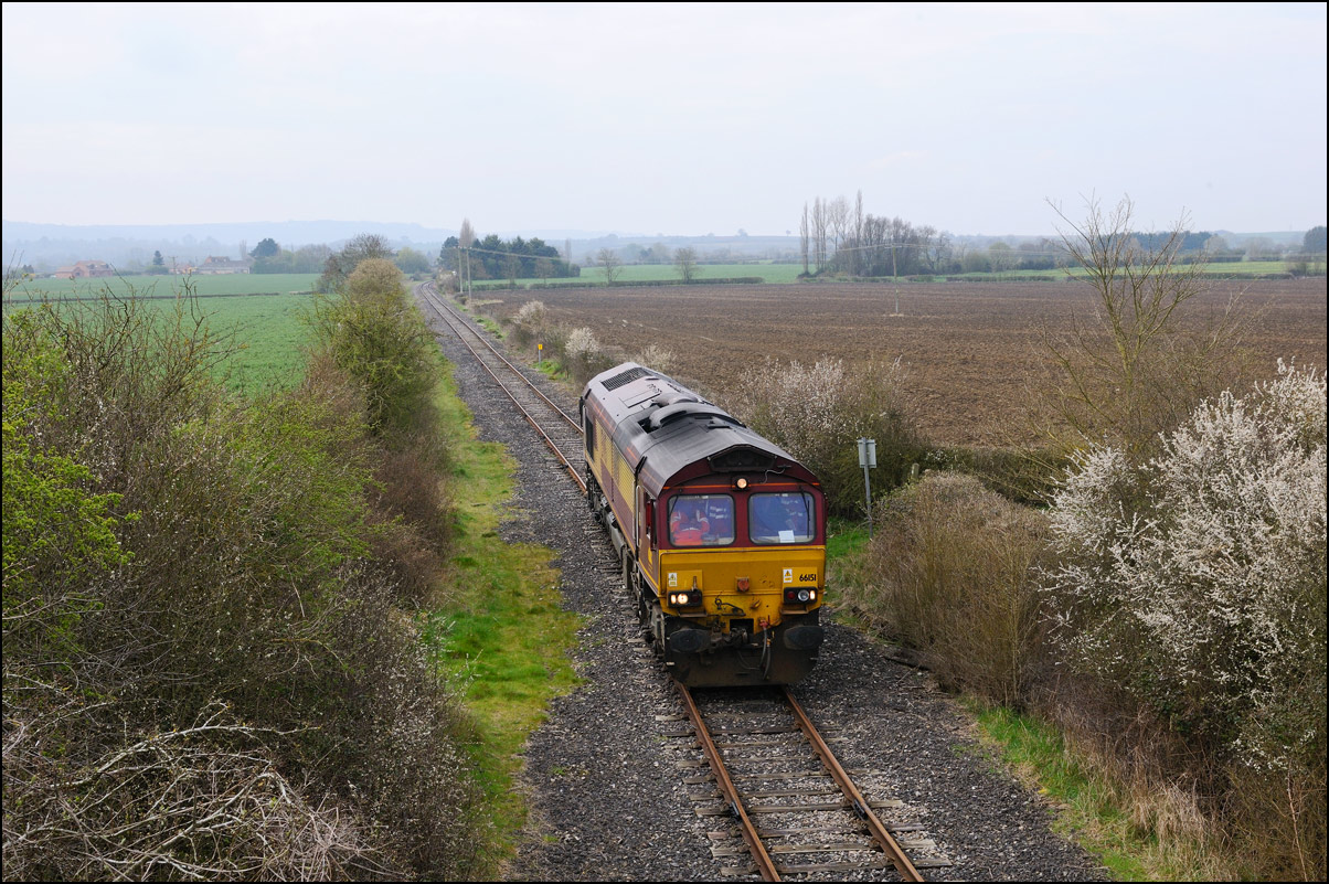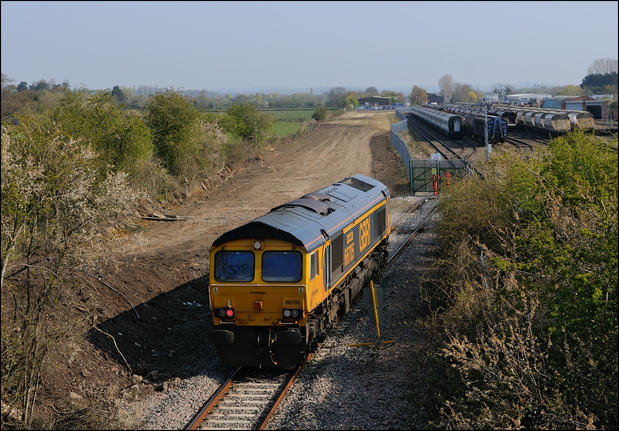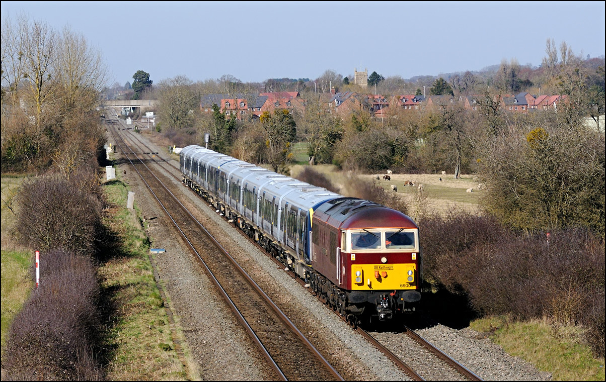 I had planned on taking 2, if not 3, shots of the Long Marston to Eastleigh train, 5Q89, on Tuesday 18 March 2025. The working was due to leave Long Marston at 12.34 but when I dropped in there at 11.55 the gate was closed and there was no sign of life or a maroon class 69 locomotive. I went to Honeybourne where again nothing was in sight so thought 5Q89 may have left early so headed towards the Gloucester main line, stopping in a lay-by to make a few calls. No-one in the usual spots had seen anything so I stayed put until a message and then RTT showed it had passed Evesham and must have been between Long Marston and Honeybourne when I looked. Off then to Claydon in beautiful light until it appeared on the Railcam maps at Norton Junction some 7 minutes late. Eleven minutes later the bright double headlights appeared passing Ashchurch station before coming up the bank to Claydon bridge with the new houses and the tower of St Nicholas' church prominent in the background. |