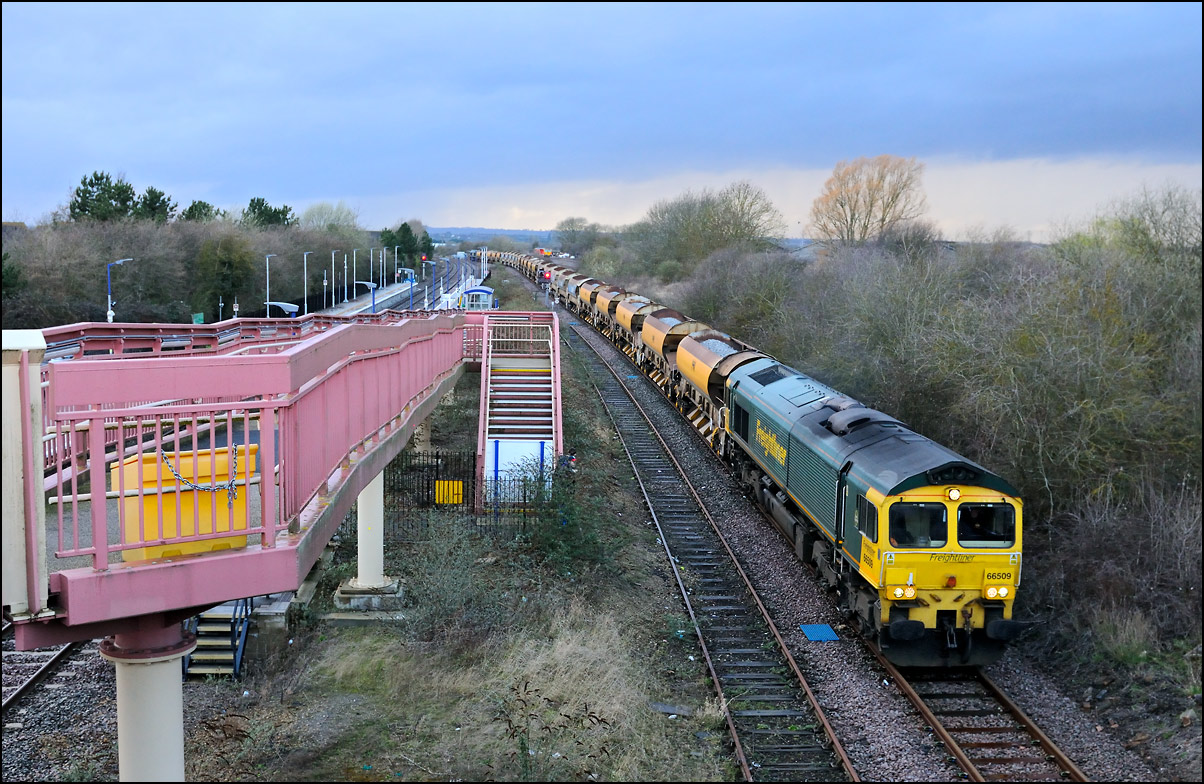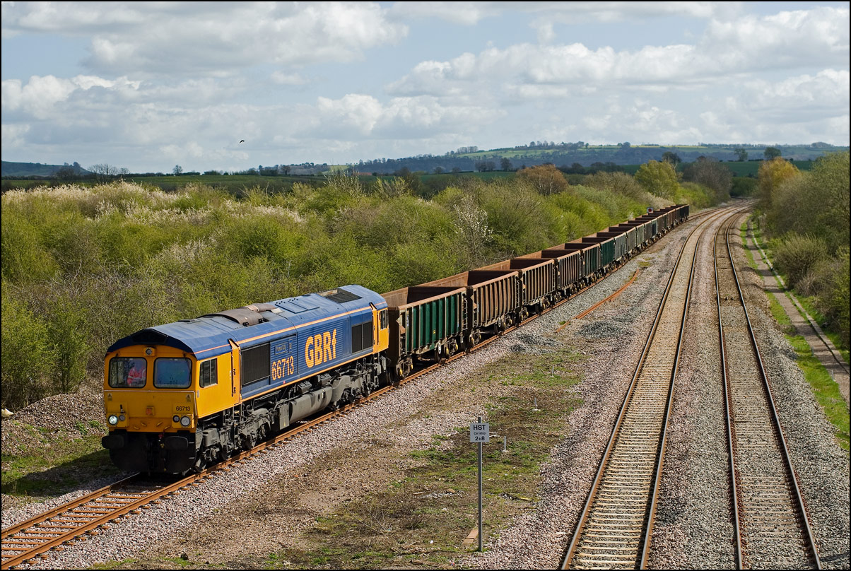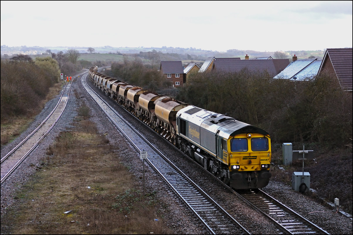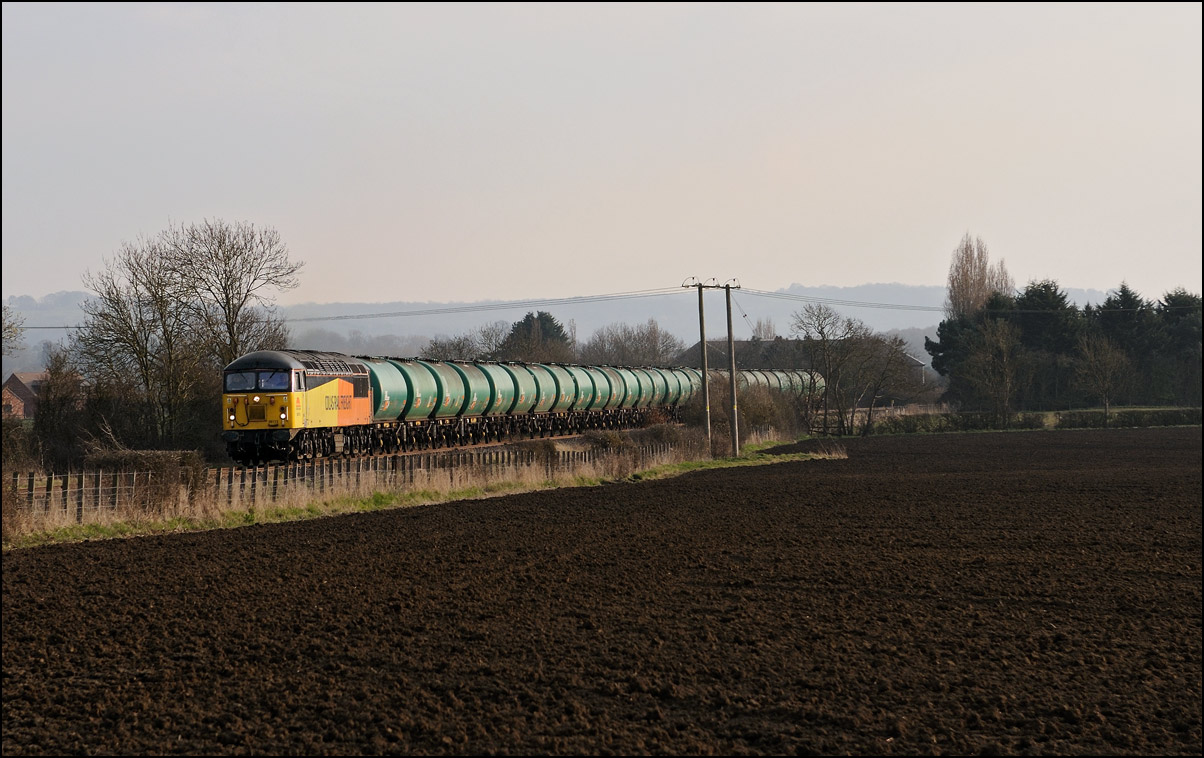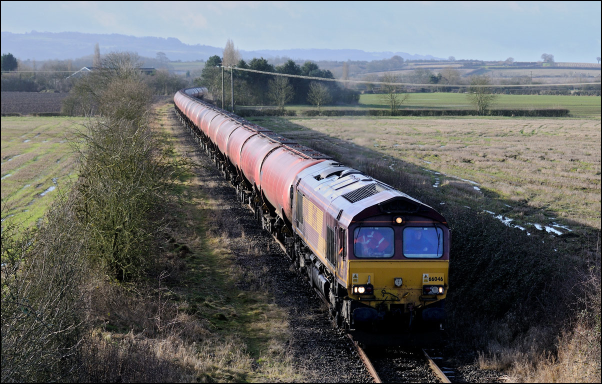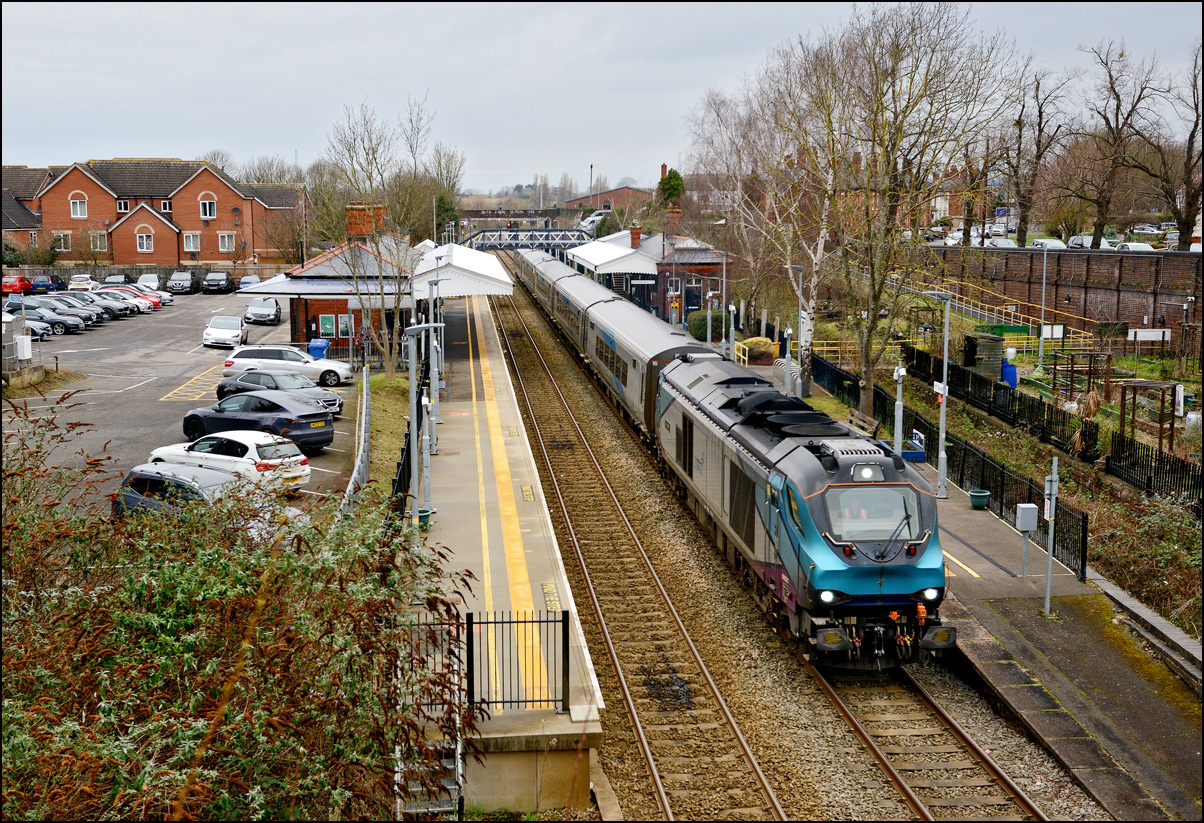 I had planned on taking 2, if not 3, shots of the Long Marston to Eastleigh train, 5Q89, on Tuesday 18 March 2025. The working was due to leave Long Marston at 12.34 but when I dropped in there at 11.55 the gate was closed and there was no sign of life or a maroon class 69 locomotive. I went to Honeybourne where again nothing was in sight so thought 5Q89 may have left early so headed towards the Gloucester main line, stopping in a lay-by to make a few calls. No-one in the usual spots had seen anything so I stayed put until a message and then RTT showed it had passed Evesham and must have been between Long Marston and Honeybourne when I looked. Off then to Claydon in beautiful light until it appeared on the Railcam maps at Norton Junction some 7 minutes late. Eleven minutes later the bright double headlights appeared passing Ashchurch station before coming up the bank to Claydon bridge with the new houses and the tower of St Nicholas' church prominent in the background. |