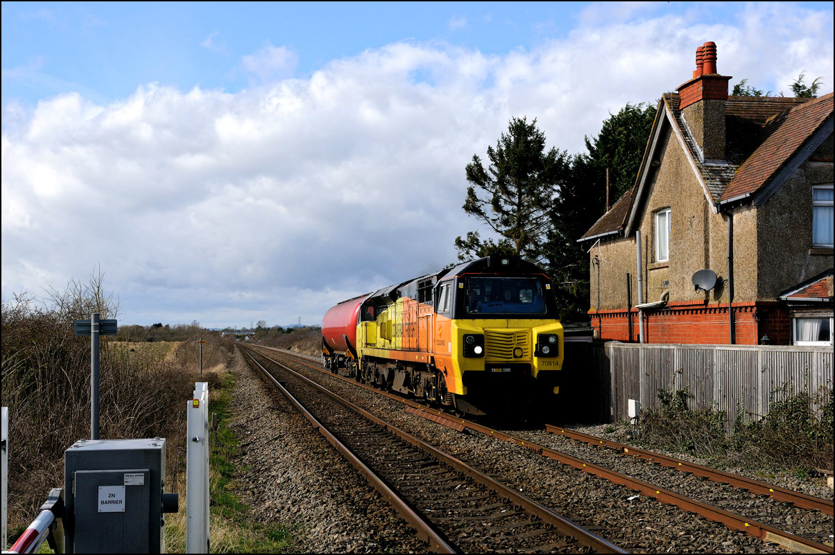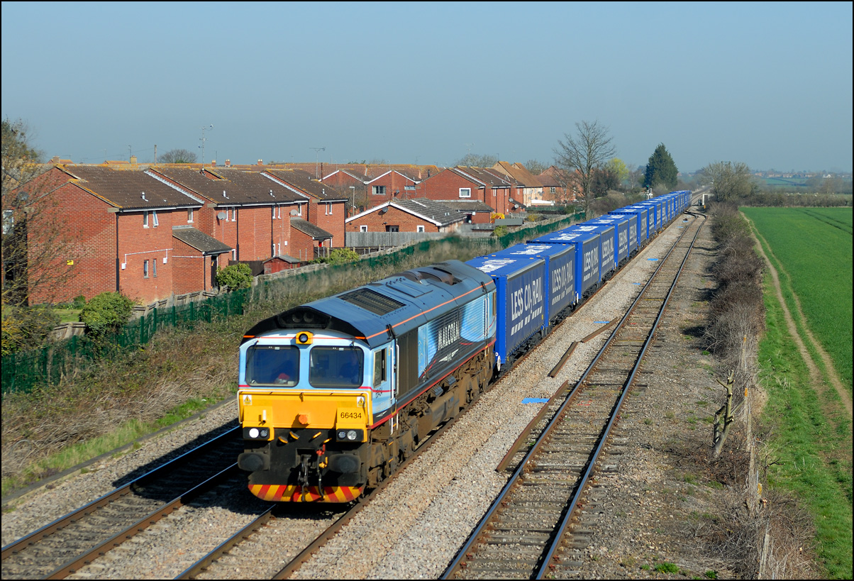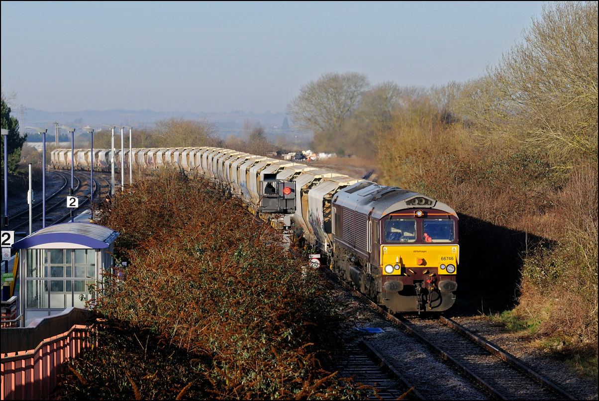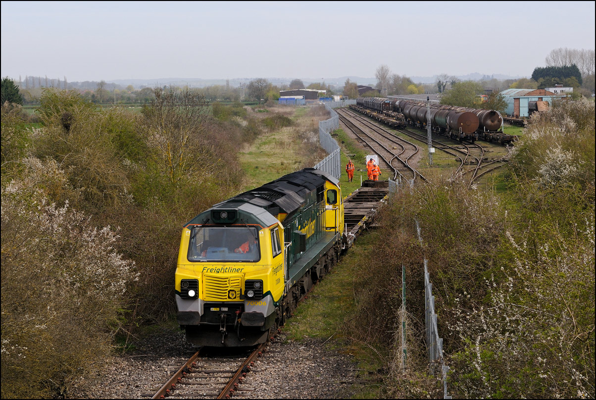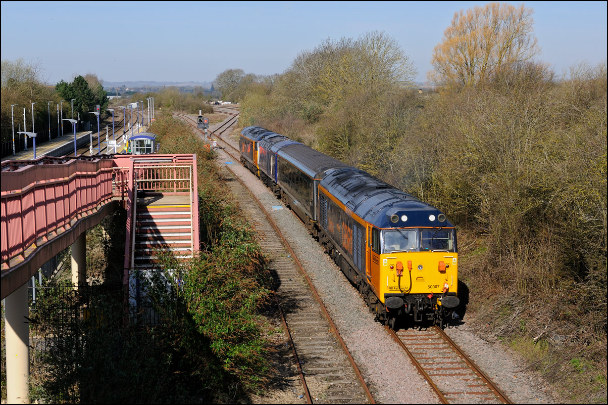I had planned on taking 2, if not 3, shots of the Long Marston to Eastleigh train, 5Q89, on Tuesday 18 March 2025. The working was due to leave Long Marston at 12.34 but when I dropped in there at 11.55 the gate was closed and there was no sign of life or a maroon class 69 locomotive. I went to Honeybourne where again nothing was in sight so thought 5Q89 may have left early so headed towards the Gloucester main line, stopping in a lay-by to make a few calls. No-one in the usual spots had seen anything so I stayed put until a message and then RTT showed it had passed Evesham and must have been between Long Marston and Honeybourne when I looked. Off then to Claydon in beautiful light until it appeared on the Railcam maps at Norton Junction some 7 minutes late. Eleven minutes later the bright double headlights appeared passing Ashchurch station before coming up the bank to Claydon bridge with the new houses and the tower of St Nicholas' church prominent in the background. |