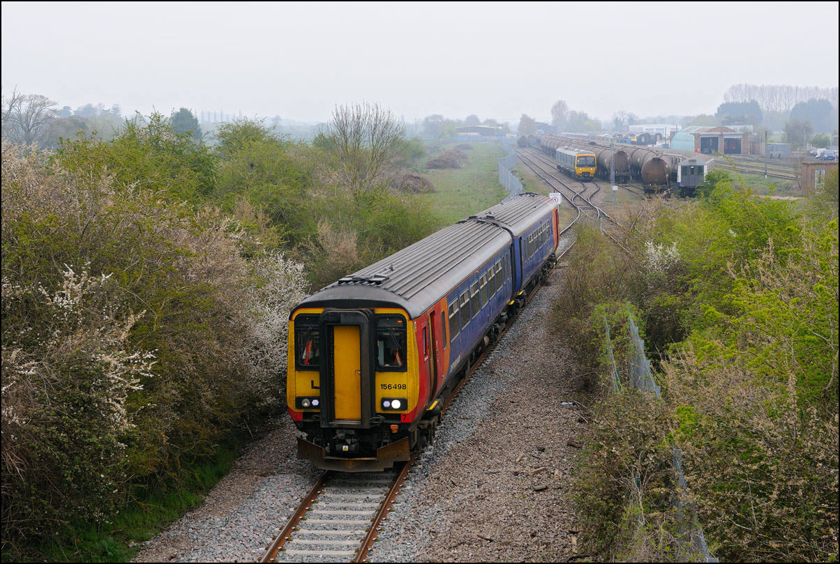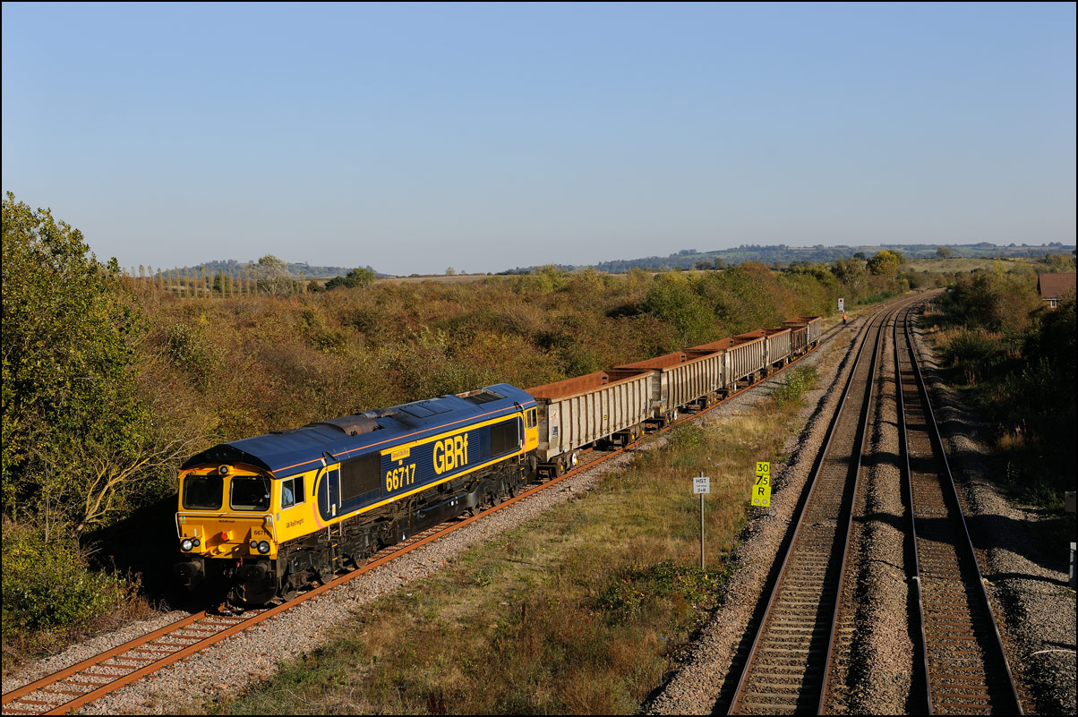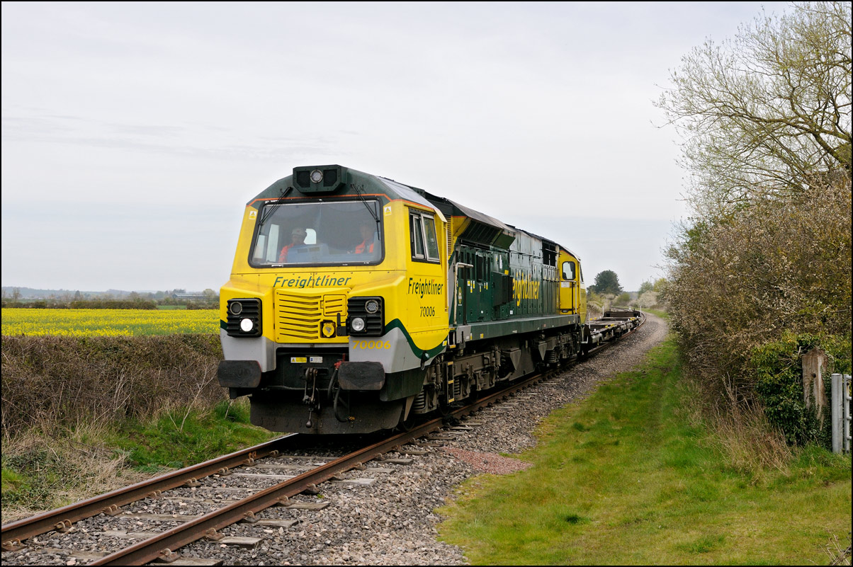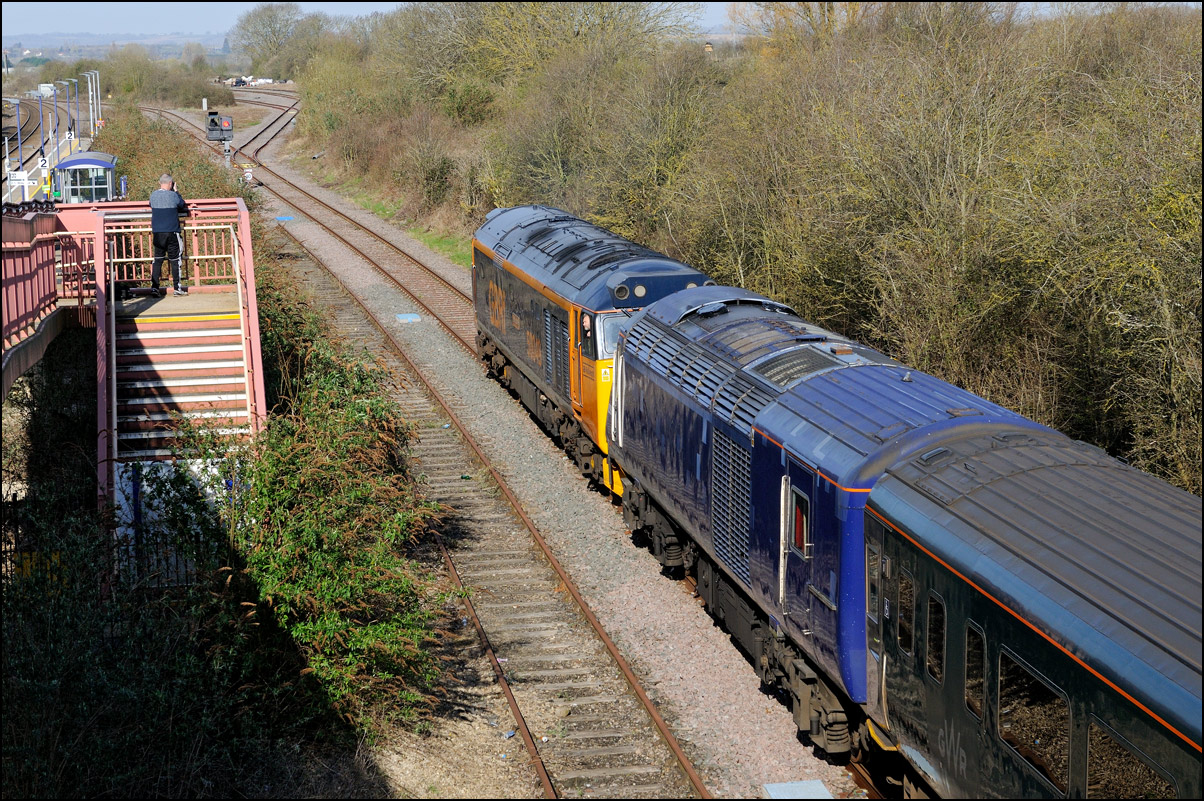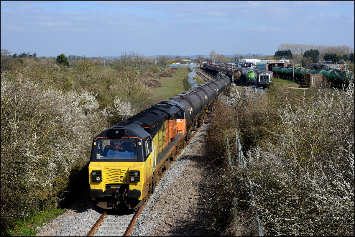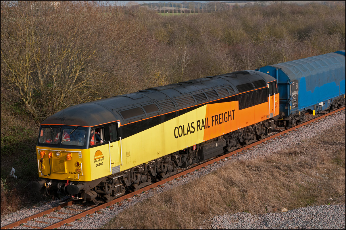 I had planned on taking 2, if not 3, shots of the Long Marston to Eastleigh train, 5Q89, on Tuesday 18 March 2025. The working was due to leave Long Marston at 12.34 but when I dropped in there at 11.55 the gate was closed and there was no sign of life or a maroon class 69 locomotive. I went to Honeybourne where again nothing was in sight so thought 5Q89 may have left early so headed towards the Gloucester main line, stopping in a lay-by to make a few calls. No-one in the usual spots had seen anything so I stayed put until a message and then RTT showed it had passed Evesham and must have been between Long Marston and Honeybourne when I looked. Off then to Claydon in beautiful light until it appeared on the Railcam maps at Norton Junction some 7 minutes late. Eleven minutes later the bright double headlights appeared passing Ashchurch station before coming up the bank to Claydon bridge with the new houses and the tower of St Nicholas' church prominent in the background. |