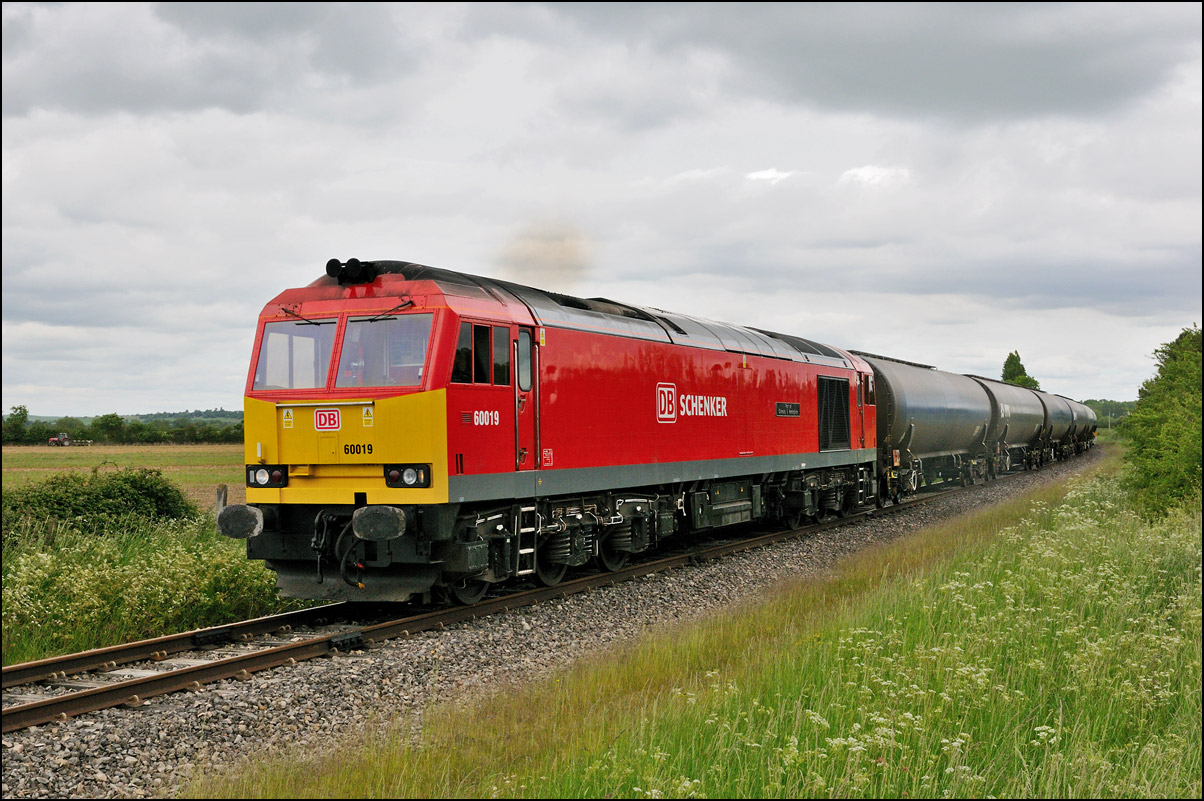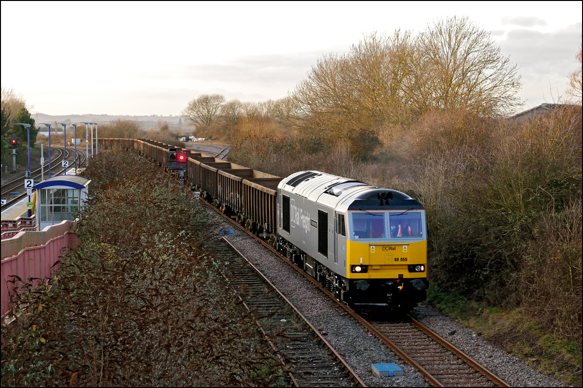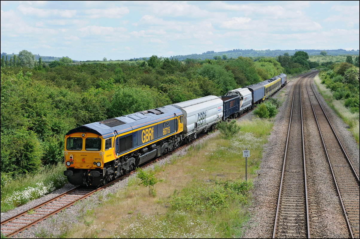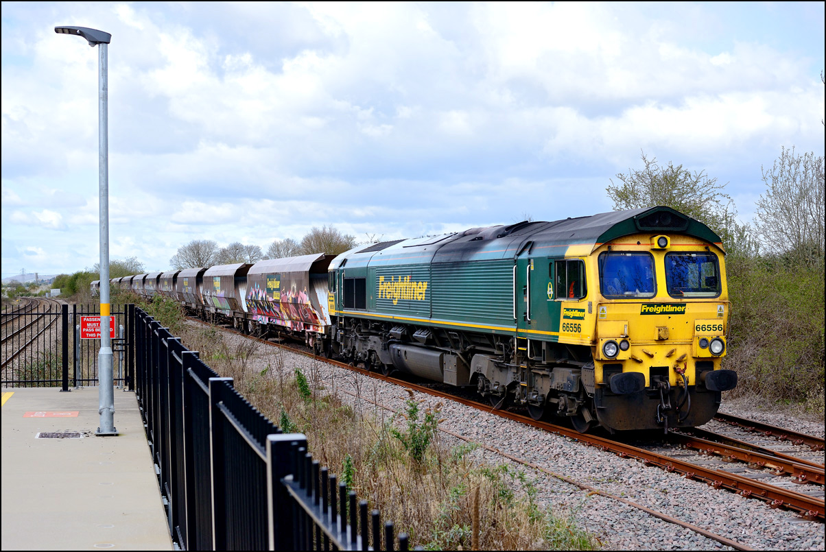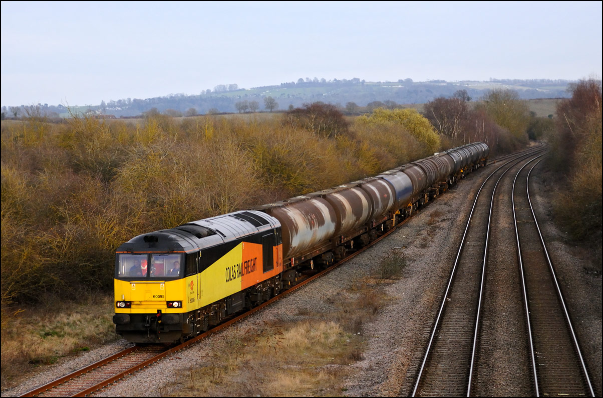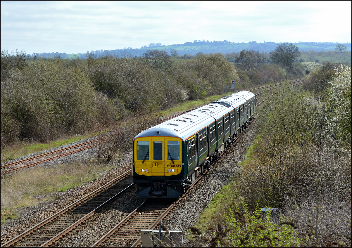 I had planned on taking 2, if not 3, shots of the Long Marston to Eastleigh train, 5Q89, on Tuesday 18 March 2025. The working was due to leave Long Marston at 12.34 but when I dropped in there at 11.55 the gate was closed and there was no sign of life or a maroon class 69 locomotive. I went to Honeybourne where again nothing was in sight so thought 5Q89 may have left early so headed towards the Gloucester main line, stopping in a lay-by to make a few calls. No-one in the usual spots had seen anything so I stayed put until a message and then RTT showed it had passed Evesham and must have been between Long Marston and Honeybourne when I looked. Off then to Claydon in beautiful light until it appeared on the Railcam maps at Norton Junction some 7 minutes late. Eleven minutes later the bright double headlights appeared passing Ashchurch station before coming up the bank to Claydon bridge with the new houses and the tower of St Nicholas' church prominent in the background. |