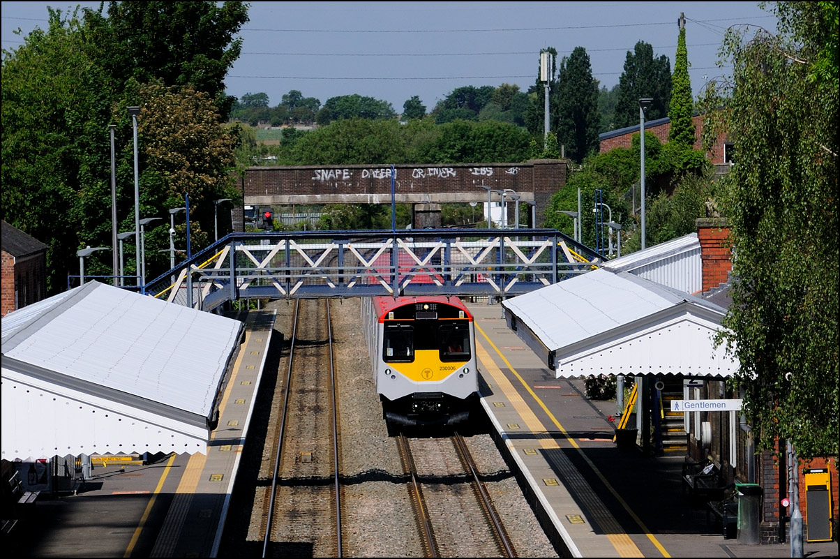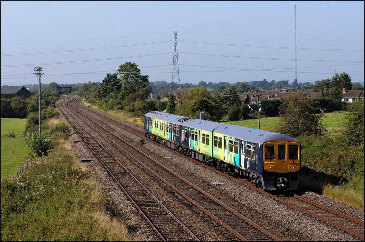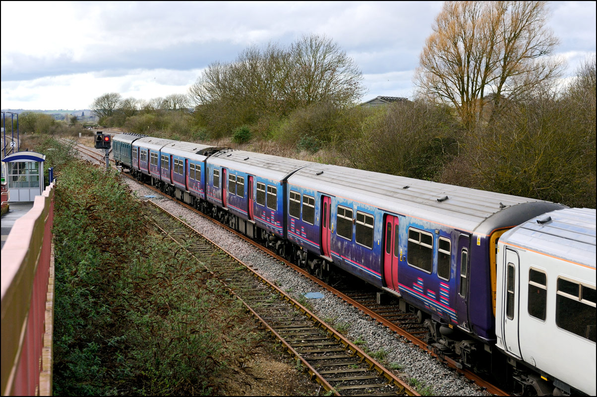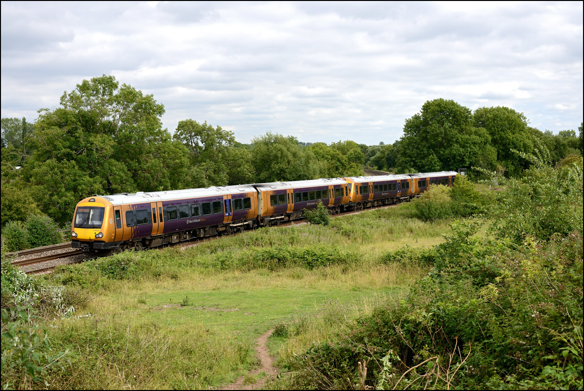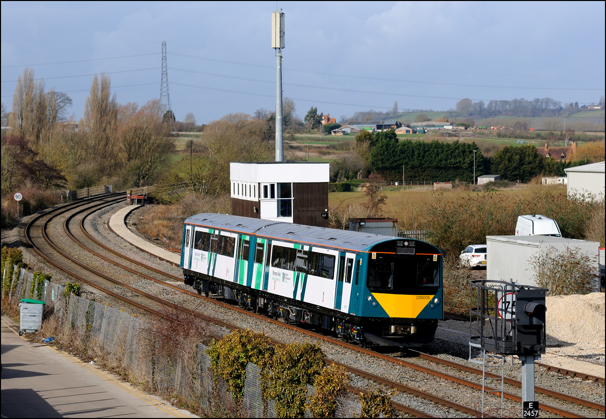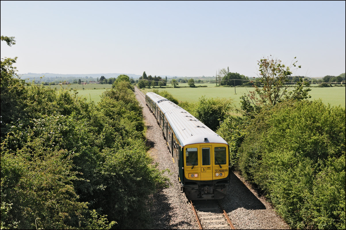 The run from the Staff Hut to the red signal protecting Honeybourne North Junction didn't take long but because of the unchecked lineside growth I had to change to a wide angle lens for even a head-on shot. The class 701s which seemed to have caused the late running are 701509 and 701512. |