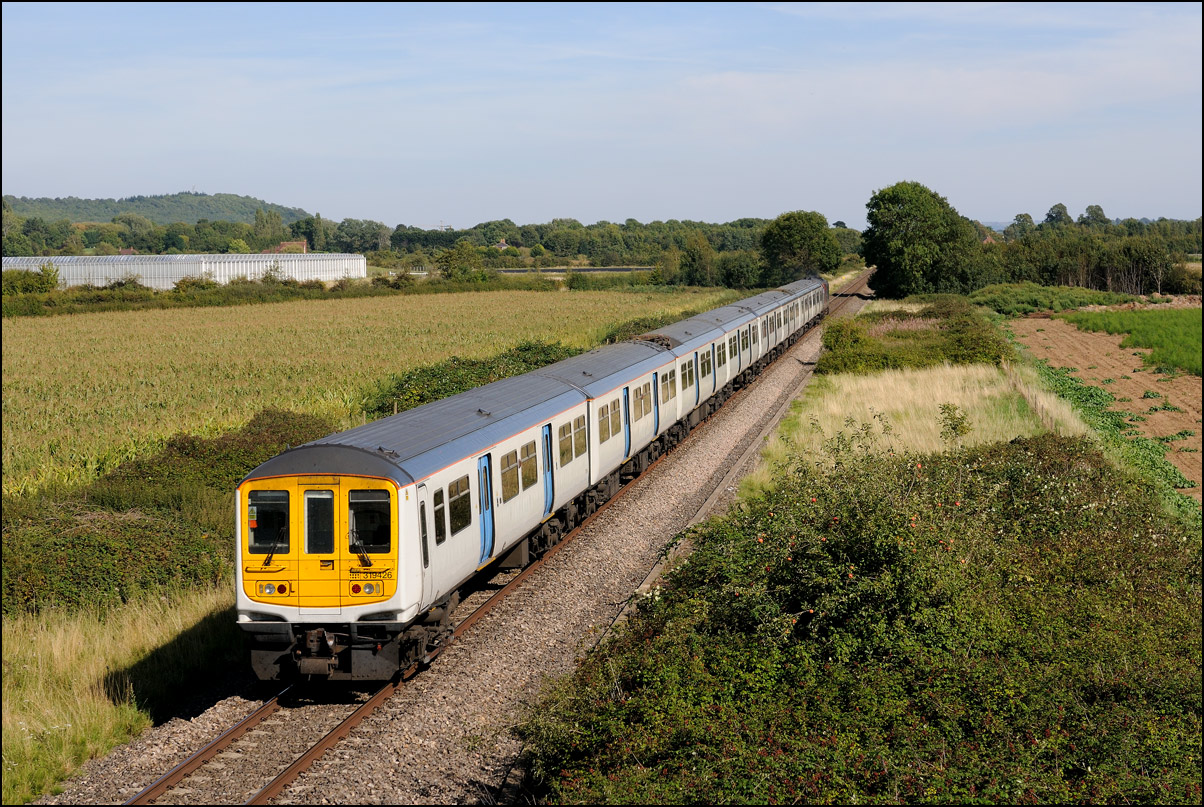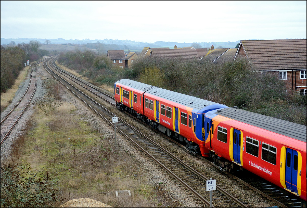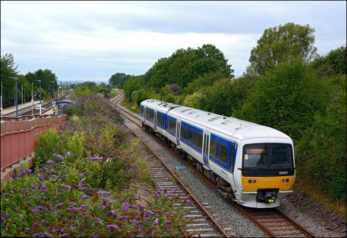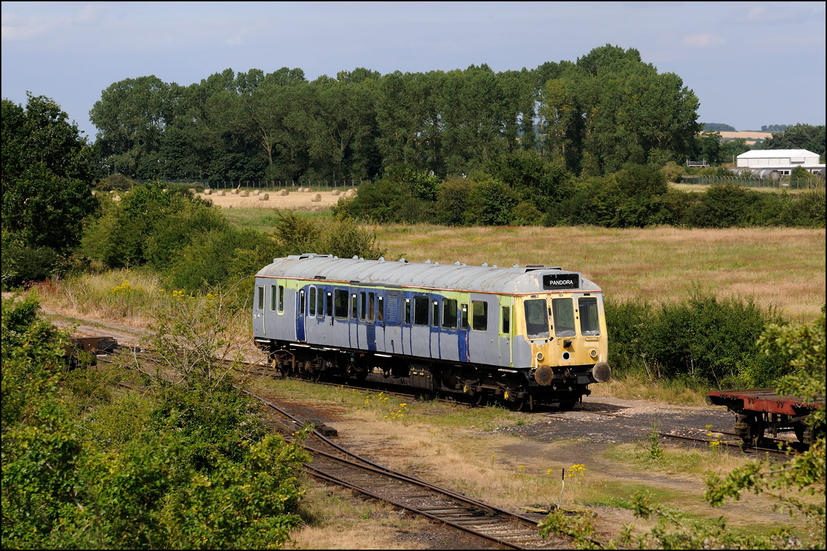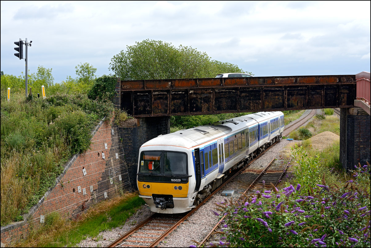 The run from the Staff Hut to the red signal protecting Honeybourne North Junction didn't take long but because of the unchecked lineside growth I had to change to a wide angle lens for even a head-on shot. The class 701s which seemed to have caused the late running are 701509 and 701512. |