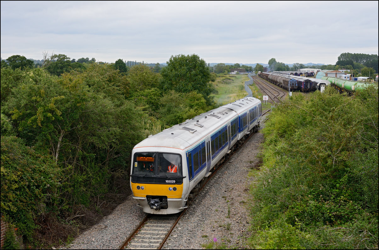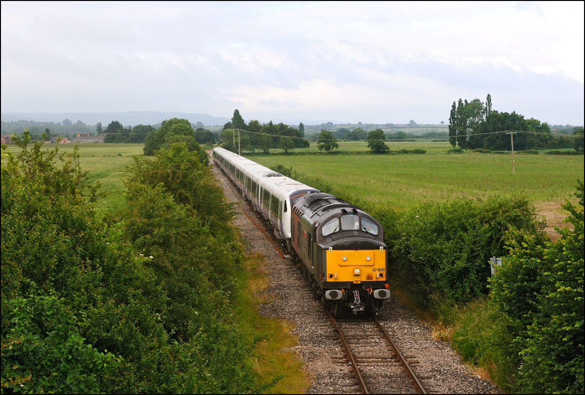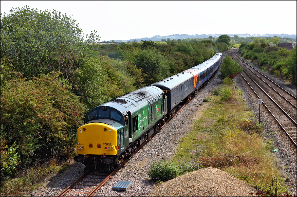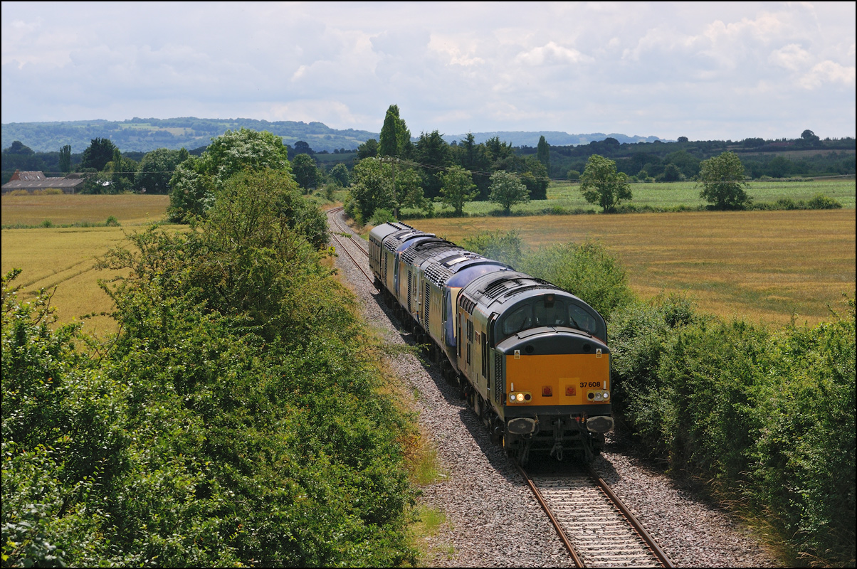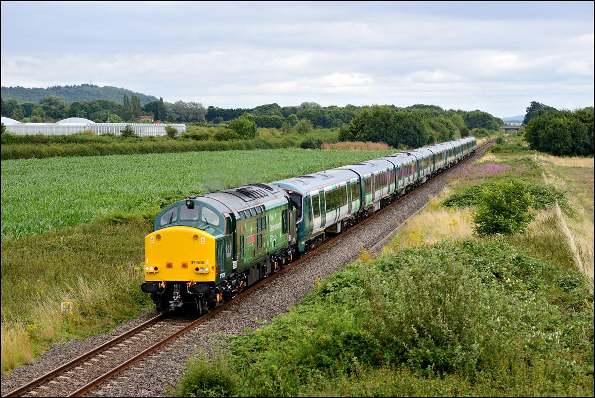Two class 730 DMUs were taken from Willesden to Long Marston on 5 August 2024 with 37608 providing the power. The light was very poor and it was running late so I didn't go out but it was sunny at home when the delayed return with 2 other units was probably due to leave so had a drive to Lower Moor (with long delays due to roadworks on the road from Evesham...) arriving with what I guessed would be a wait of about 20 minutes. I had left my phone in my other car so with no-one else there I had no idea if 5Q72 was running or when it might appear. A headlight appeared in the distance and with there being no chance of anything else being on the line it had to 37608 with 730205 + 730220 (I think). The sun had long since gone and there was a bit too much green around in the flat light so not a good choice of location... |