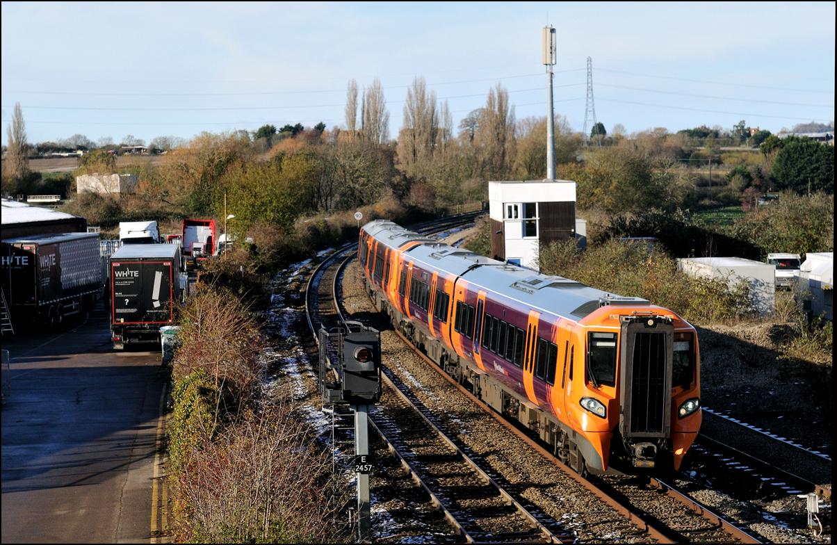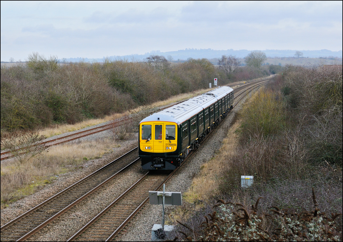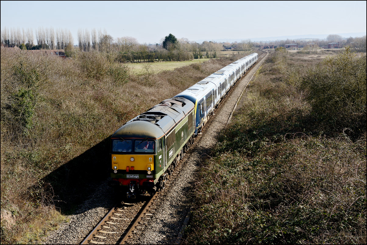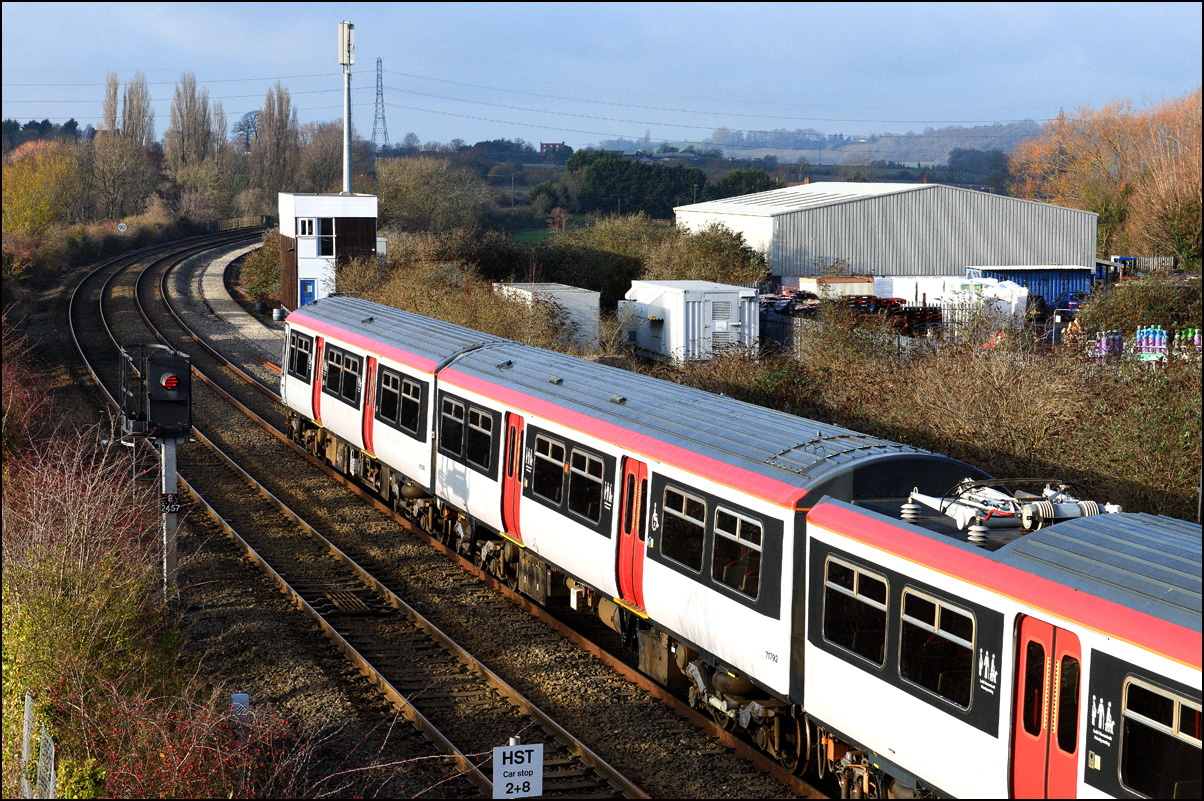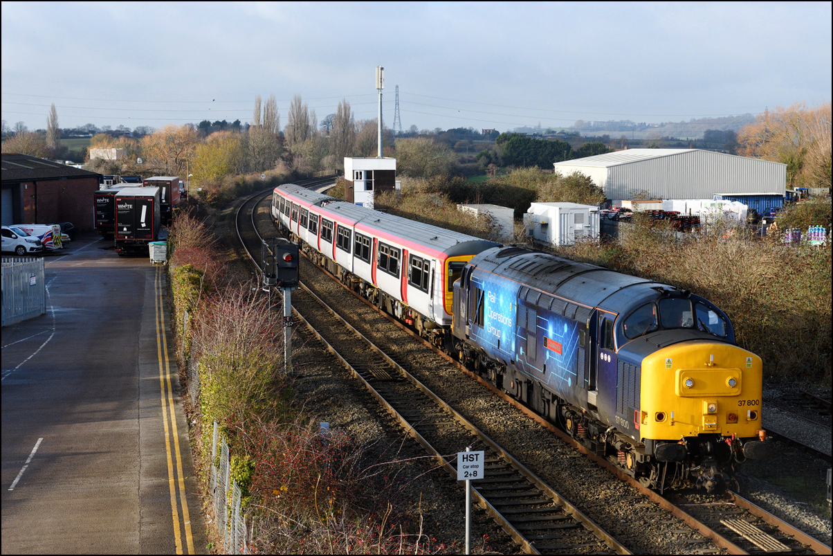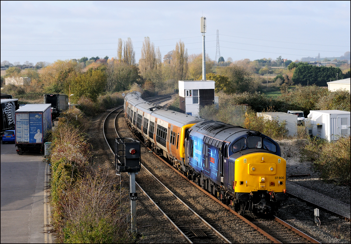 Another of the seemingly endless stock moves to Long Marston took place on Tuesday 16 December 2025 but it was slightly different to most of the recent drags in that a class 769 was involved. I'm as interested in the load being moved as the locomotive and so decided to have a trip out if it looked as if the weather might improve from the earlier cloud and rain. It did look OK to the south-west of Stratford-upon-Avon but it was too late by then to get to the spot I had planned and walked along a muddy footpath so just went to Evesham. The train, hauled by 37800 with 769421 working as 5Q94 from Allerton Depot, was about three minutes early when it passed the signalbox with the shadows not being as intrusive as it had first appeared. It just over 12 months ago when I photographed the same locomotive but with a class 321 in tow in the same spot. |