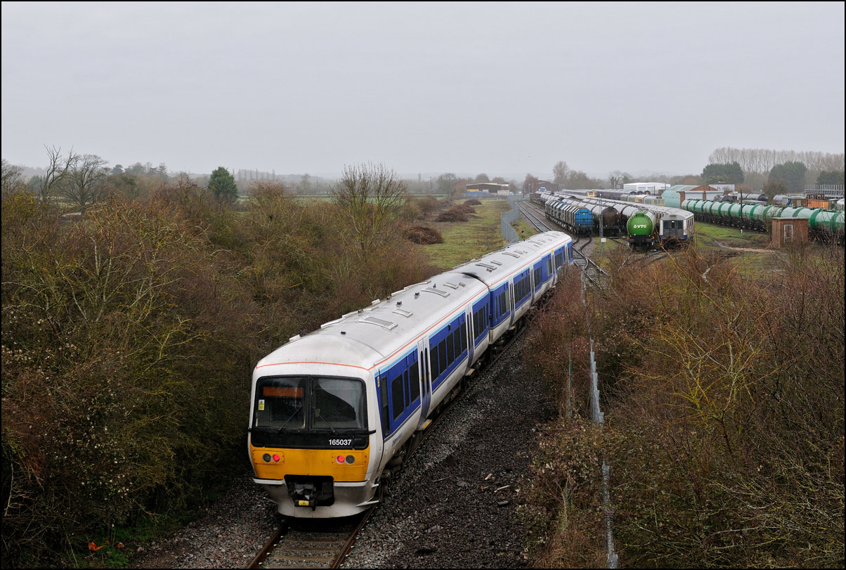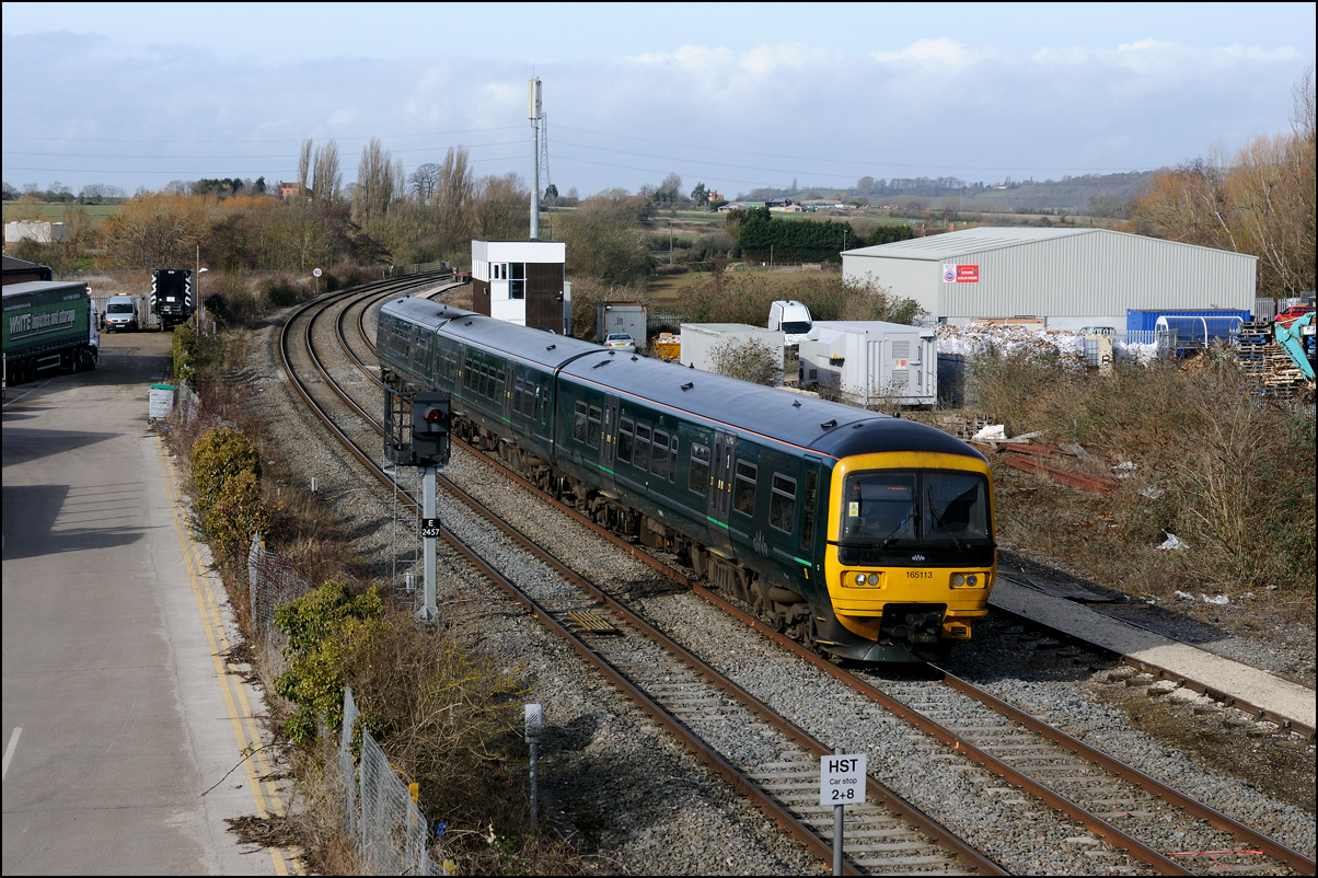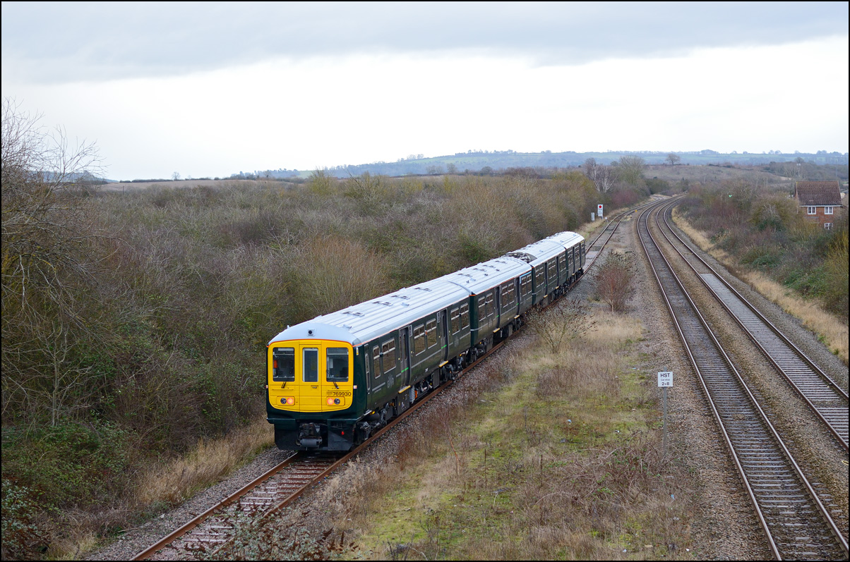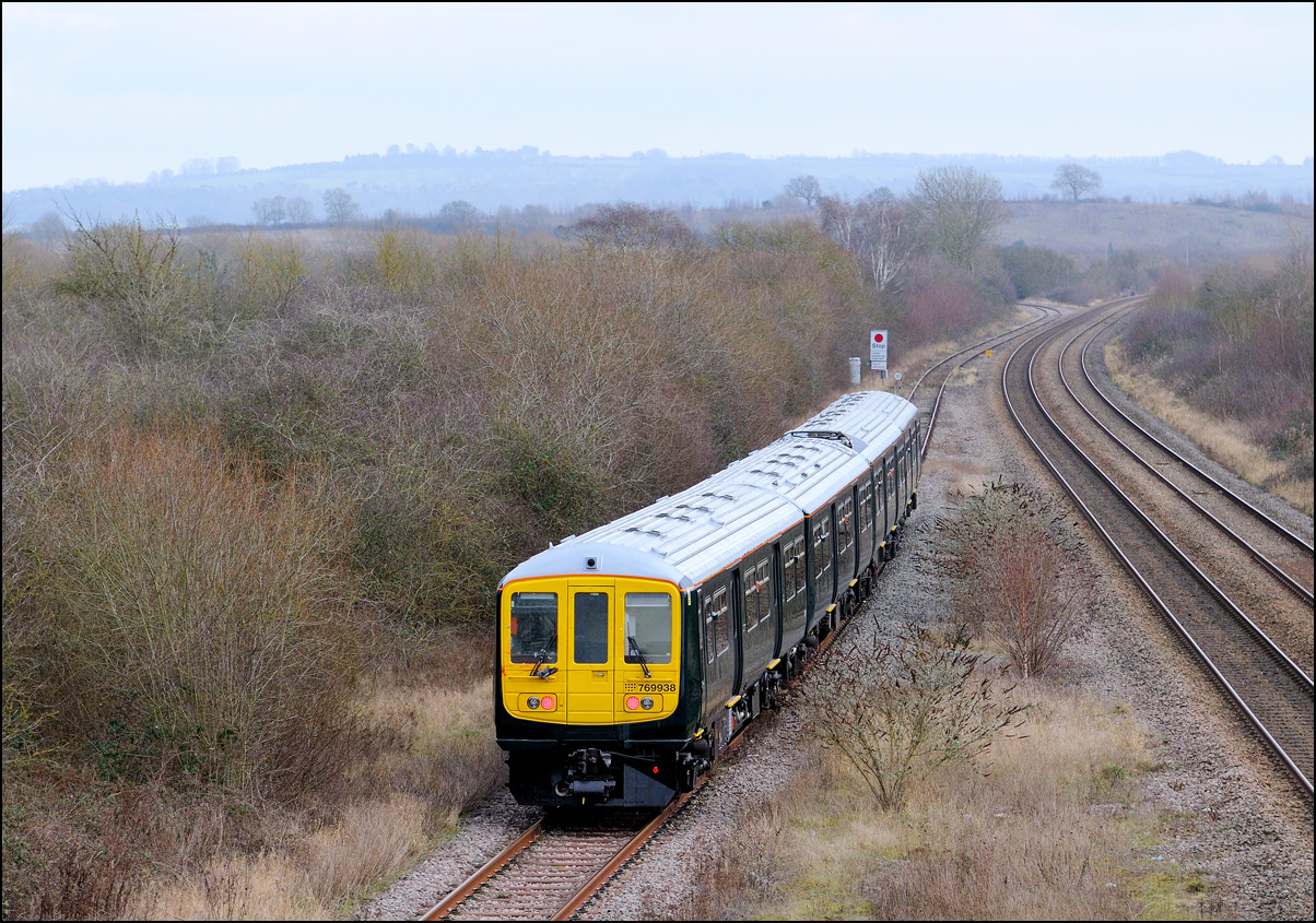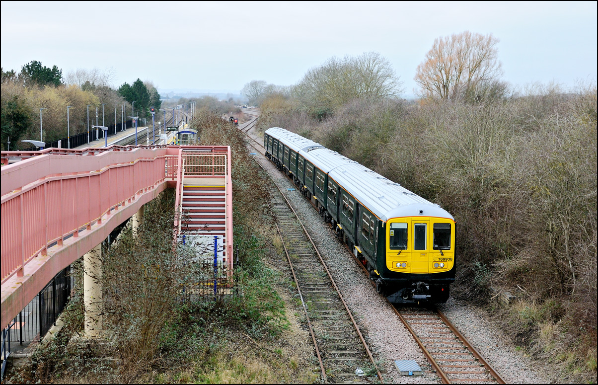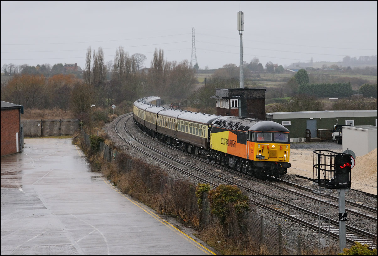 Another of the seemingly endless stock moves to Long Marston took place on Tuesday 16 December 2025 but it was slightly different to most of the recent drags in that a class 769 was involved. I'm as interested in the load being moved as the locomotive and so decided to have a trip out if it looked as if the weather might improve from the earlier cloud and rain. It did look OK to the south-west of Stratford-upon-Avon but it was too late by then to get to the spot I had planned and walked along a muddy footpath so just went to Evesham. The train, hauled by 37800 with 769421 working as 5Q94 from Allerton Depot, was about three minutes early when it passed the signalbox with the shadows not being as intrusive as it had first appeared. It just over 12 months ago when I photographed the same locomotive but with a class 321 in tow in the same spot. |