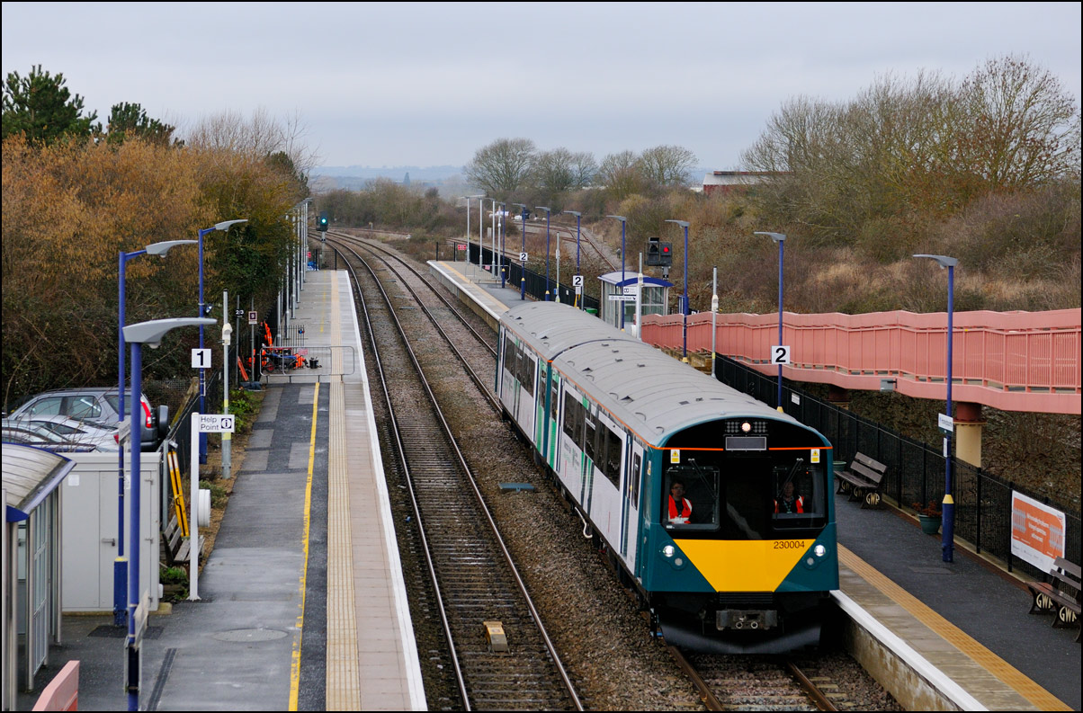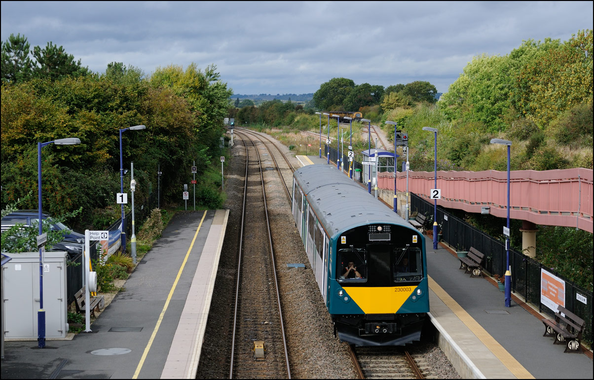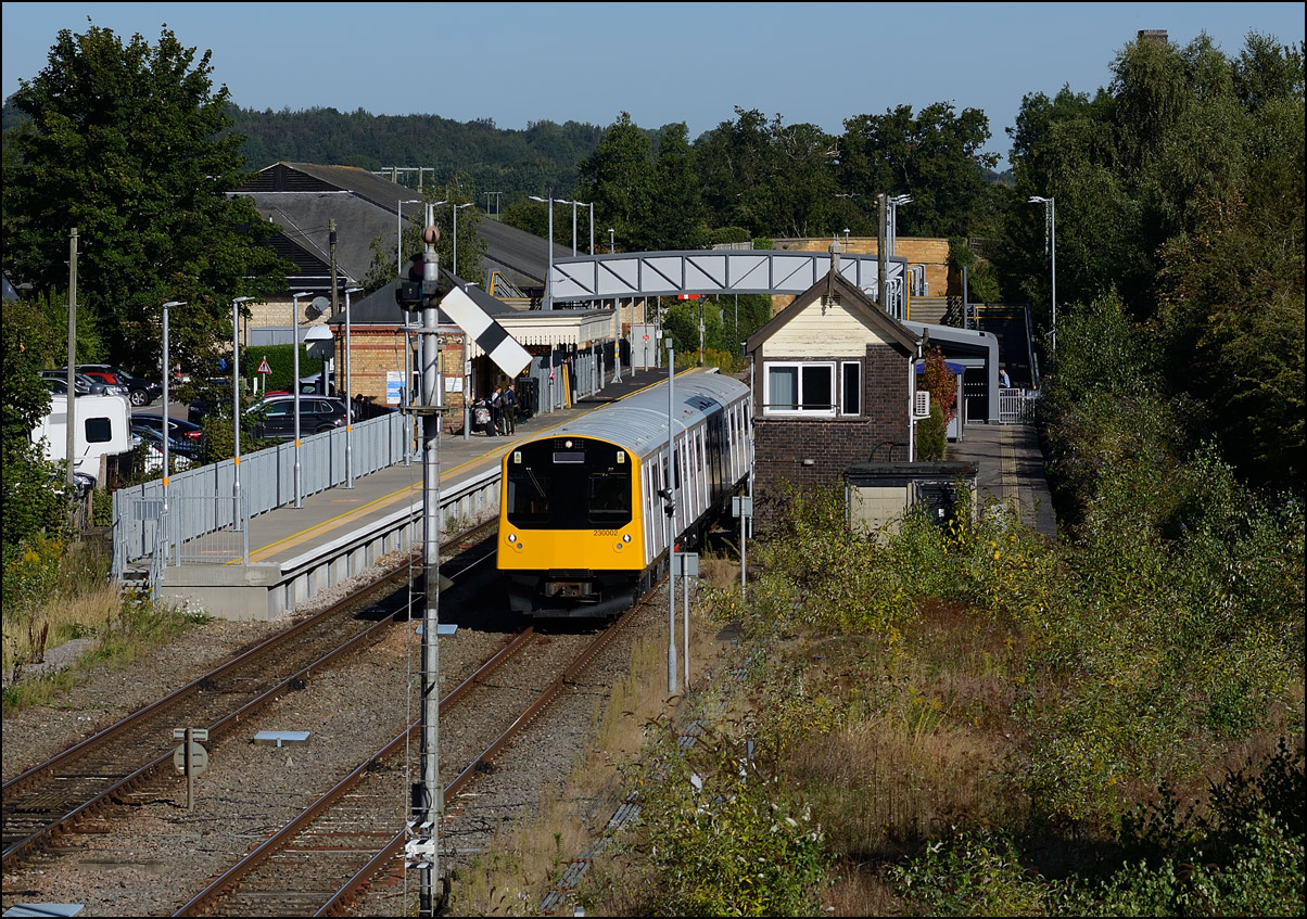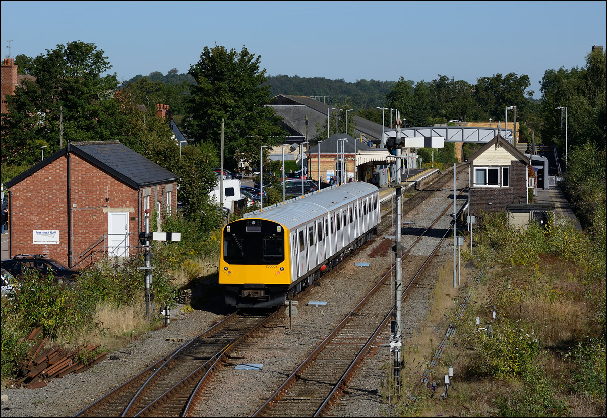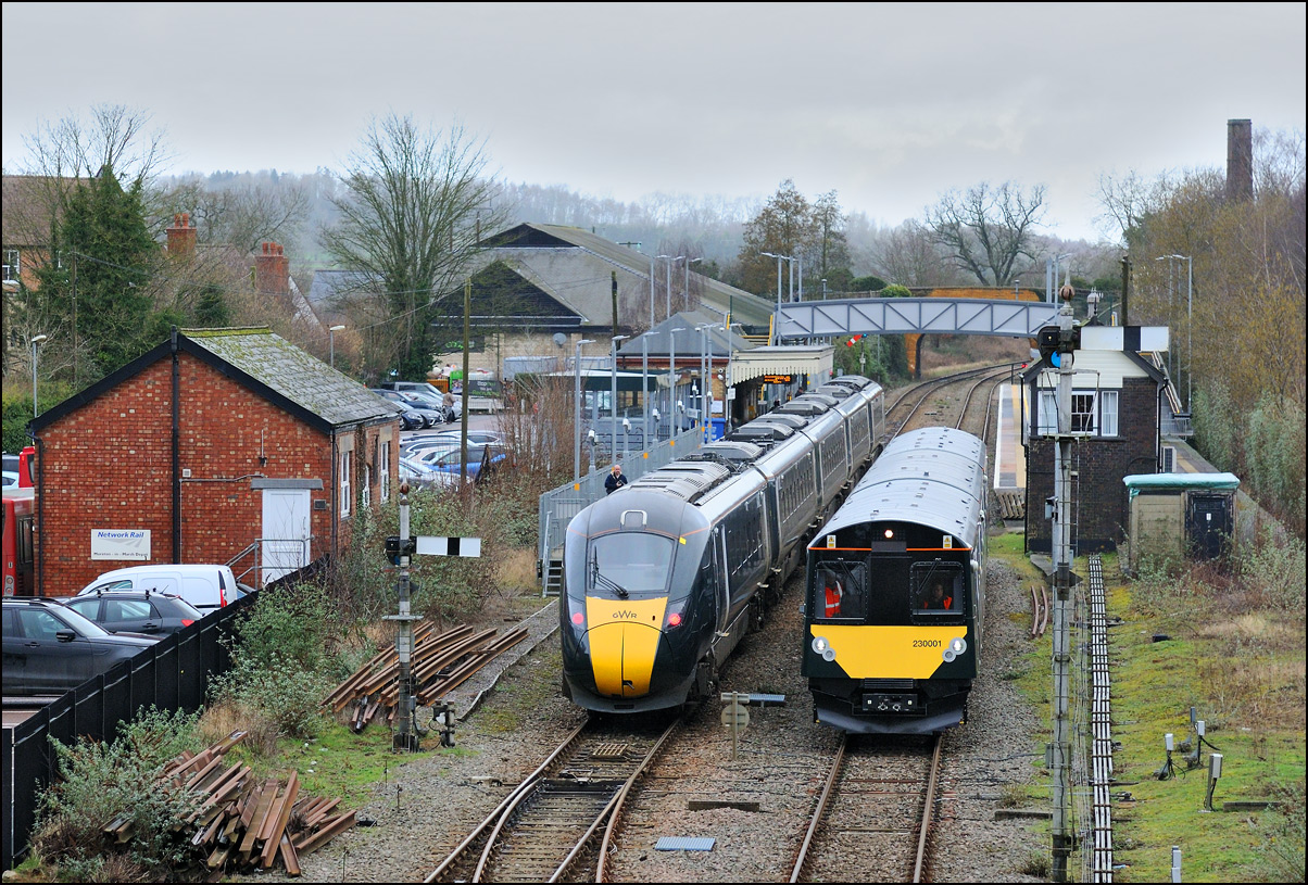 This is the view from the station footbridge, also a public footpath to the town from a nearby park and housing estate, looking south as 230001 stopped by the GWR signalbox waiting for the road to run forward and cross over to the down line. The signal on the right is a relatively recent addition used for any down trains terminating here before returning to London Paddington. |