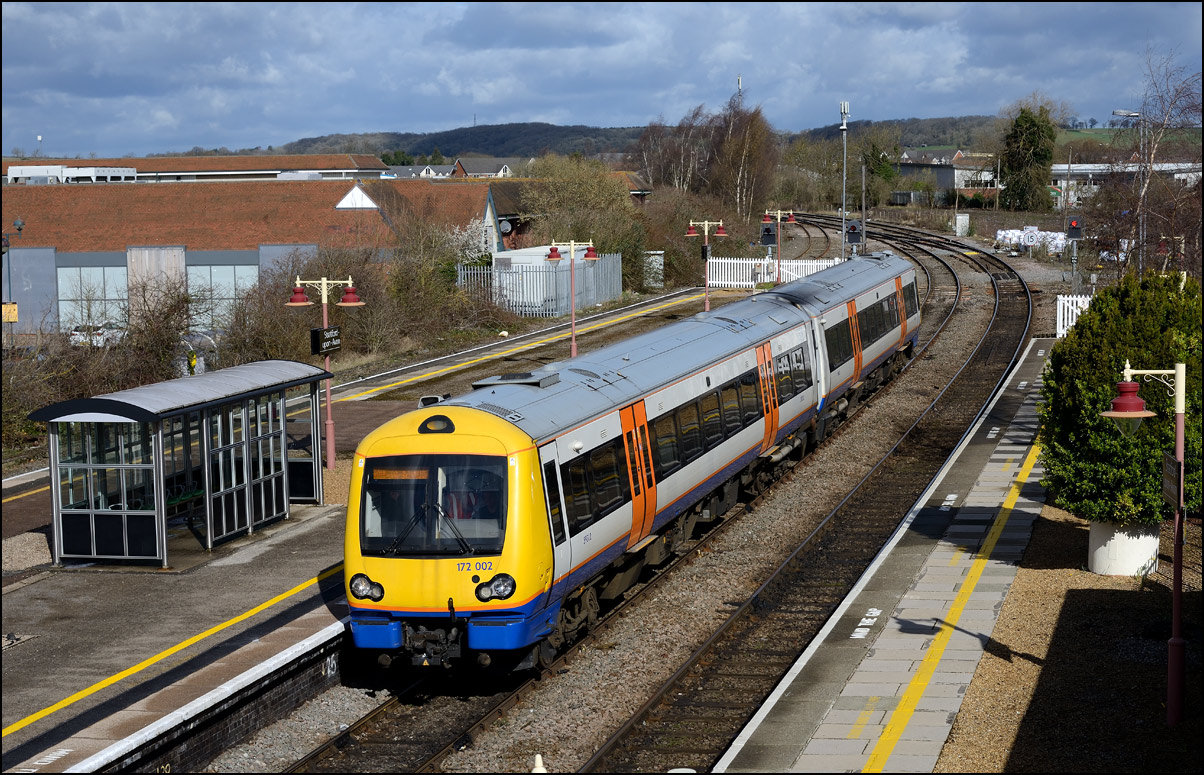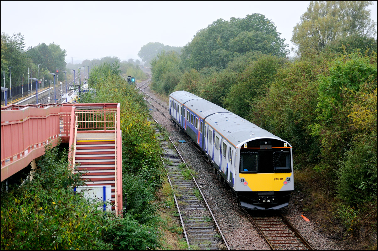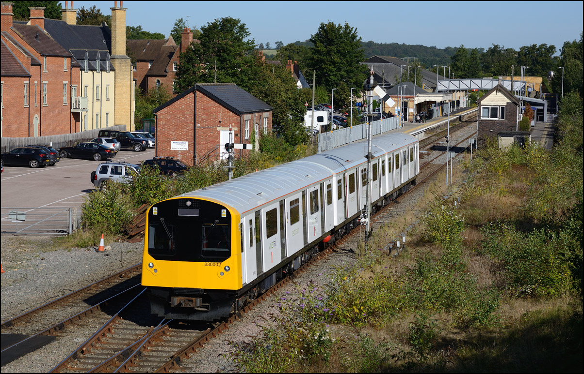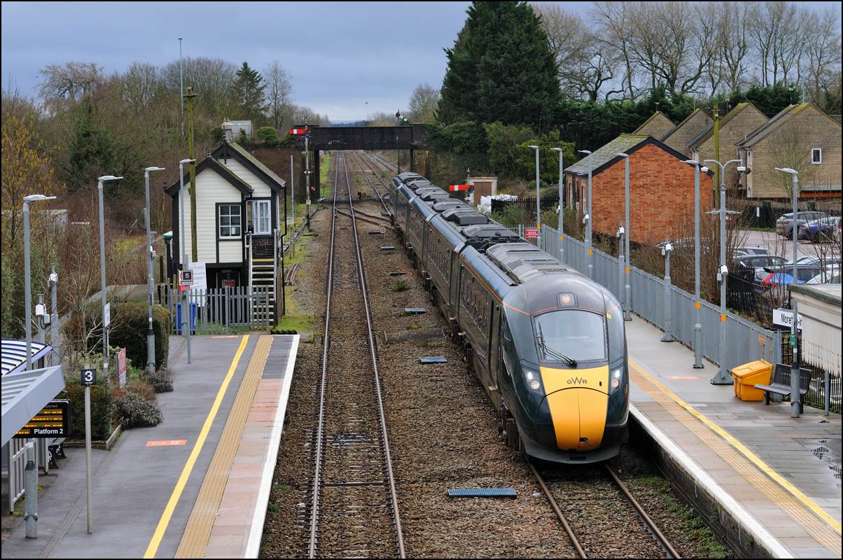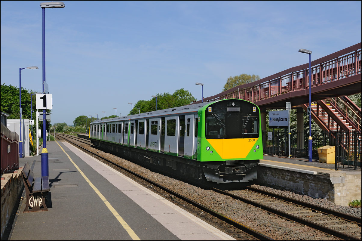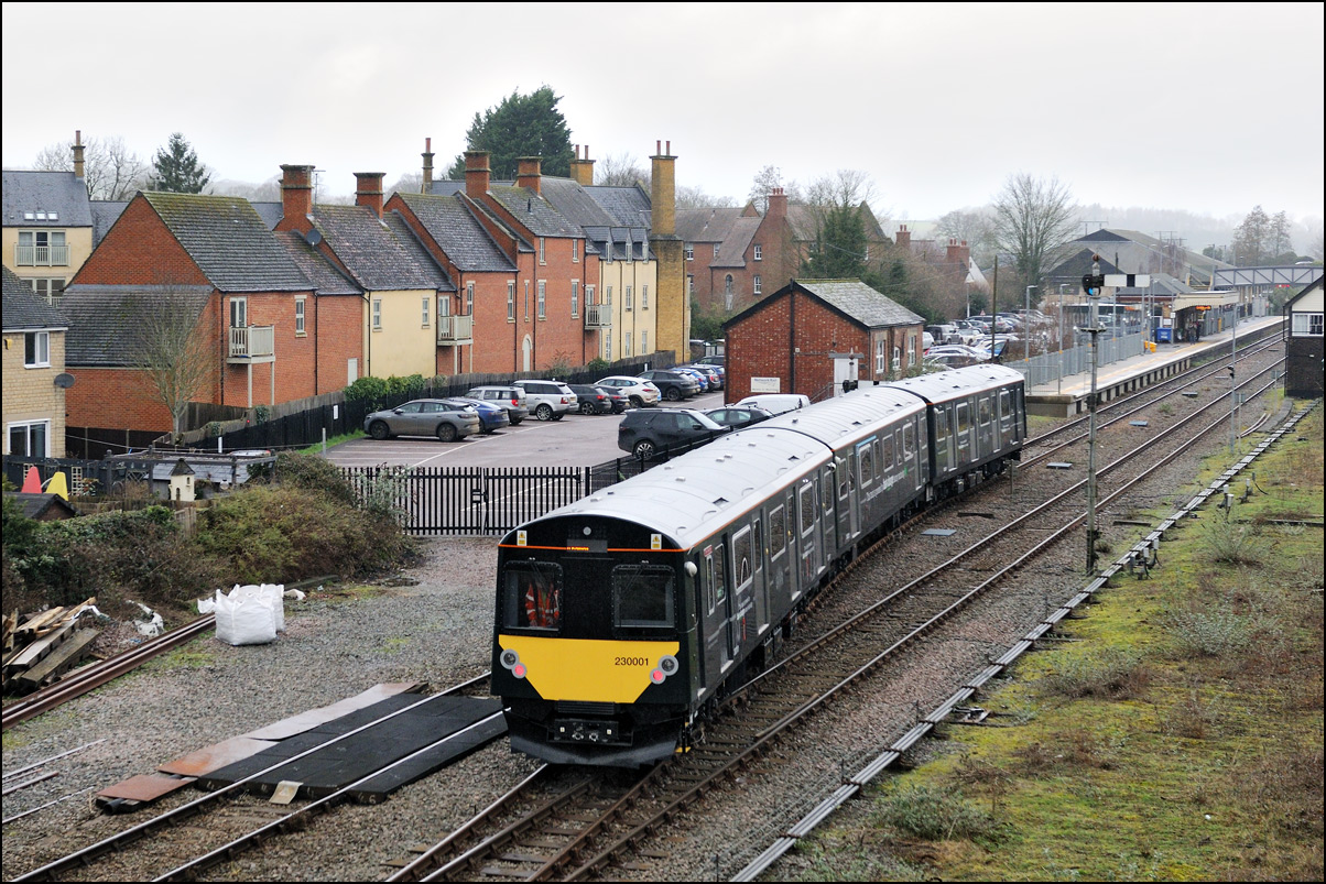 This is the view from the station footbridge, also a public footpath to the town from a nearby park and housing estate, looking south as 230001 stopped by the GWR signalbox waiting for the road to run forward and cross over to the down line. The signal on the right is a relatively recent addition used for any down trains terminating here before returning to London Paddington. |