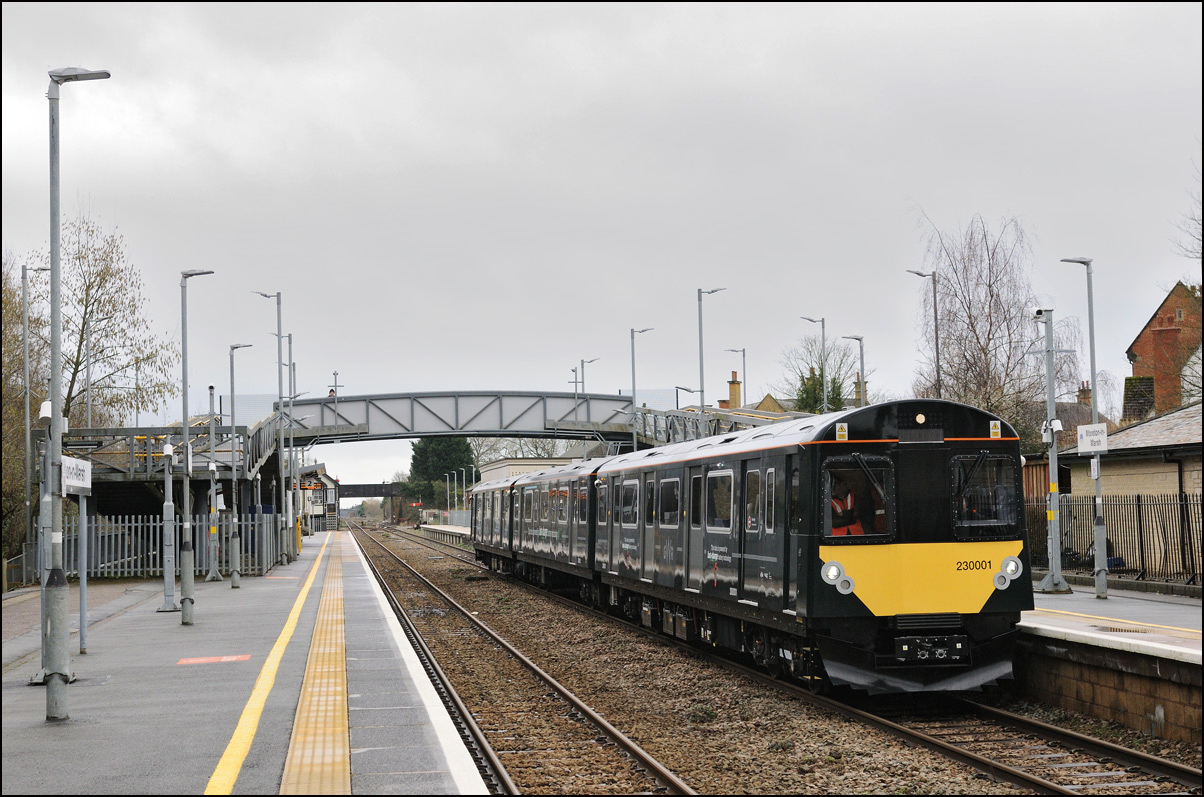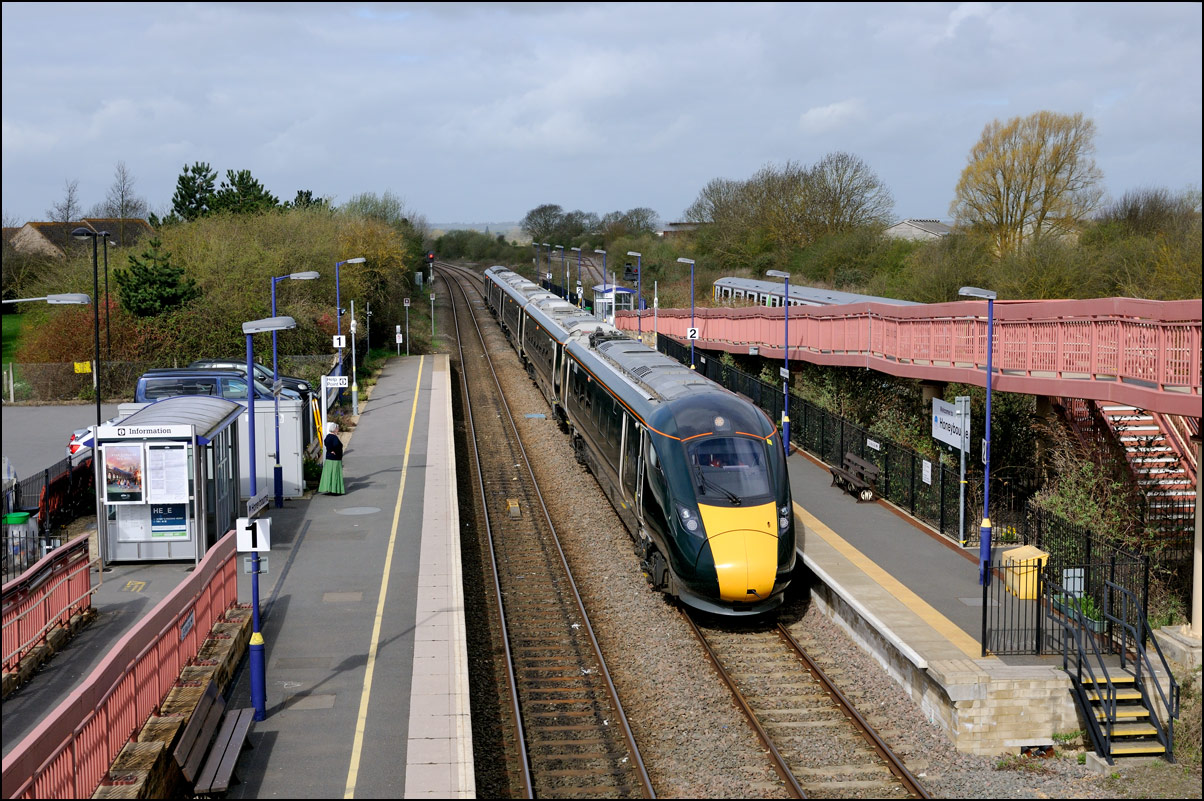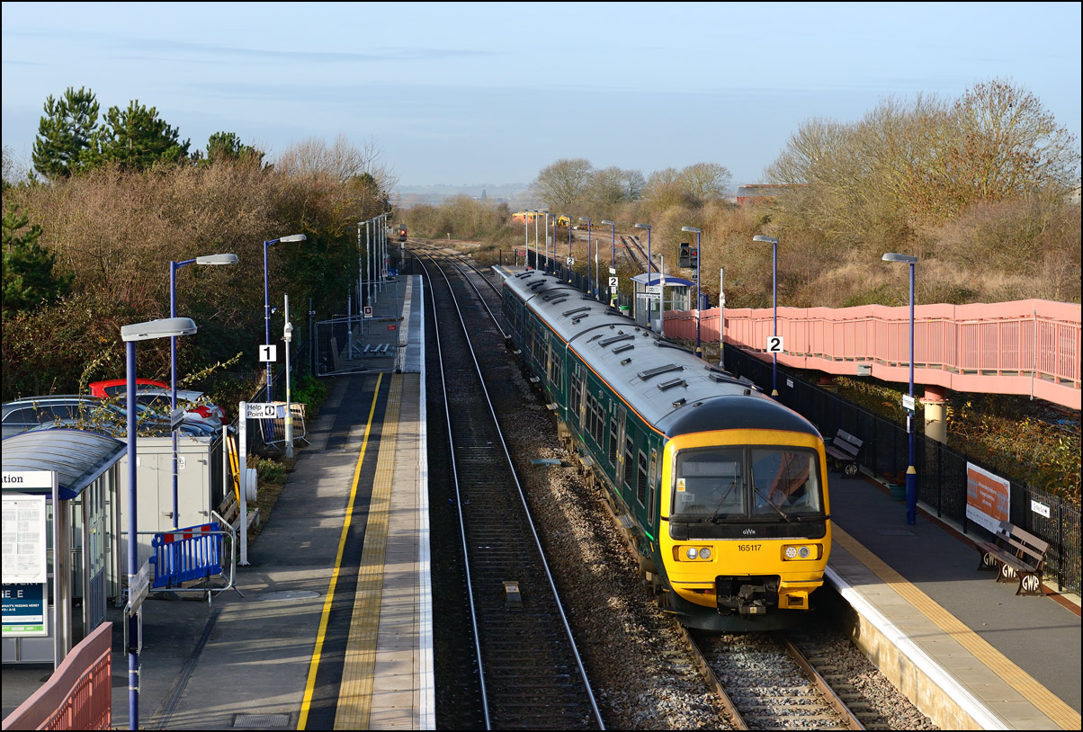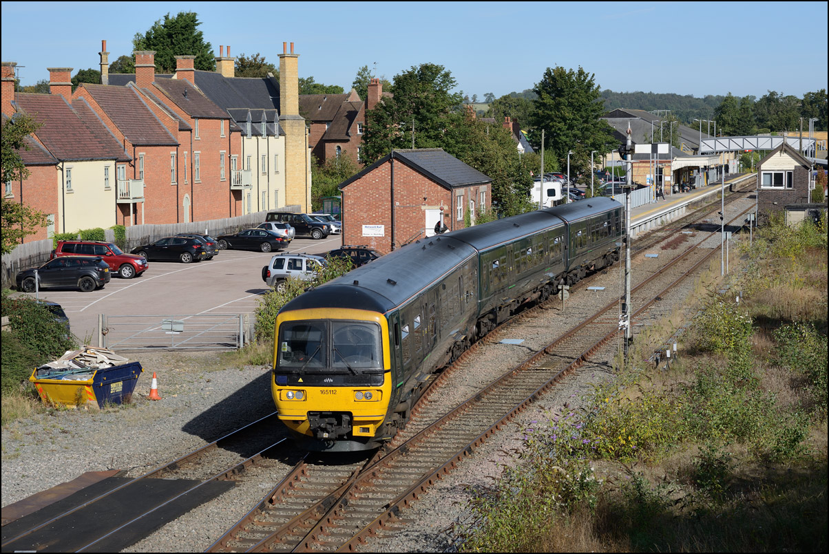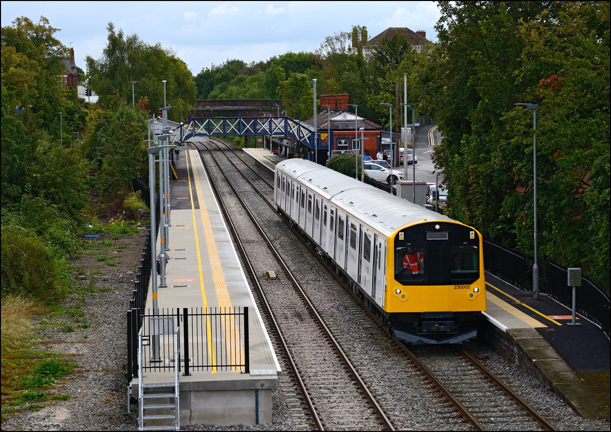 This is the view from the station footbridge, also a public footpath to the town from a nearby park and housing estate, looking south as 230001 stopped by the GWR signalbox waiting for the road to run forward and cross over to the down line. The signal on the right is a relatively recent addition used for any down trains terminating here before returning to London Paddington. |
