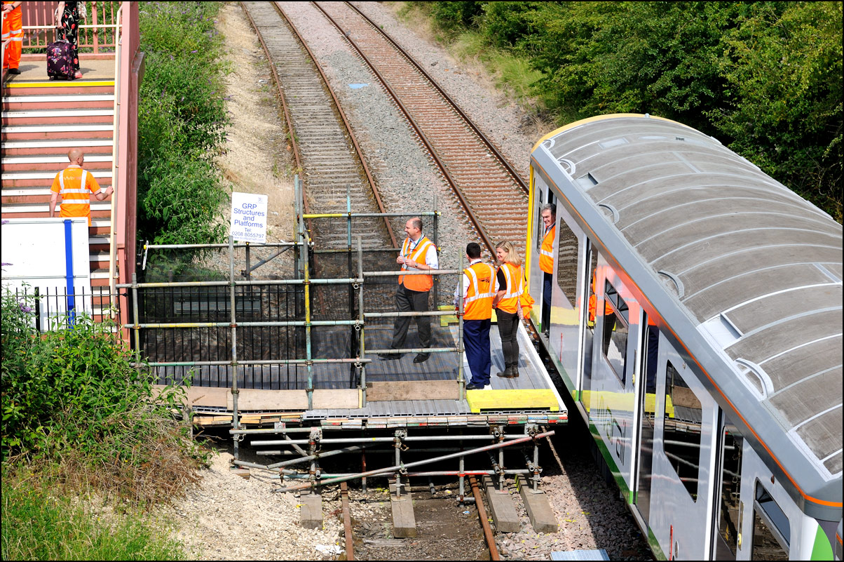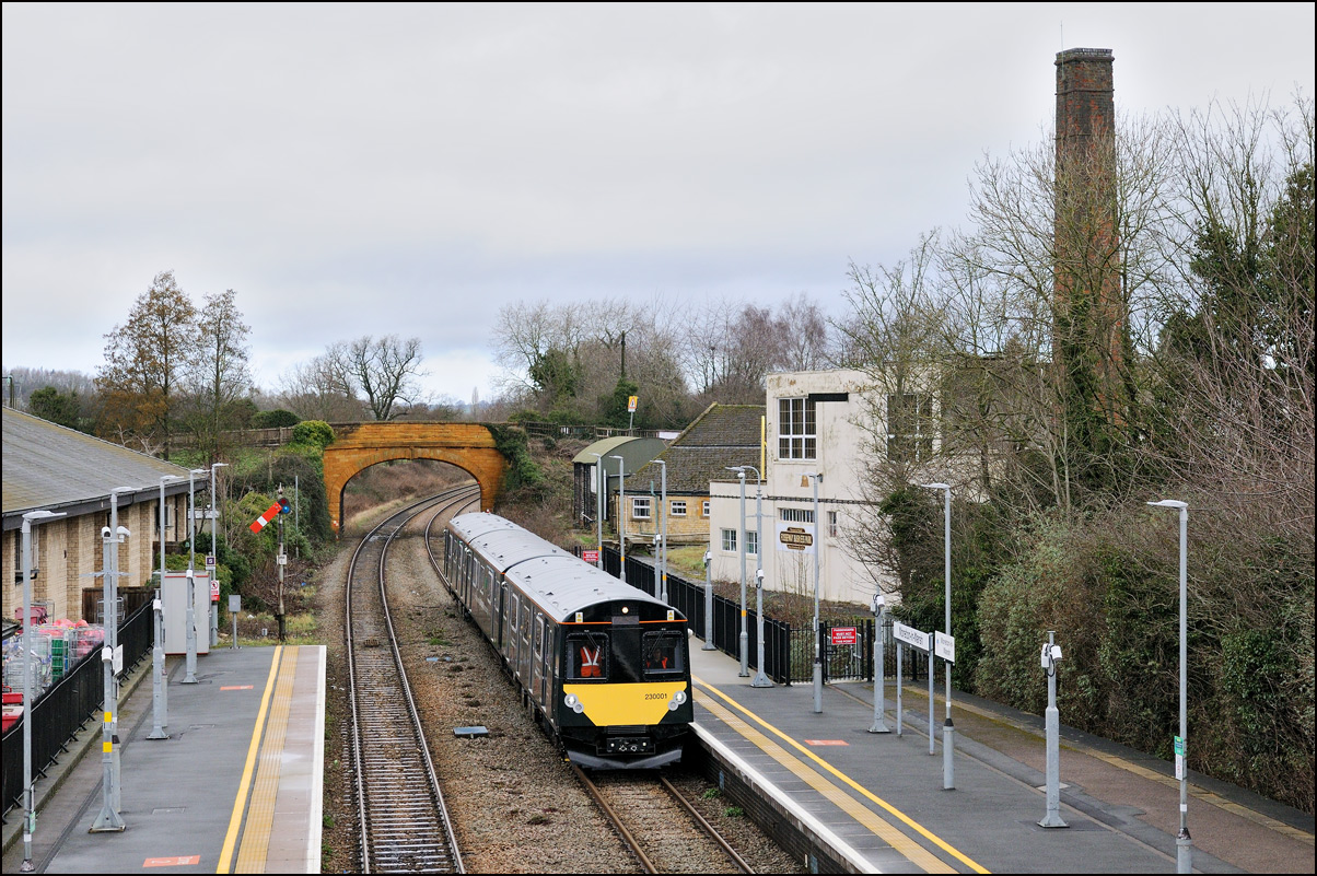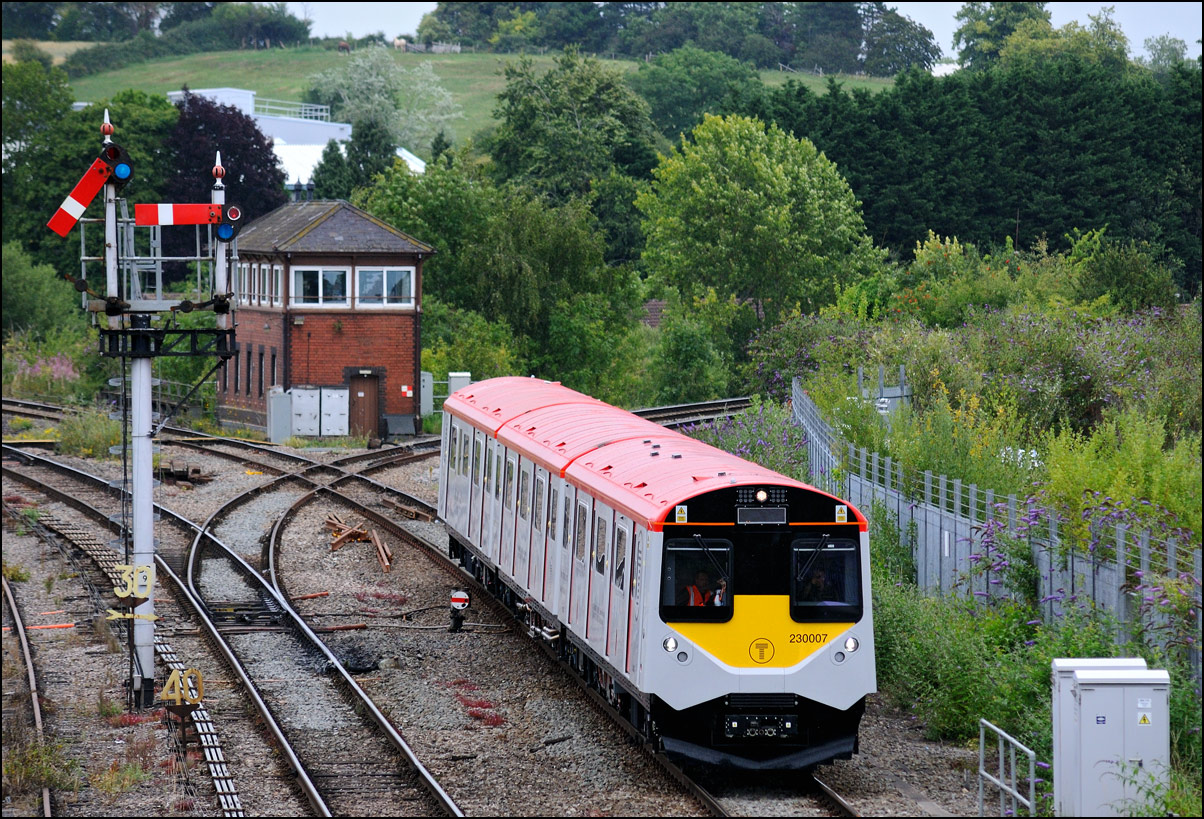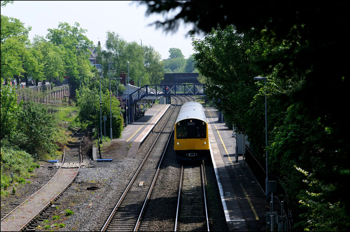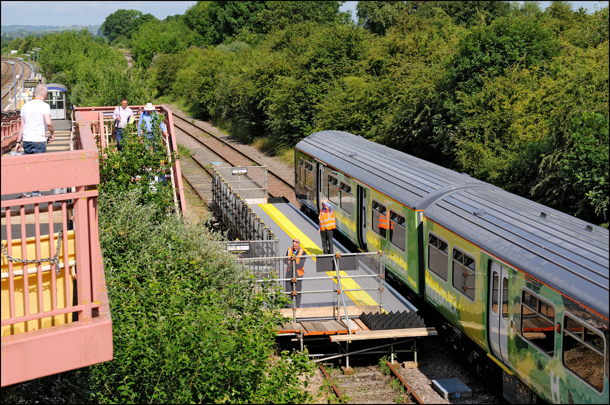 This is the view from the station footbridge, also a public footpath to the town from a nearby park and housing estate, looking south as 230001 stopped by the GWR signalbox waiting for the road to run forward and cross over to the down line. The signal on the right is a relatively recent addition used for any down trains terminating here before returning to London Paddington. |