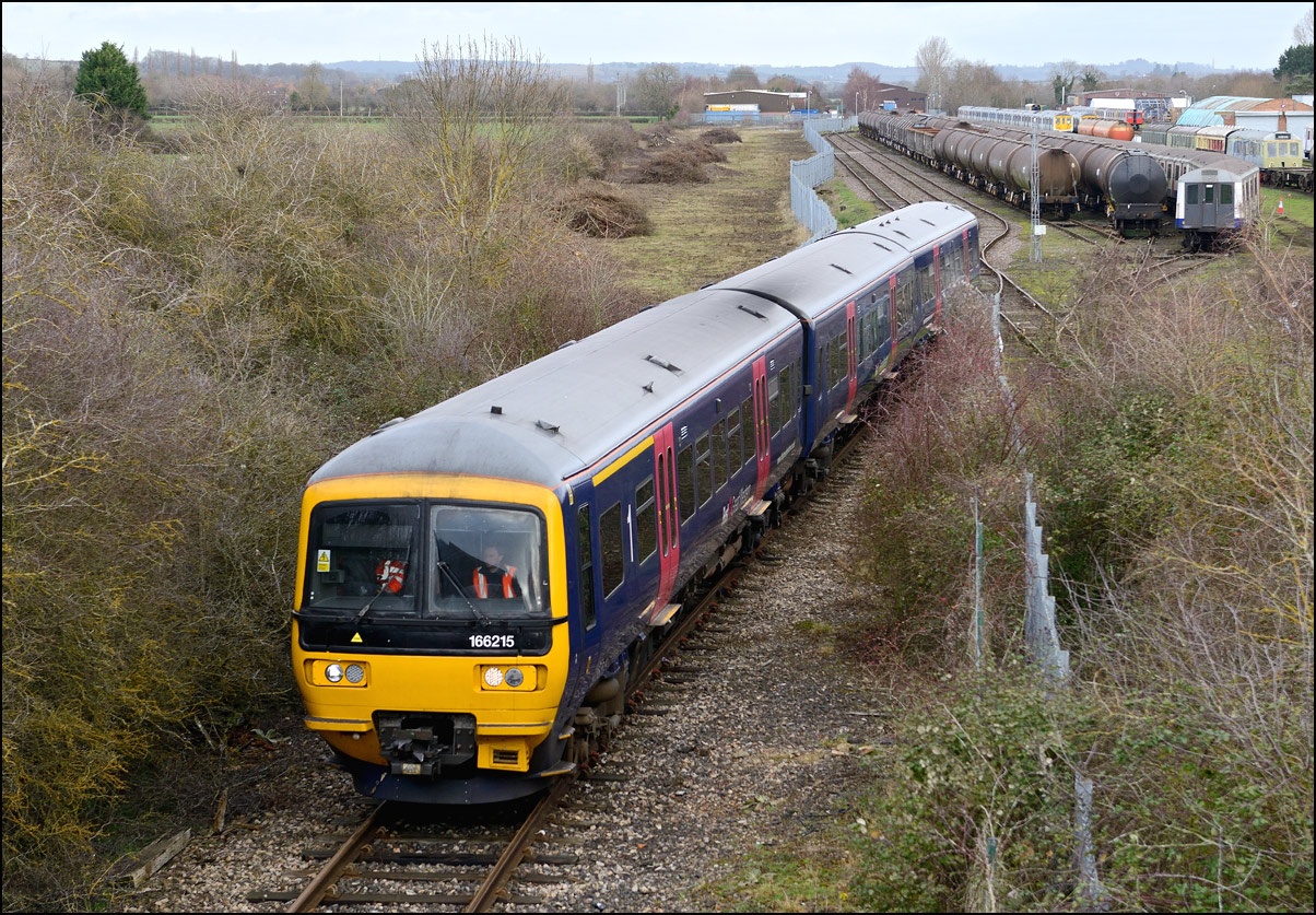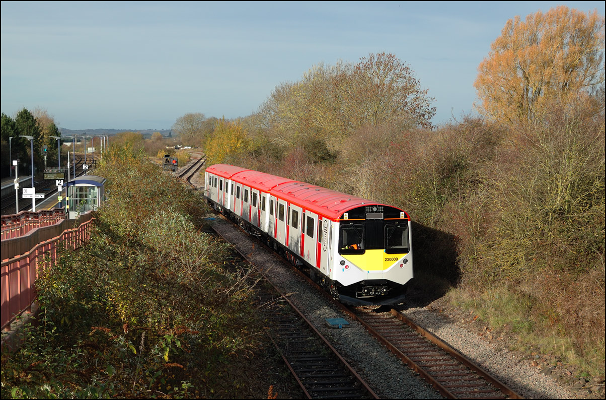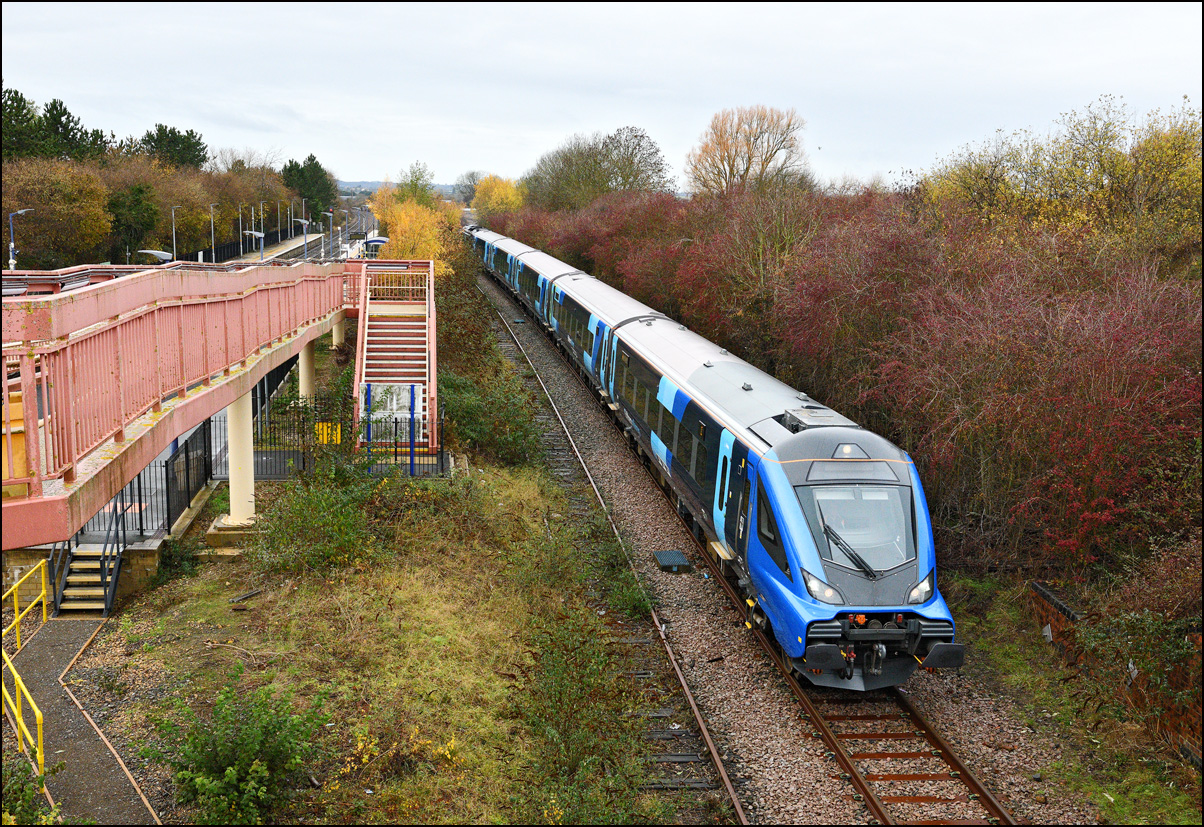 Two more class 196 DMUs went from Tyseley to Long Marston for rectification or maintenance on Wednesday 20 November 2024. For the first time the units, 196006 + 196004, worked under their own power over the North Cotswold Line as 5Q94 rather than running as 7Q or 8Q as before and being expensively and inefficiently dragged by either ROG or GBRf locomotives. This clearly wasn't as attractive to photographers but I wanted a picture to record the first solo run over the line. It was desirable to have the image from a location that made it obvious that the train was on the North Cotswold Line and one of the few on a sunny day in the winter is this one as it approaches Evesham station. I checked out the station itself and the roadbridge at the other end but neither were much good. As is often the case the train left Tyseley LMD late but with two lengthy pauses scheduled and missed out, at Cofton Junction and Worcester Yard respectively, it was back on time by Norton Junction. My video film is here. I have a few pictures of 196006 when it on was test and crew training runs at Stratford-upon-Avon, most notably this one with 66587 in shot while on route learning runs for the short-lived locomotive-hauled RHTTs in 2021. |