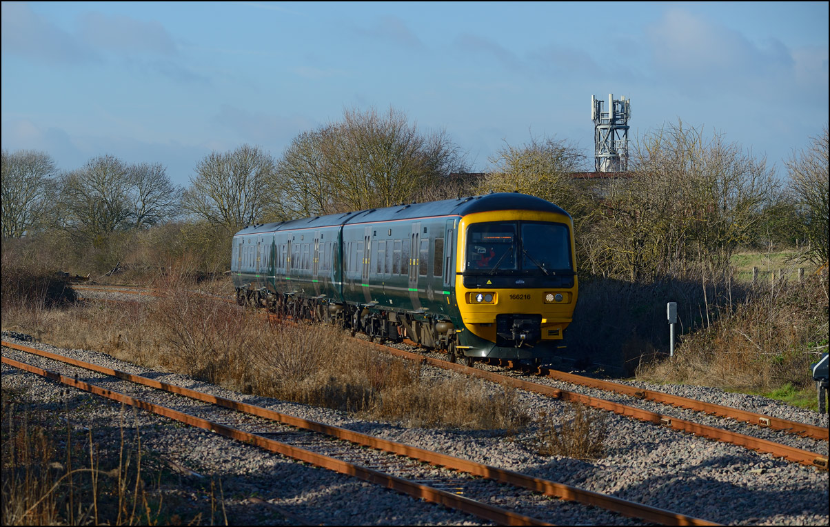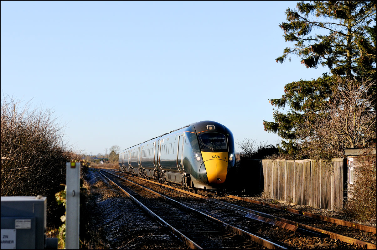 There were 3 trains on the Long Marston branch on Friday 3 January 2025, usually a recipe for Mr Cock-Up to pay a visit. The second movement was a London Midlands class 196 from Tyseley to Long Marston and I moved over to Clayfield Lane crossing for this one. It's hard to avoid taking shots of the routine traffic in good light and here is 800034 approaching the crossing with 1P26, the 10.59 Great Malvern to Paddington GWR service. There were still quite a few shadows closer to the camera but the sun was getting a bit higher in the sky ready for the next train. |