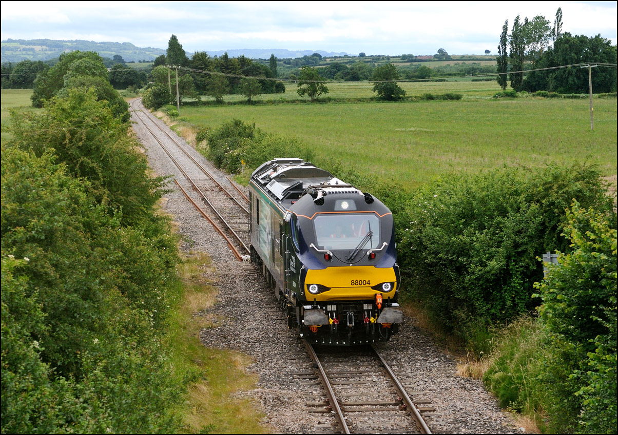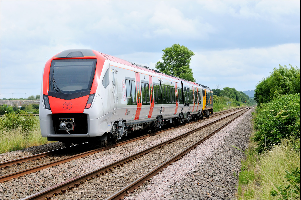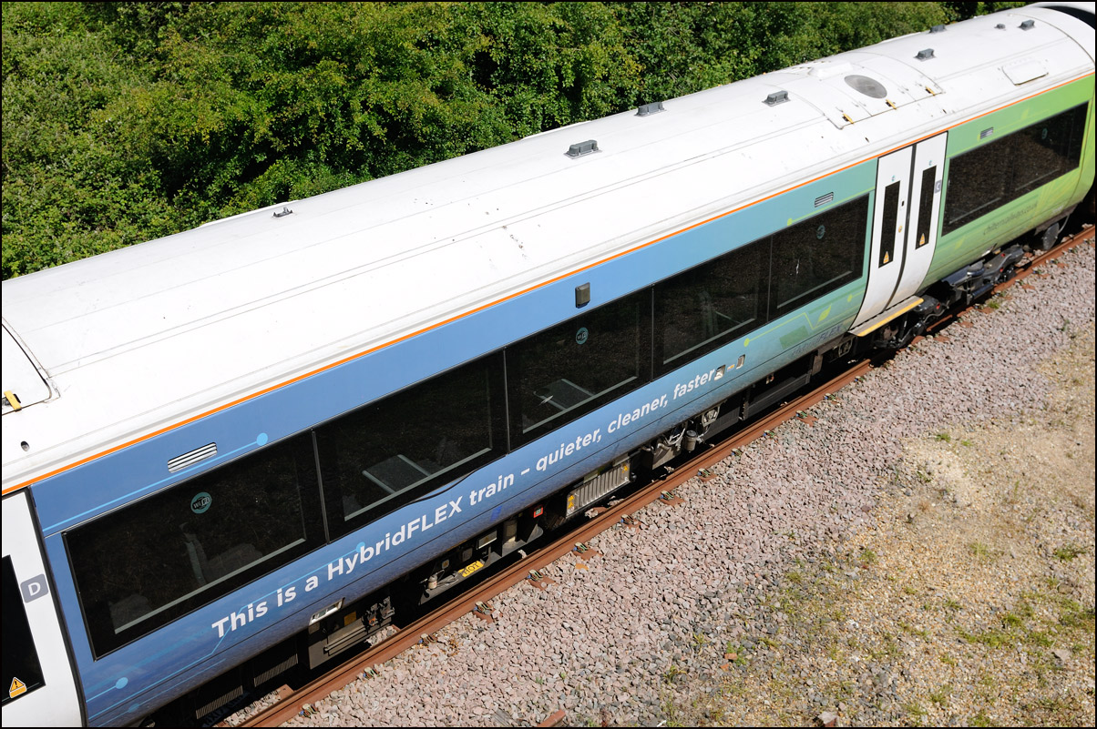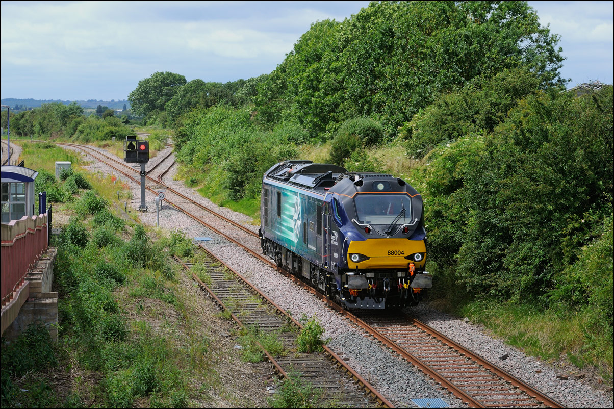 The prototype hydrogen-powered unit 799201, formerly a class 119, has seen quite a bit of testing recently. On Thursday 25 July 2024 it made a single return run from Long Marston to Barnt Green and I arrived at Lower Moor in time for this shot of running a 5Q88 and about 10 early. It appears to have been reliable in recent times but ROG sent 37884 to Worcester Shrub Hill to act as a standby thunderbird just in case. I didn't bother with a video clip as there was nothing but a bit of rail noise as it went by. |