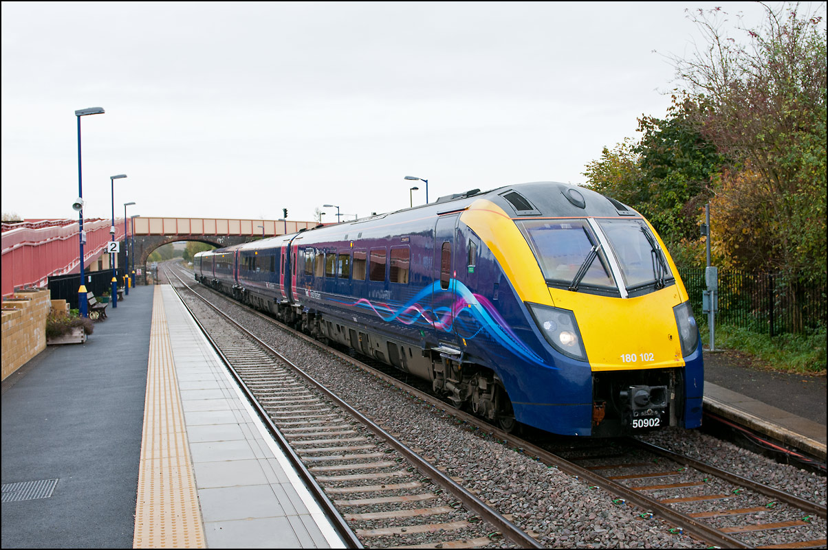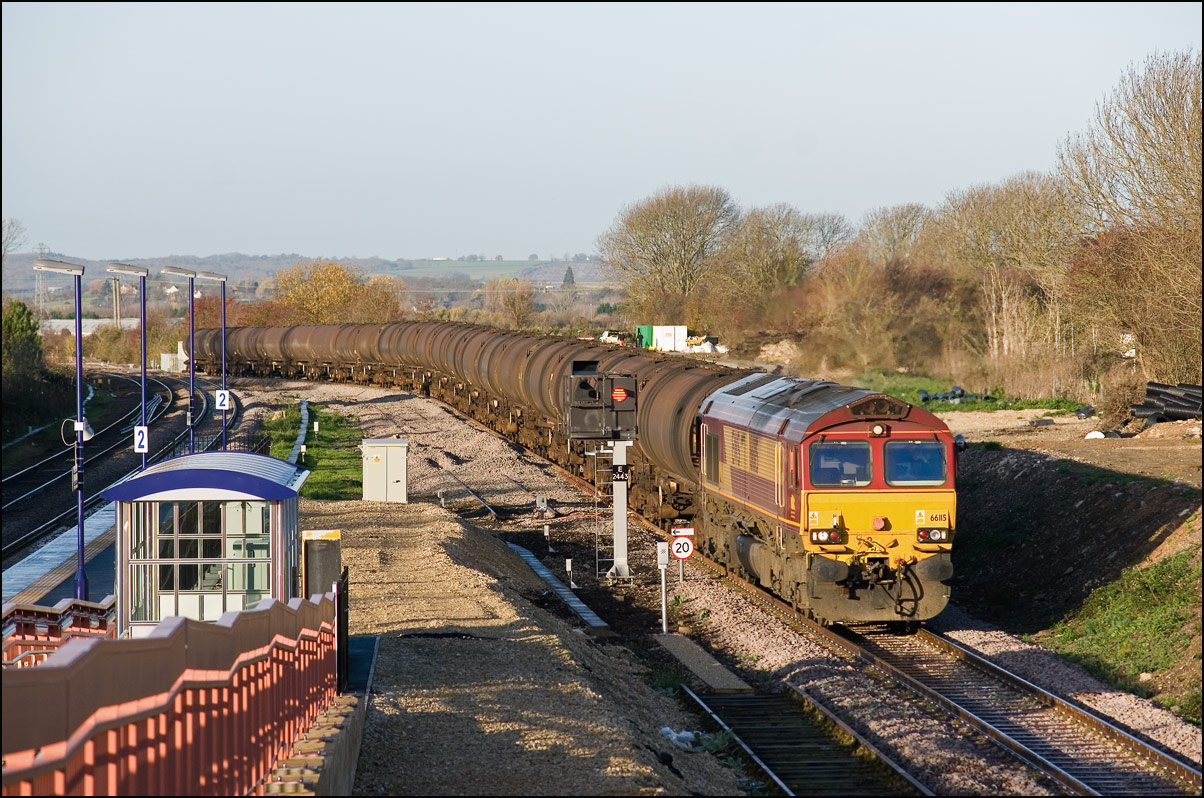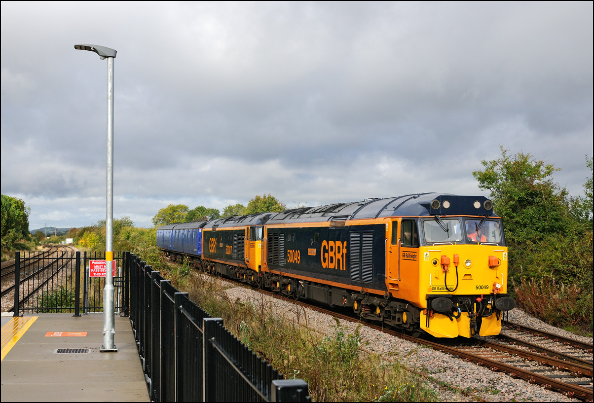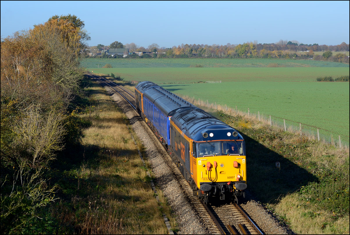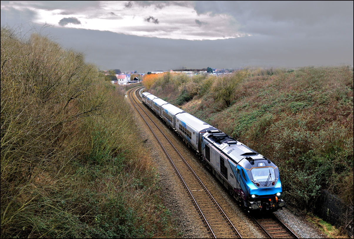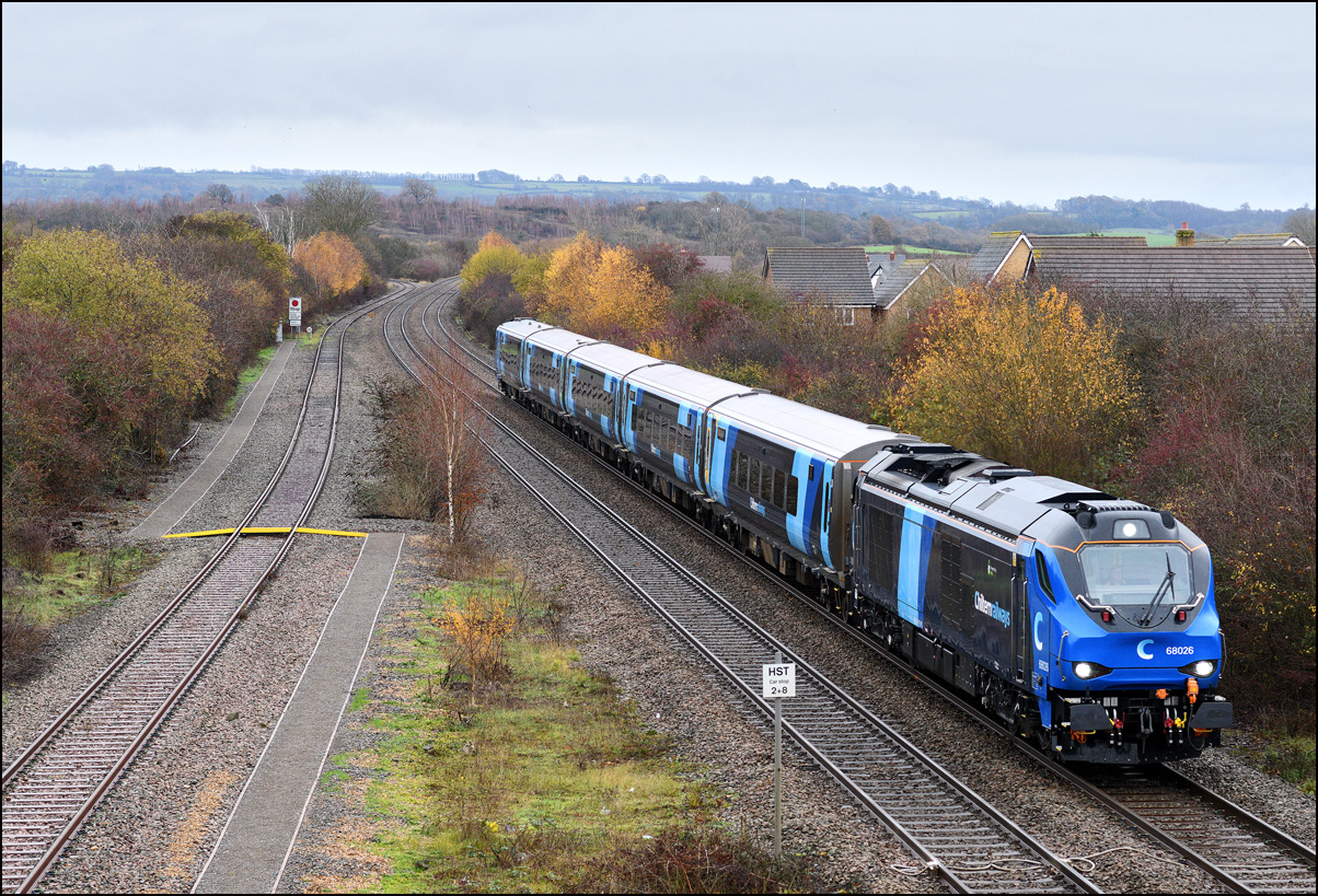 As this was my first sighting of a class 68 in the new Chiltern colour scheme I took a third shot at Honeybourne on 4 December 2025 as the DVT led the Mk5 set to the stop board visible on the left of the Long Marston line. The autumnal colours are still quite intense here even if poor light but had the sun been out it would have been in wrong place and casting heavy shadows over most of the scene. Note the walkway and and foot crossing under the 2nd coach that was installed earlier in the year to provide a safe route for railway staff to access the token hut from Honeybourne station. |