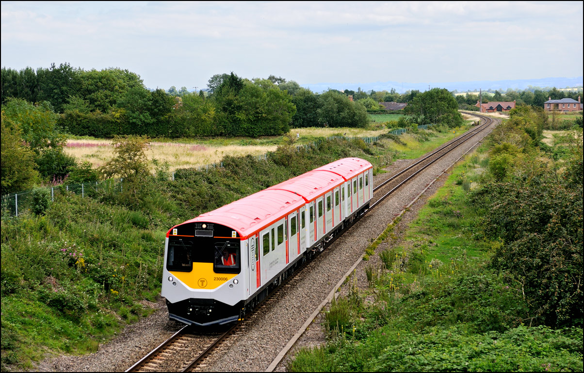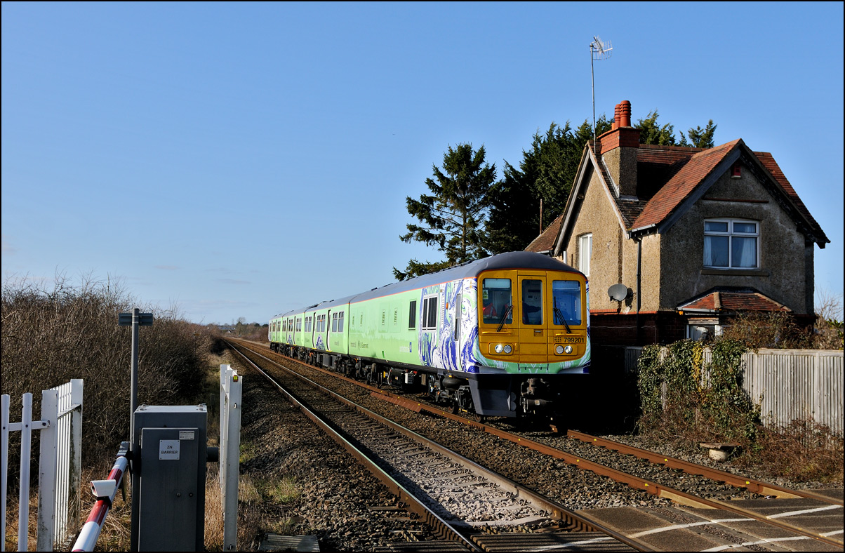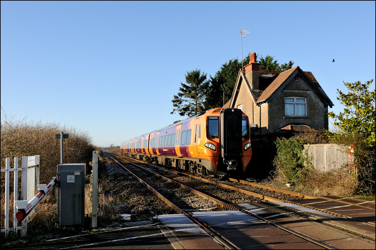 The London Midland class 196 DMUs are gradually going from Tyseley to Long Marston for modifications to the wiring in the heaters in the lavatories and new brackets on the bogies. Should these really be needed on brand new trains? The first few were wastefully and expensively taken in by topped-and-tailed locomotives at very low speed because through braking was not possible but sense later prevailed and more recent moves have been with the units going under their own power. Here is 196103 passing the former Crossing Keeper's cottage on Clayfield Lane at high speed as a common buzzard circles above the fields in the background. |